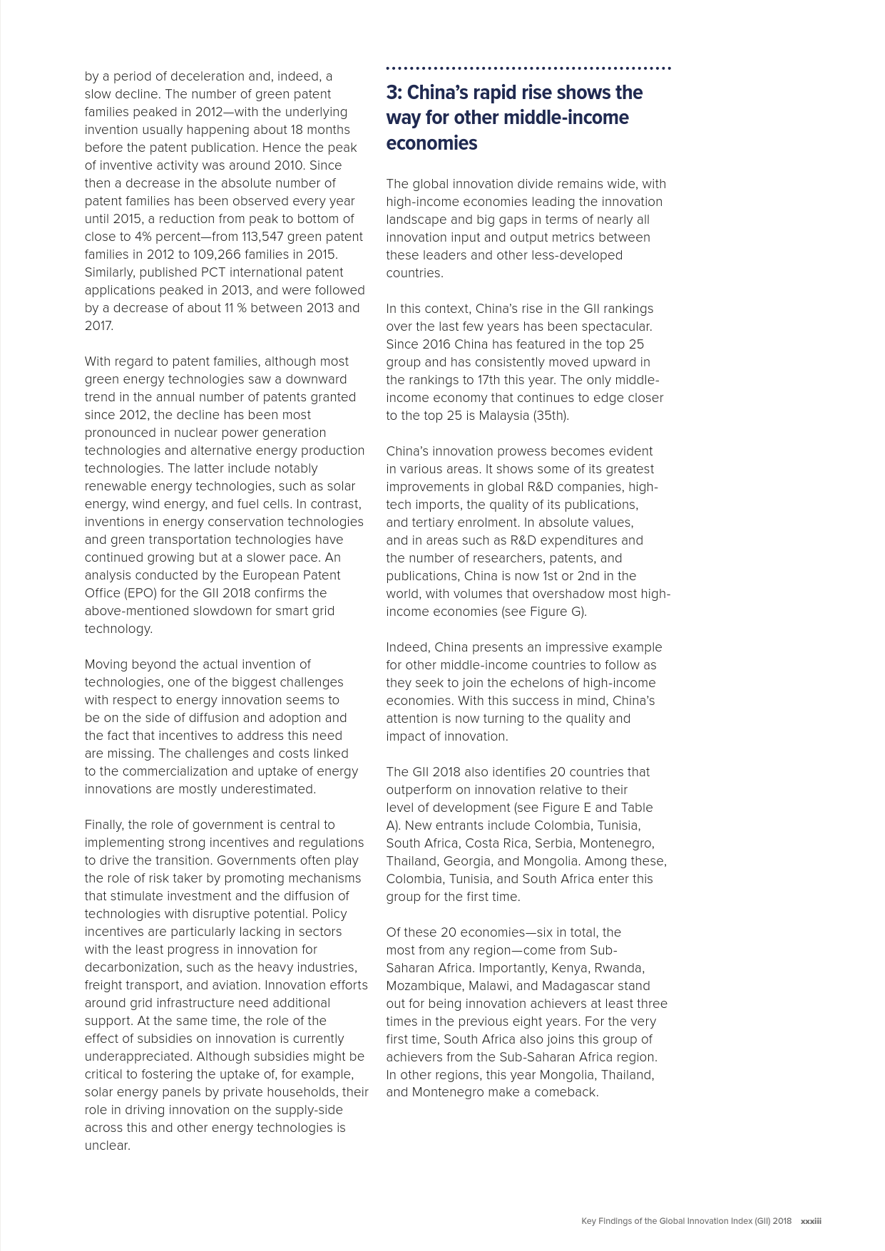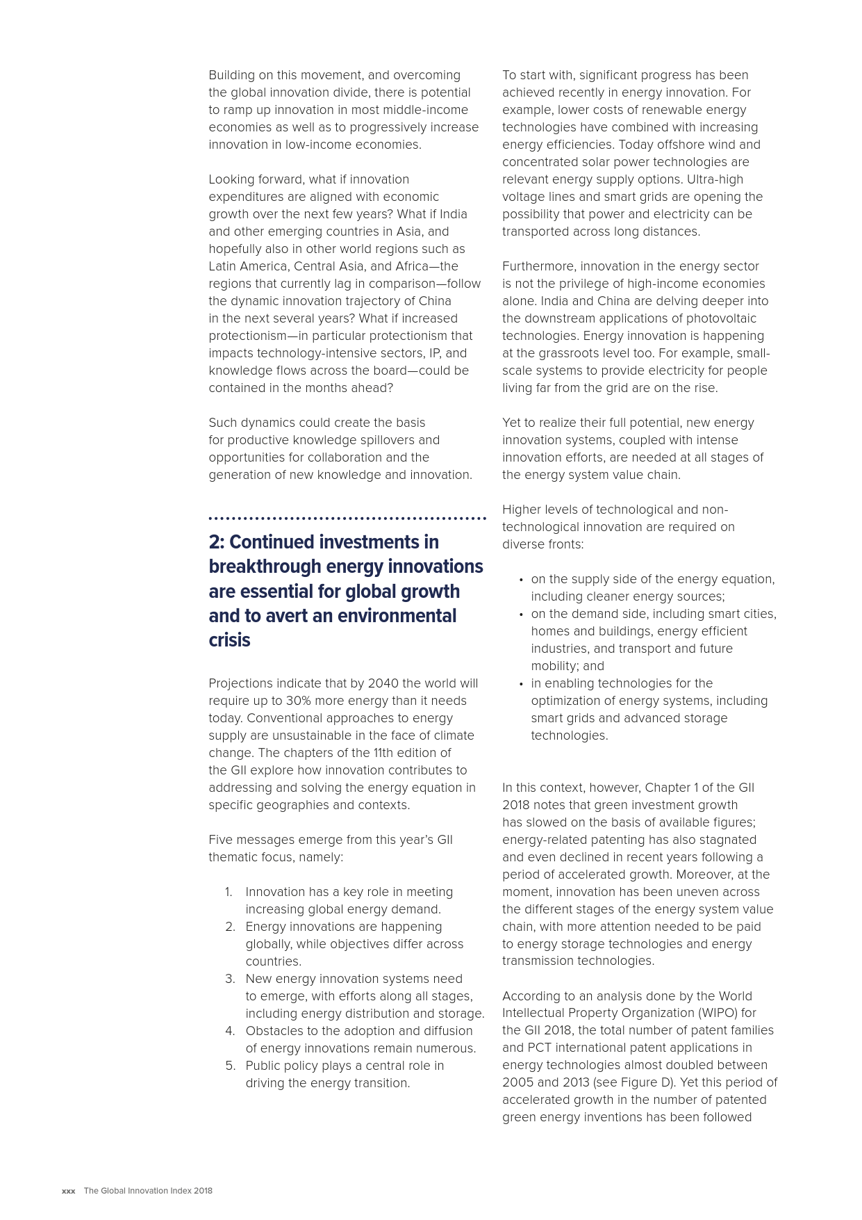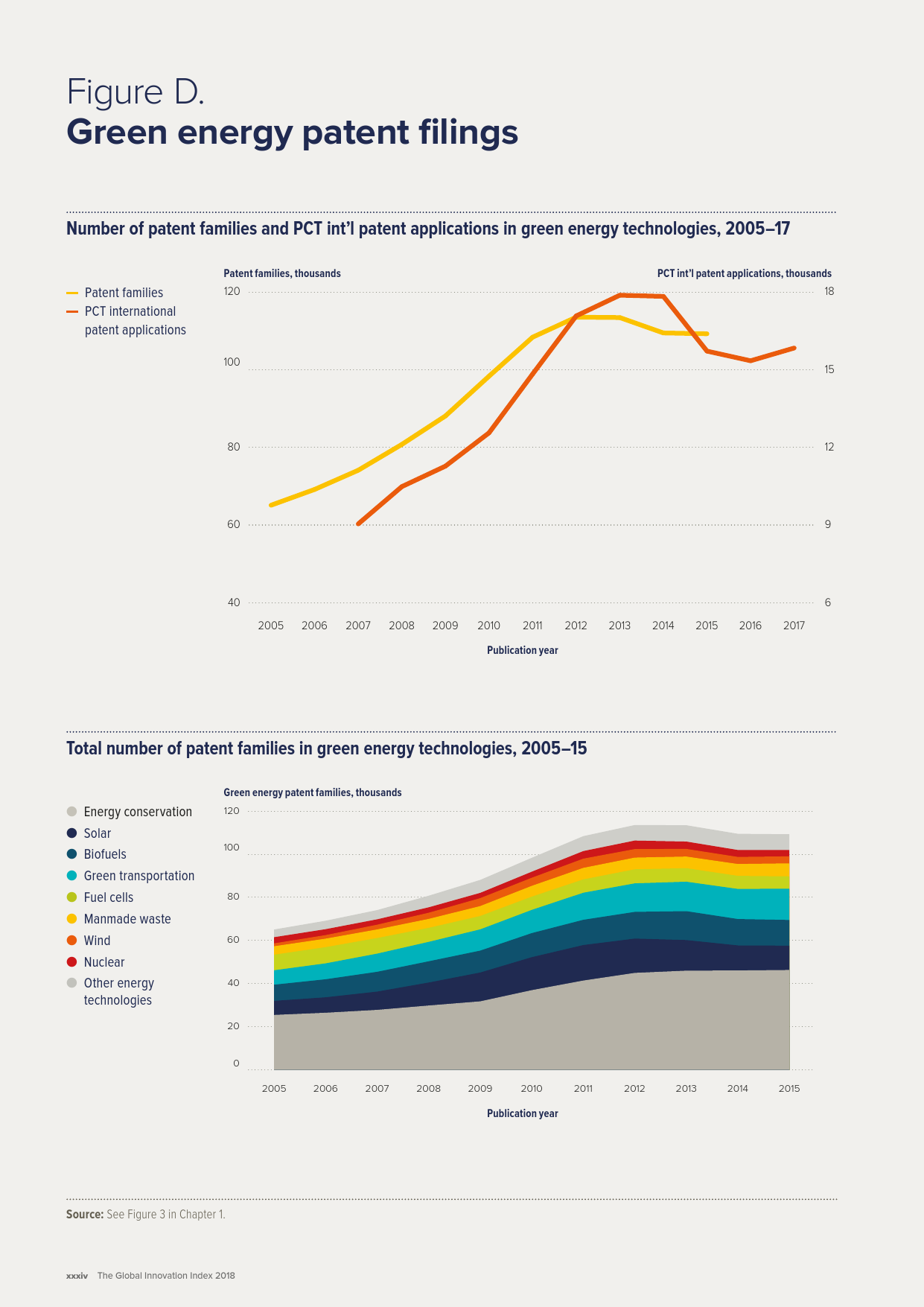 2018年版全球创新指数的主题是“世界能源,创新为要”,研究了在全球能源需求不断上升的情况下,在气候友好型绿色技术方面拓宽创新性工作的必要性。预测表明,到2040年,世界对能源的需求要比现在高出多达30%,而面临气候变化,依靠扩大能源供应的传统做法是不可持续的。