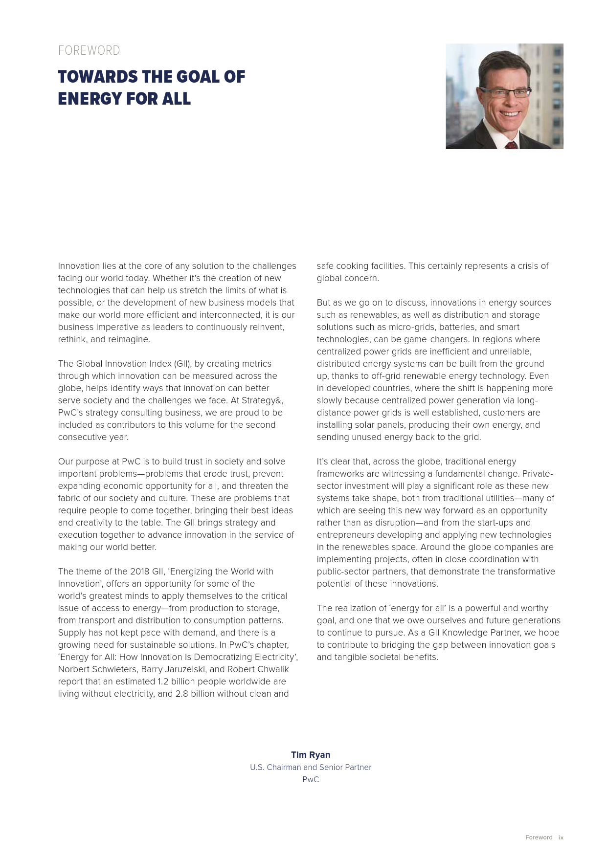 “就能源部门而言,创新对各公司的战略都至关重要。负责能源的高管已充分意识到他们所面临的根本变化,公司利用新型能源和分配技术进行创新的程度,决定着它在转型过程中的生死存亡。未来几十年,这一市场将不断发展变化。我们的研究表明,随着可再生能源变得更加可行,电力产业有可能成为创新的宝库,”全球创新指数知识伙伴之一、普华永道战略咨询业务思略特公司的主管巴里·雅鲁泽尔斯基说。