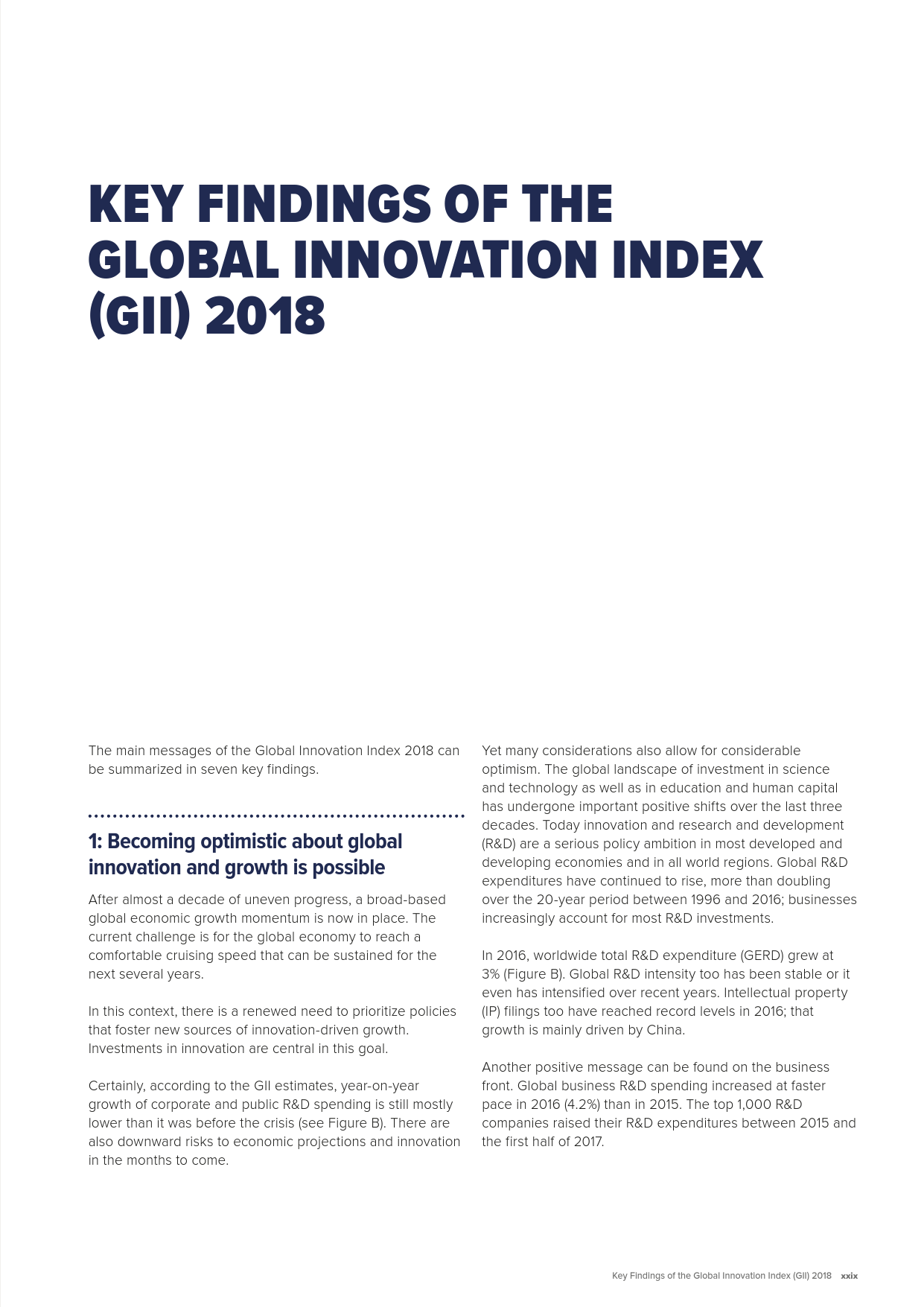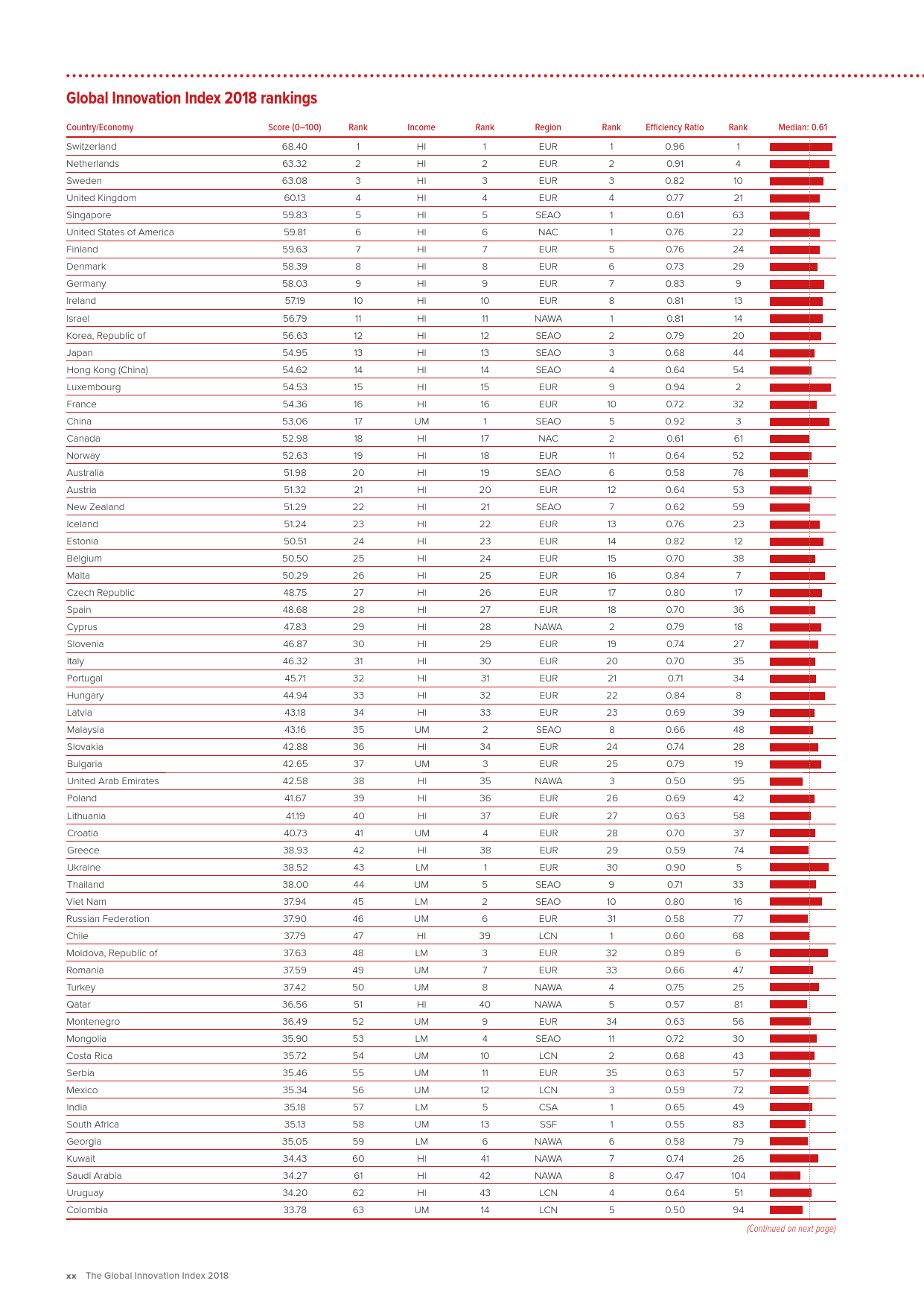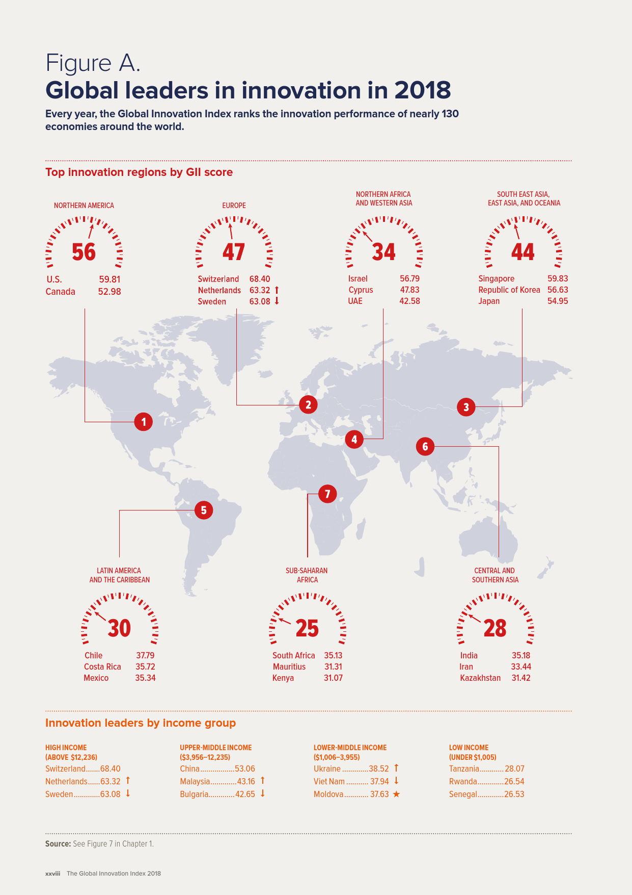瑞士连续第八年在全球创新指数中荣膺桂冠。它在多个专利和知识产权相关指标中都排在第一位,在高端及中高端技术生产方面排第二位,在研发支出和本地高校质量等方面名列前茅。