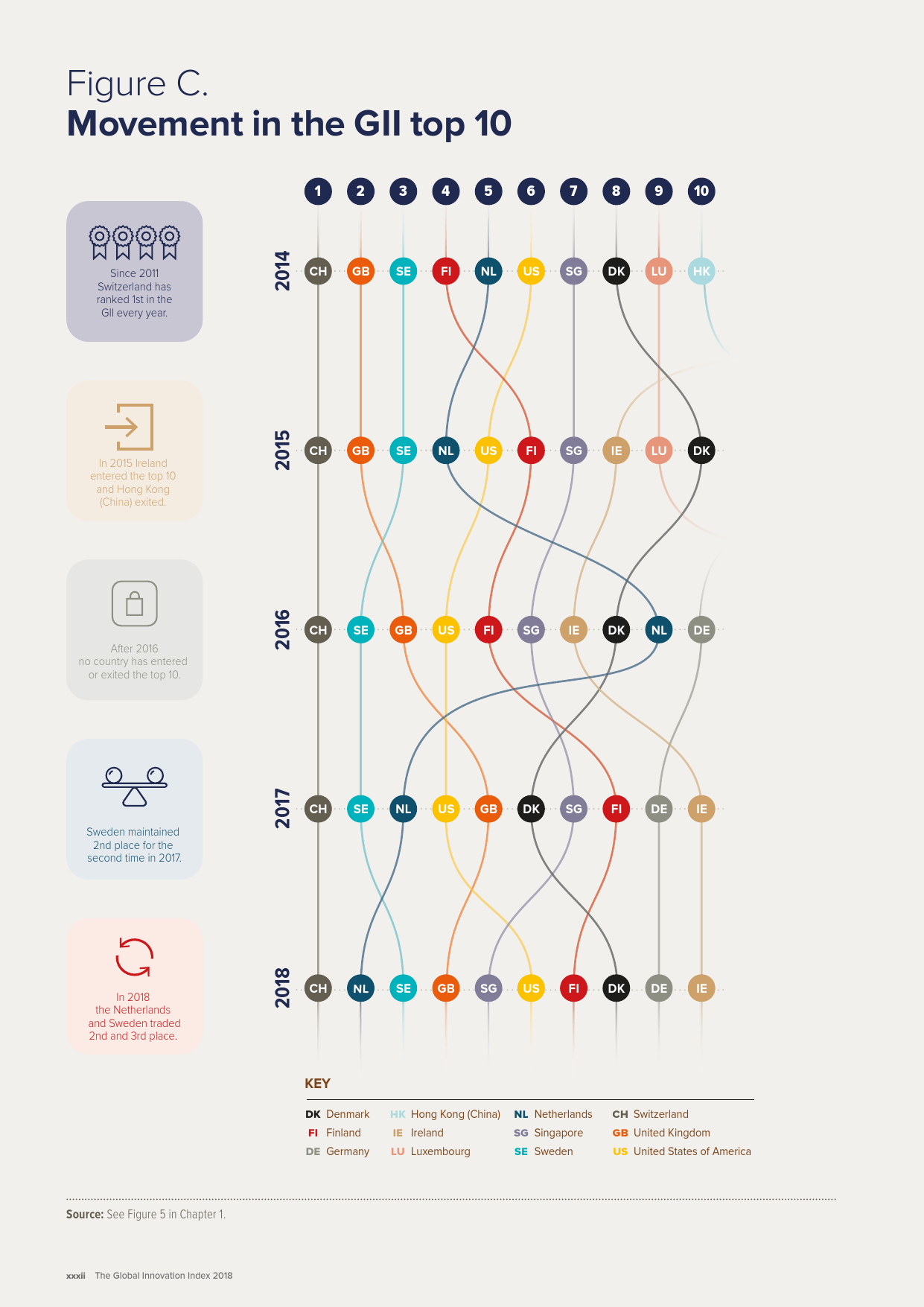 瑞典在全球排名第三。它在本国人通过产权组织《专利合作条约》(PCT)提交的专利申请中保持着第一的名次,在网络创意方面也有不俗表现。