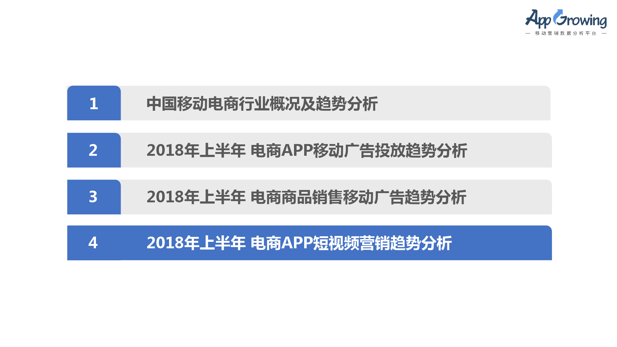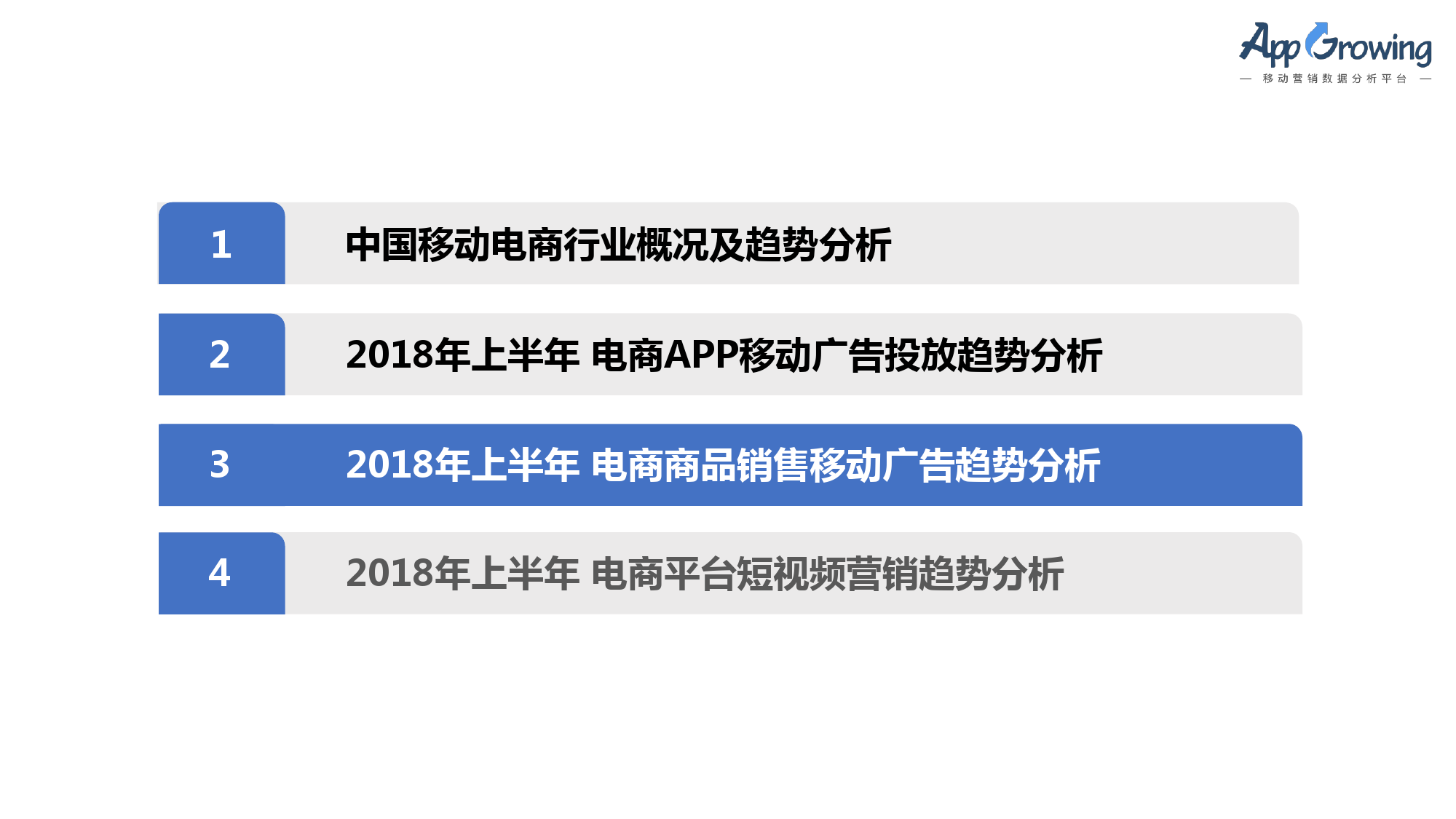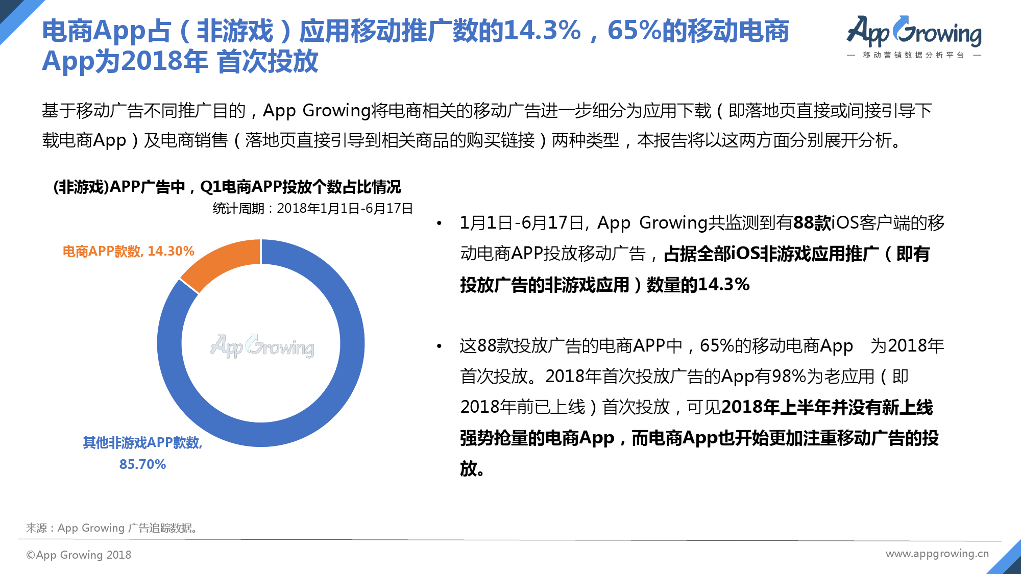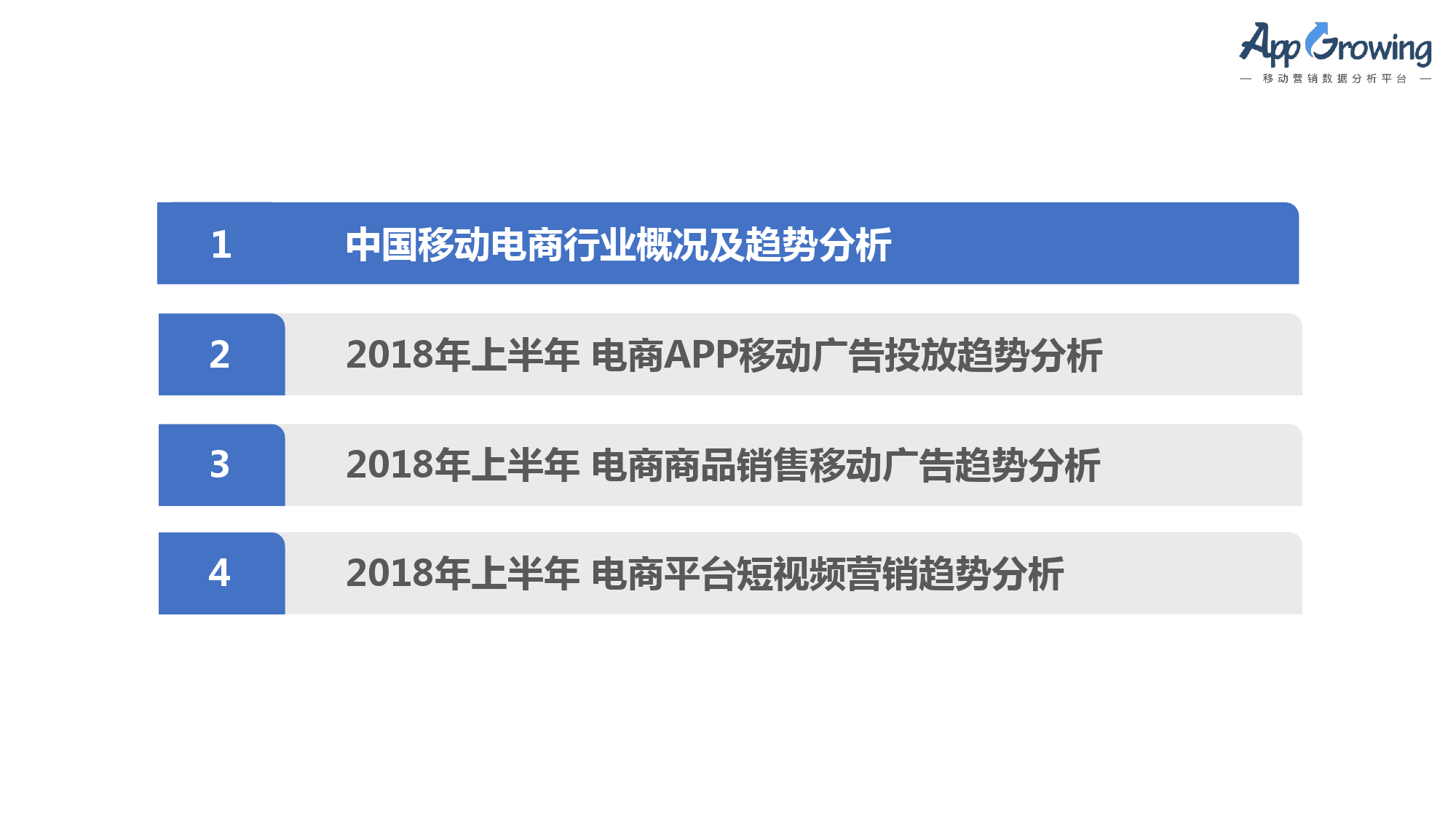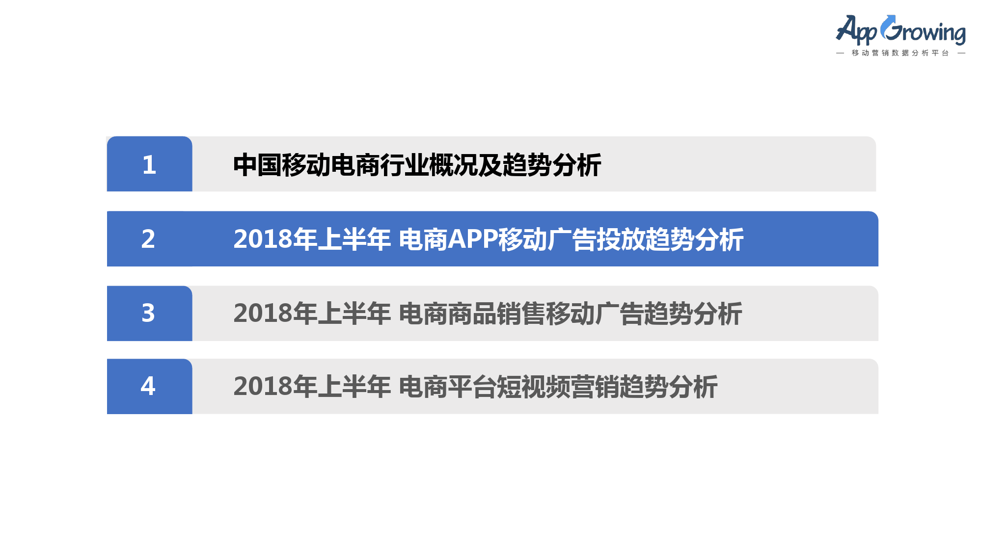 AppGrowing:2018年上半年移动电商营销分析报告 PDF版本将分享到199IT交流群,支持我们发展可加入! 更多阅读:AppGrowing:2018上半年移动电商营销分析报告AppGrowing:2023年Q1移动广告趋势洞察AppGrowing:2022上半年移动广告流量观察白皮书消费者品牌报告:寻找真相AppGrowing:2022年11月应用海外买量特征进行的分析AppGrowing:2023上半年全球手游买量报告AppGrowing、游戏葡萄、点点数据:2023年第一季度海外市场中重度手游买量观察AppGrowing:2022年Q1移动广告投放分析有米云AppGrowing&亿邦研究院:2021年上半年抖品牌营销白皮书AppGrowing:2019春节假期移动广告投放洞察Dr Augustine Fou:2014年网络广告虚假成份量化分析报告AppGrowing:2023年5月应用月报AppGrowing:2023年2月App买量洞察AppGrowing:2022年10月手游广告量前期呈下降趋势AppGrowing:2022年Q3移动广告趋势洞察