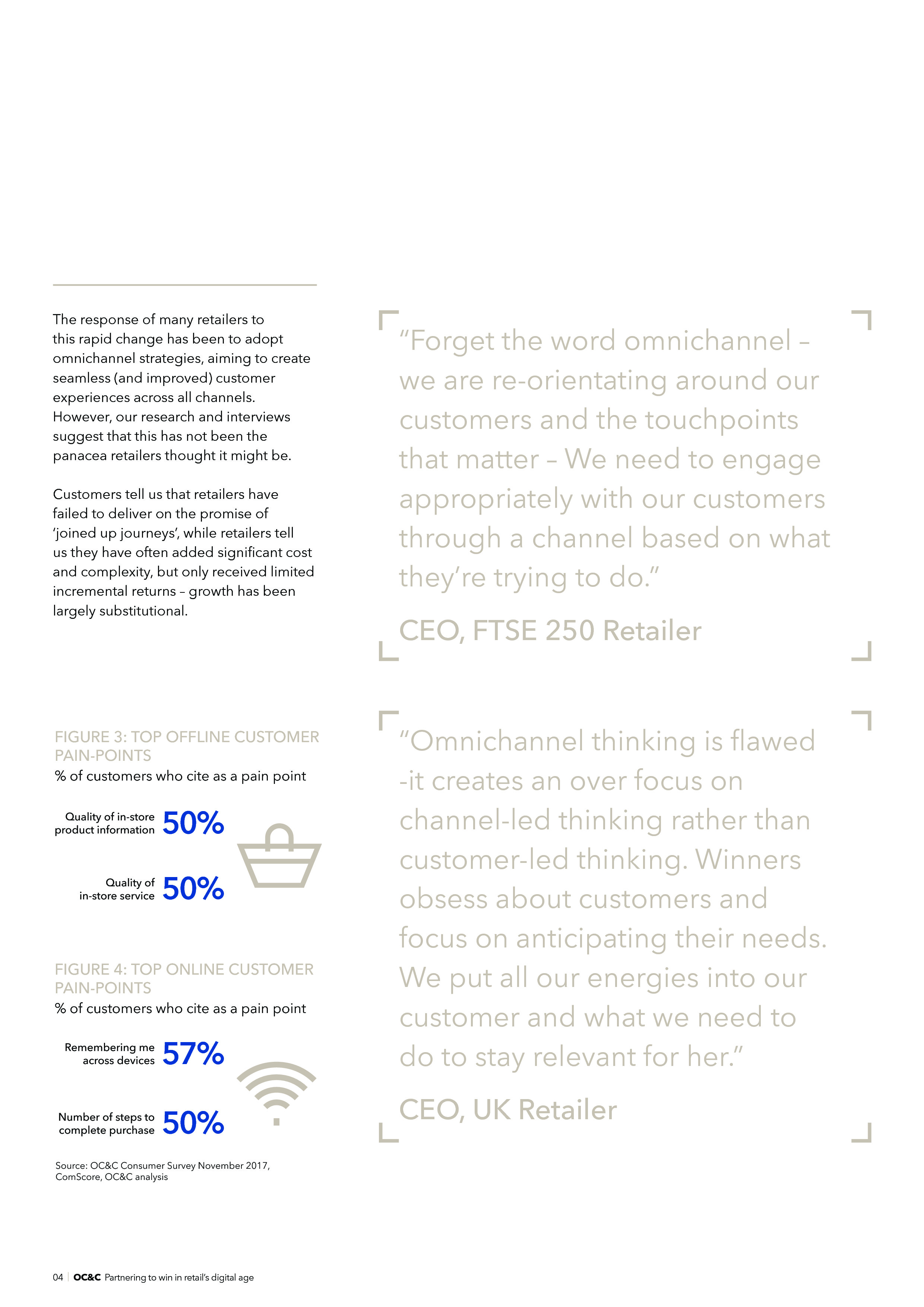 零售商对这些快速发展的趋势的响应是采用全渠道策略,力争创建跨渠道无缝消费体验。但是,调查发现这并不是零售商的万灵药。零售商加大了成本投入,但是消费者却表示零售商未能实现全渠道承诺。57%的消费者表示“跨设备记住我”是网络购物的最大痛点。