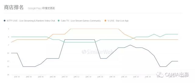 《KITTY LIVE》《Cube TV》和《V明星直播V LIVE 》分布在娱乐类应用。相比之下,《Cube TV》的排位比较稳定,一直在榜单第三与第六之间徘徊。而长时间在榜单第一和第三停留的《V明星直播V LIVE 》的整体排位相对较好。