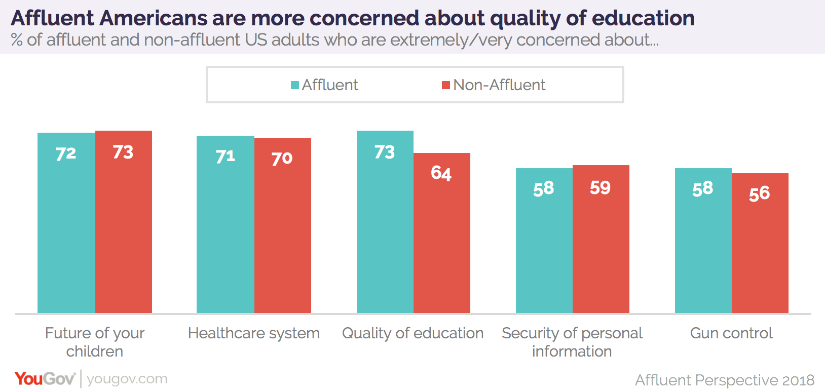 富裕和非富裕的美国人对世界也有着类似的担忧。大多数人担心孩子的未来、医疗保健系统、教育质量、个人信息安全以及枪支管制等。