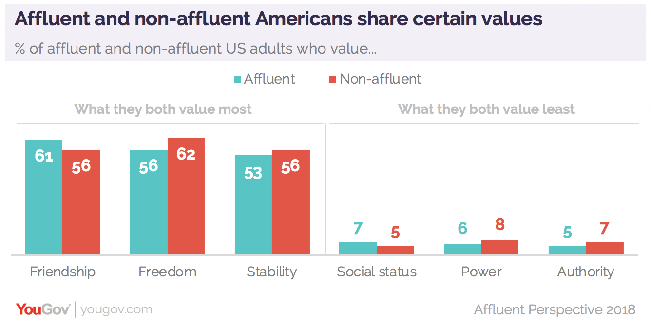 从价值观来看,自由、稳定和友谊对美国富人和非富人来说都排在前三位。有趣的是,他们最不重视的东西都是权力、权威和社会地位。