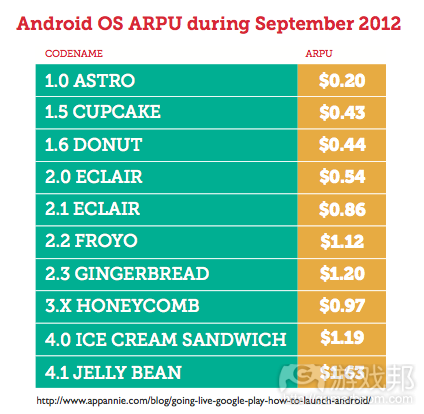 尽管Gingerbread是最受欢迎的Android操作系统,但由于Android平台分裂性问题,这一版本用户ARPU仅为1.2美元,比采用Jelly Bean的Android用户ARPU低1.8个百分点。