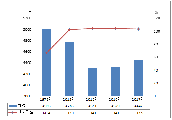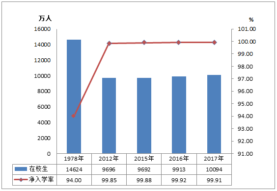 图2 1978年、2012年、2015-2017年小学在校生和净入学率
