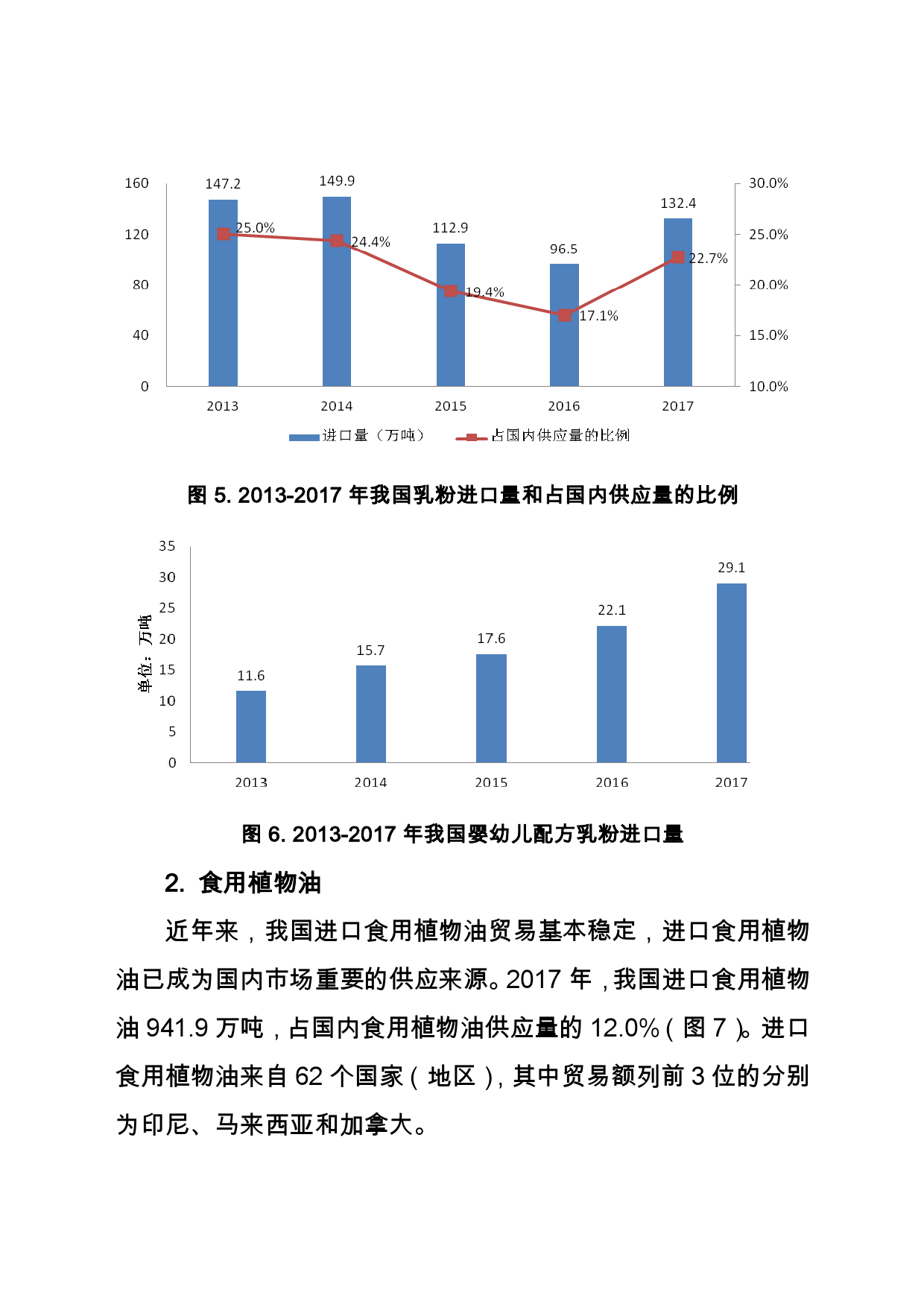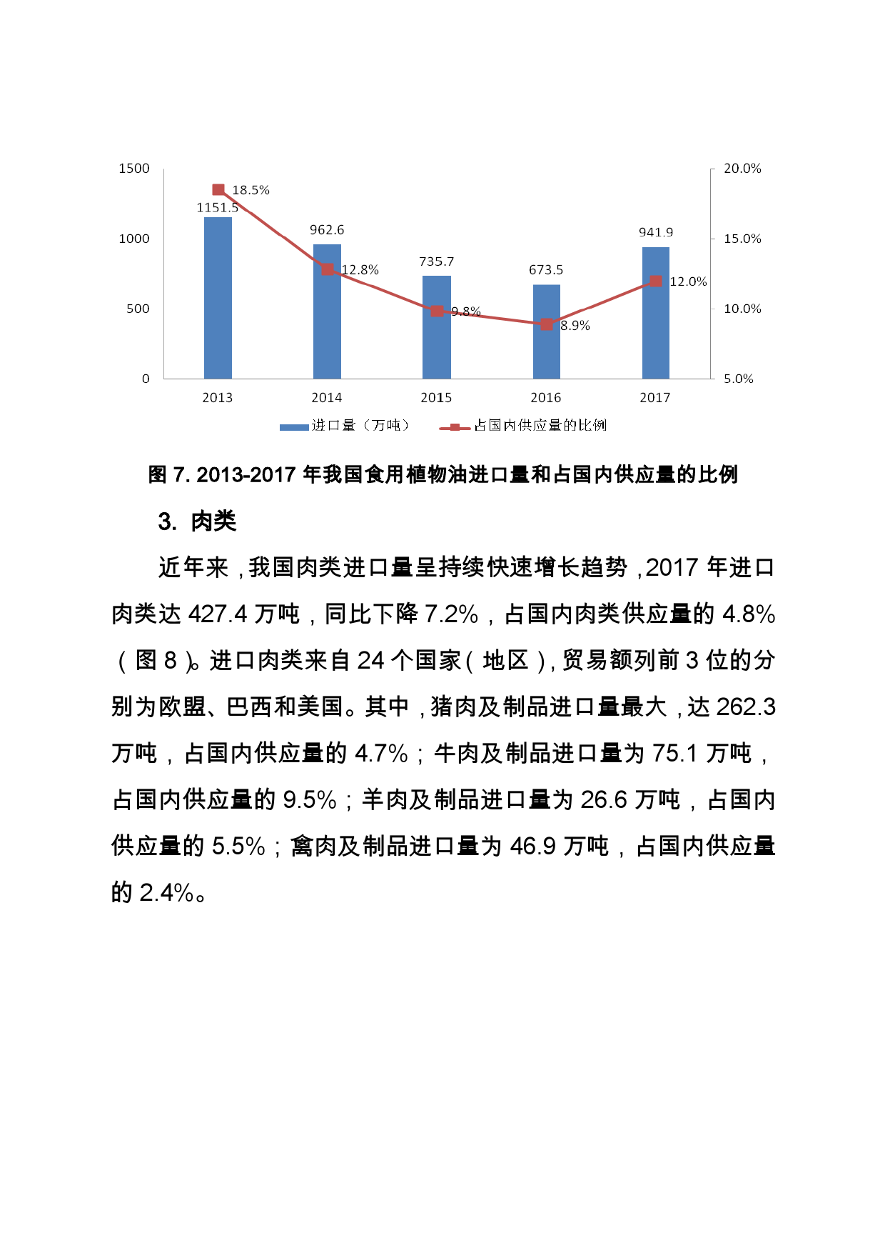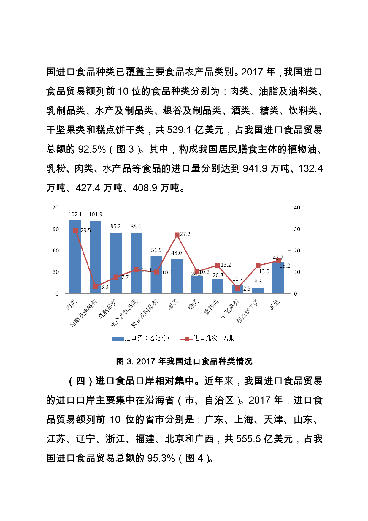 2017年,我国从187个国家(地区)进口食品142.9万批、5348.1万吨、582.8亿美,同比分别增长7.9%、36.5%和25.0%。其中进口食品贸易额列前10位的分别为:欧盟、美国、新西兰、印尼、加拿大、澳大利亚、巴西、马来西亚、俄罗斯和越南;肉类、油脂及油料类、乳制品类、水产及制品类、粮谷及制品类、酒类、糖类、饮料类、干坚果类和糕点饼干类等为主要进口食品种类。