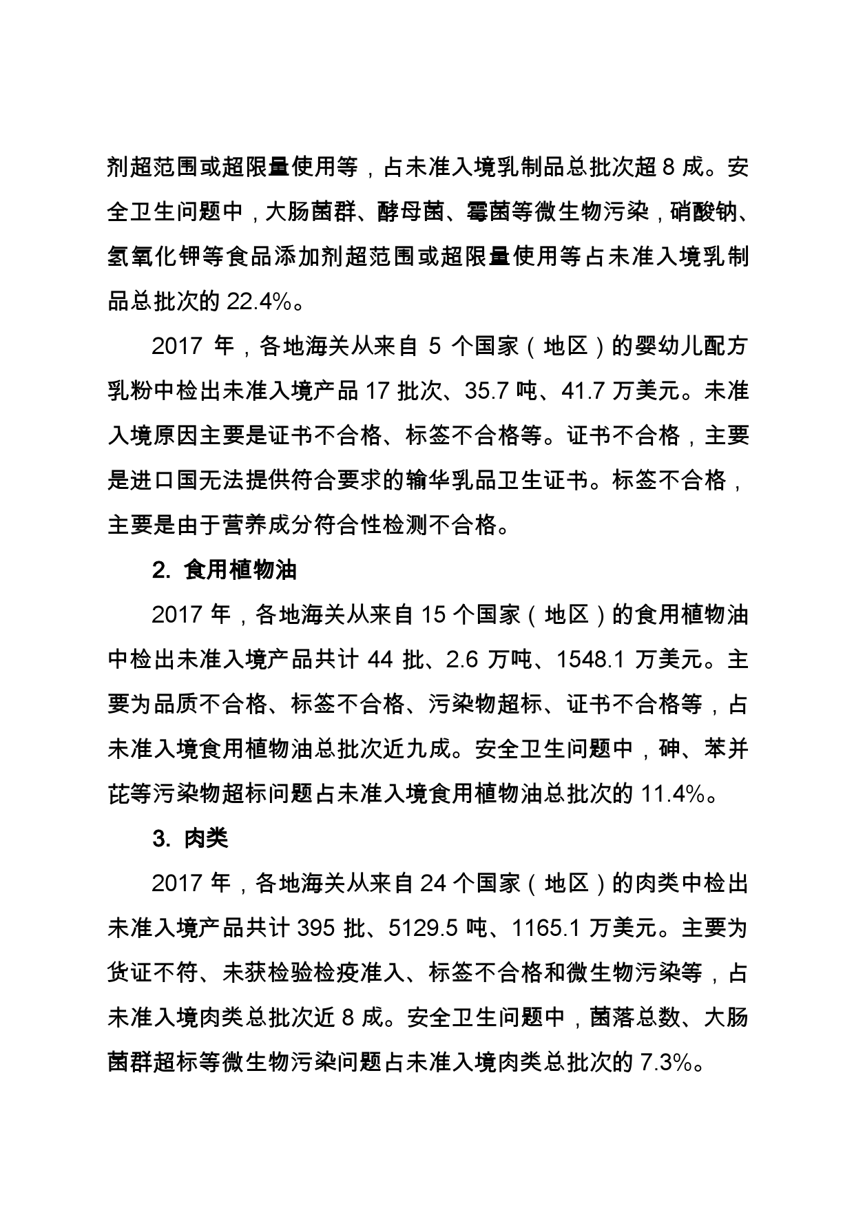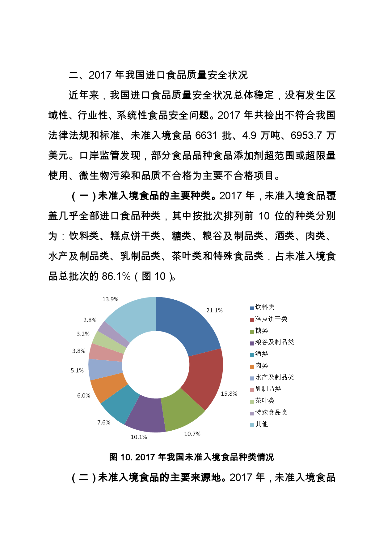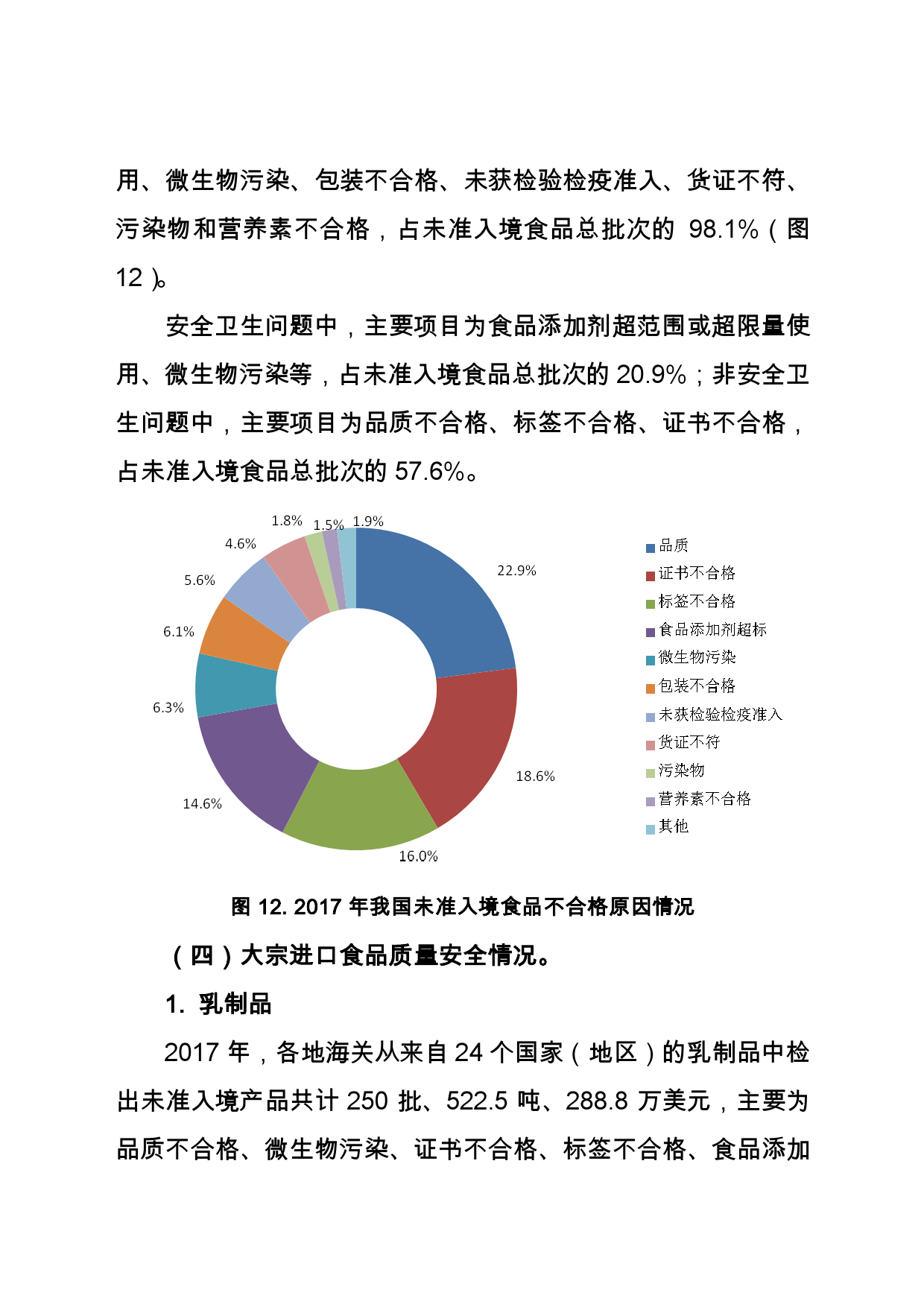 2017年,海关总署进一步完善进口食品安全监管体系,严格进口食品监管,大力落实进口食品生产经营者责任,积极推进食品安全国际共治,有效地保障了进口食品安全,全年没有发生重大进口食品安全问题。2017年共从94个国家(地区)检出不符我国法律法规和标准、未准入境食品 6631批、4.9万吨、6953.7万美元。其中,主要是饮料类、糕点饼干类、糖类、粮谷及制品类、酒类;不合格主要原因包括:品质不合格、证书不合格、标签不合格、食品添加剂超范围或超限量使用、微生物污染等。
