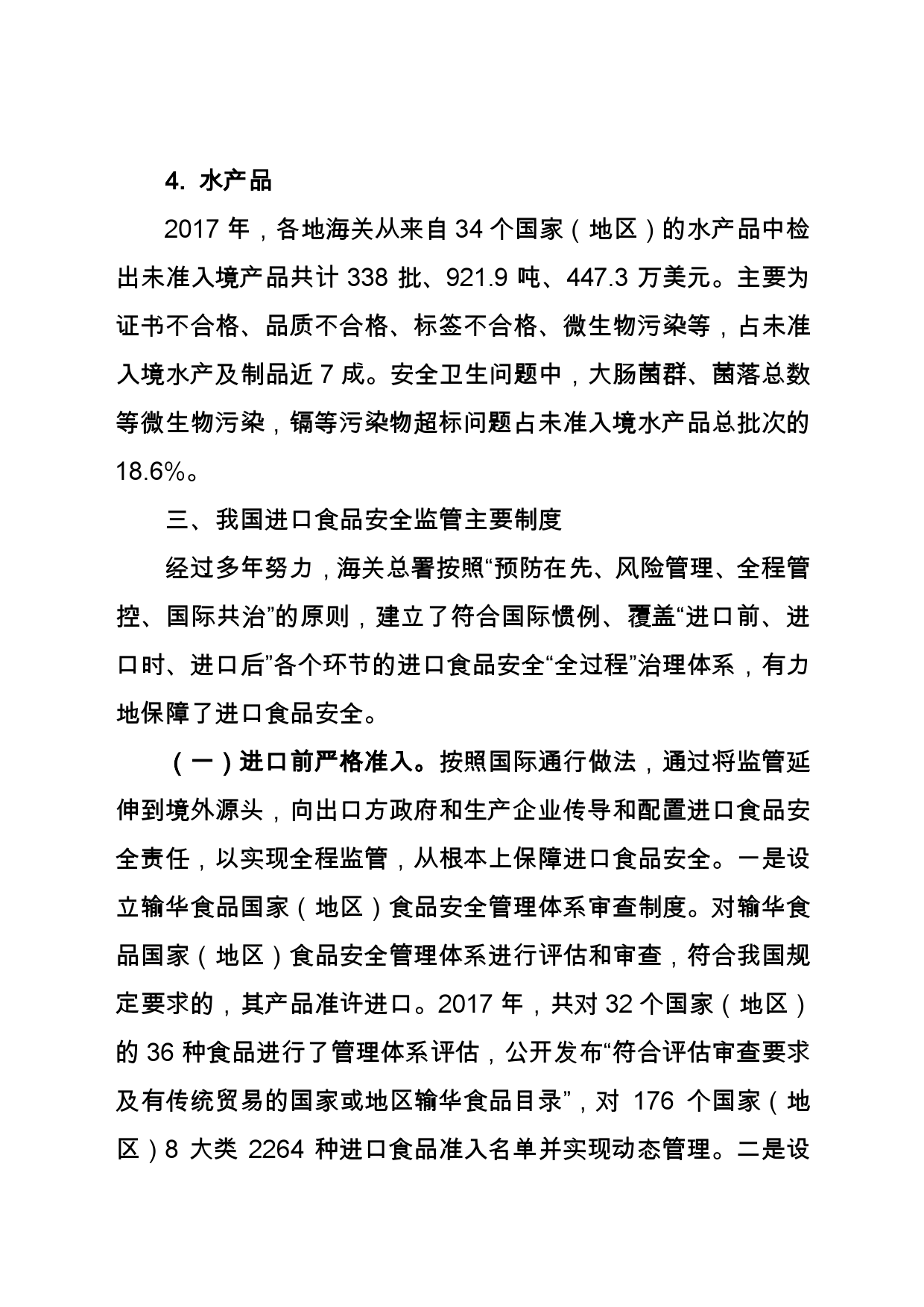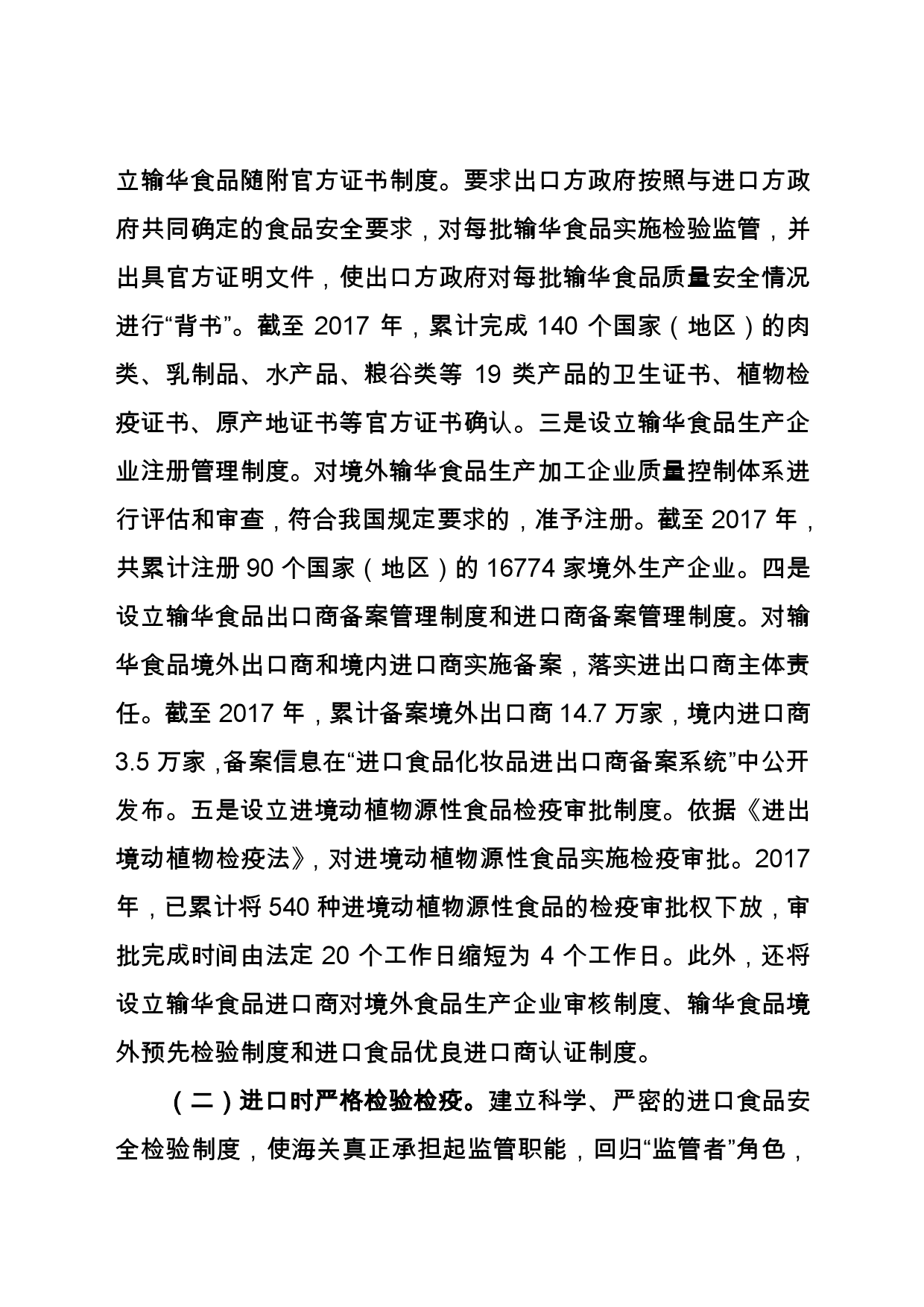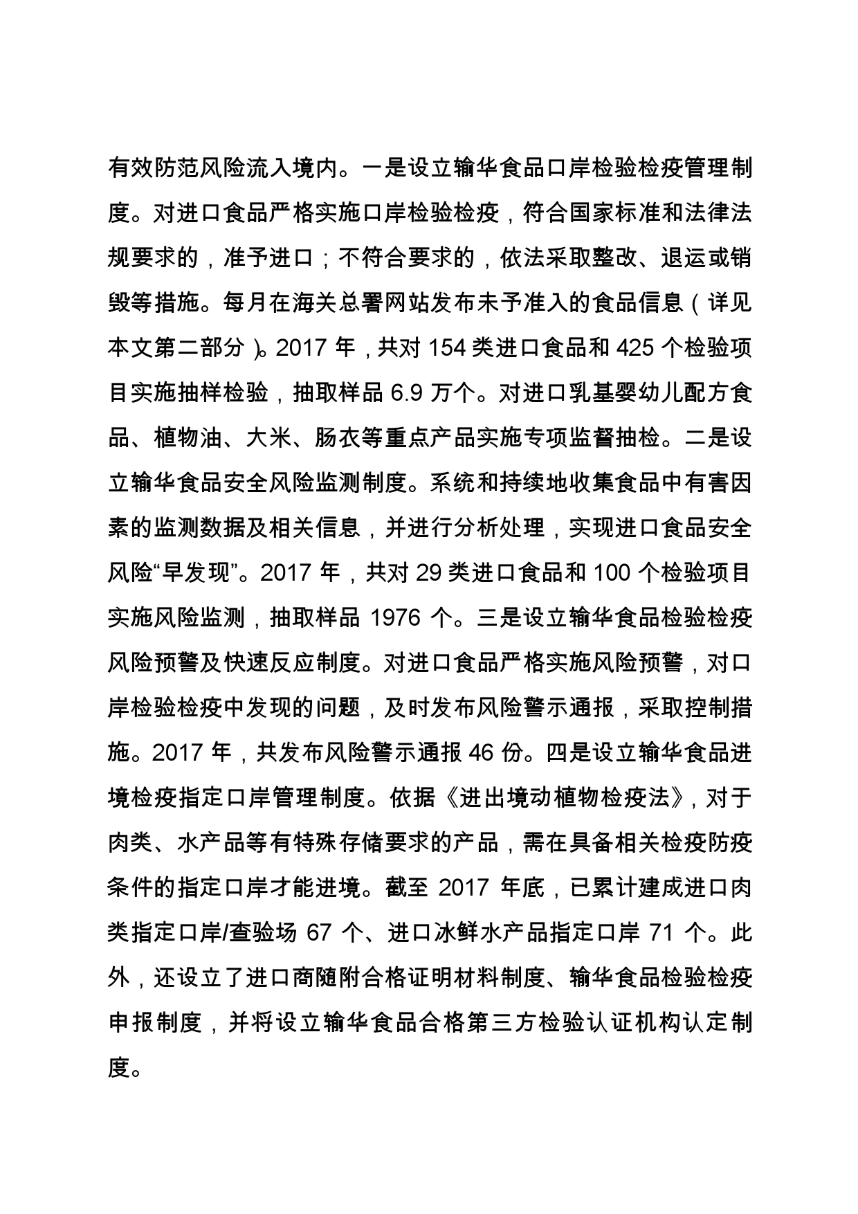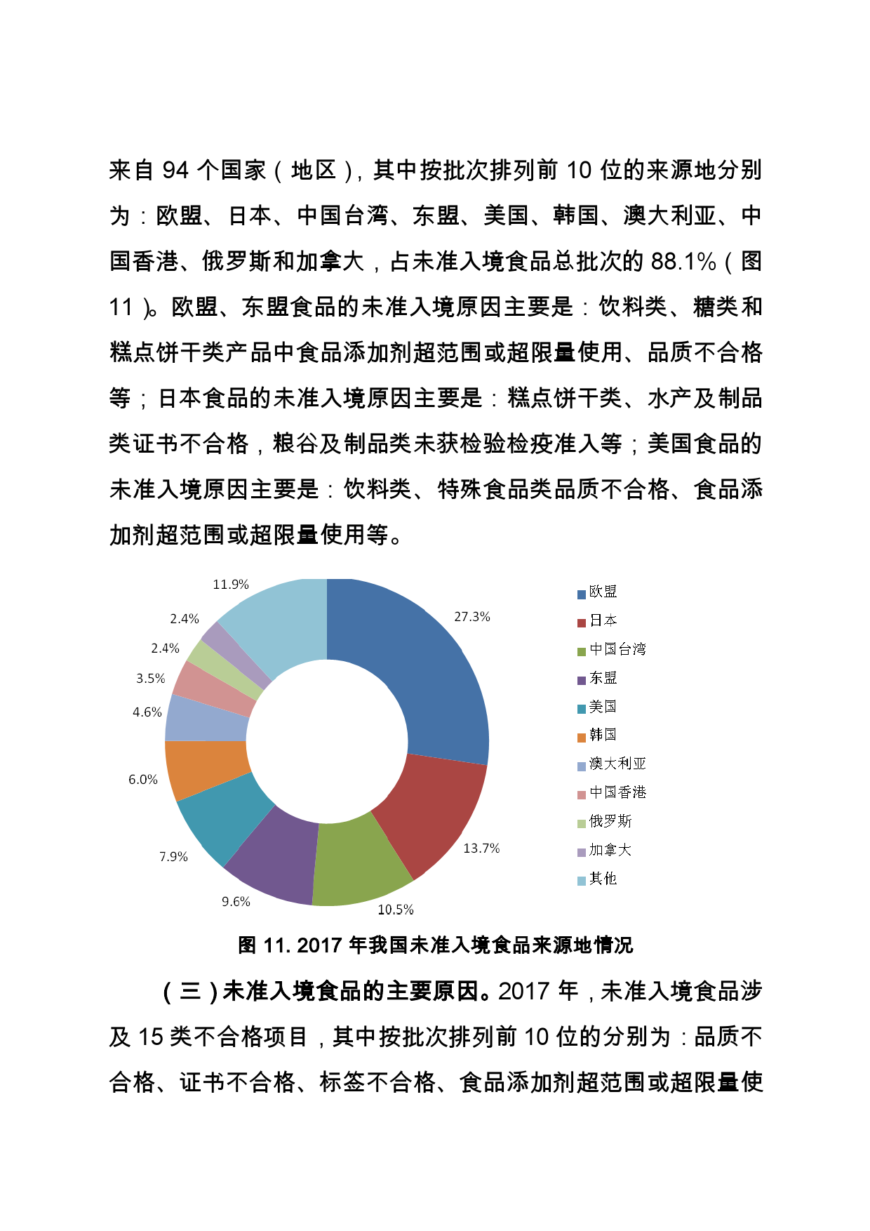 2017年,海关总署进一步完善进口食品安全监管体系,严格进口食品监管,大力落实进口食品生产经营者责任,积极推进食品安全国际共治,有效地保障了进口食品安全,全年没有发生重大进口食品安全问题。2017年共从94个国家(地区)检出不符我国法律法规和标准、未准入境食品 6631批、4.9万吨、6953.7万美元。其中,主要是饮料类、糕点饼干类、糖类、粮谷及制品类、酒类;不合格主要原因包括:品质不合格、证书不合格、标签不合格、食品添加剂超范围或超限量使用、微生物污染等。