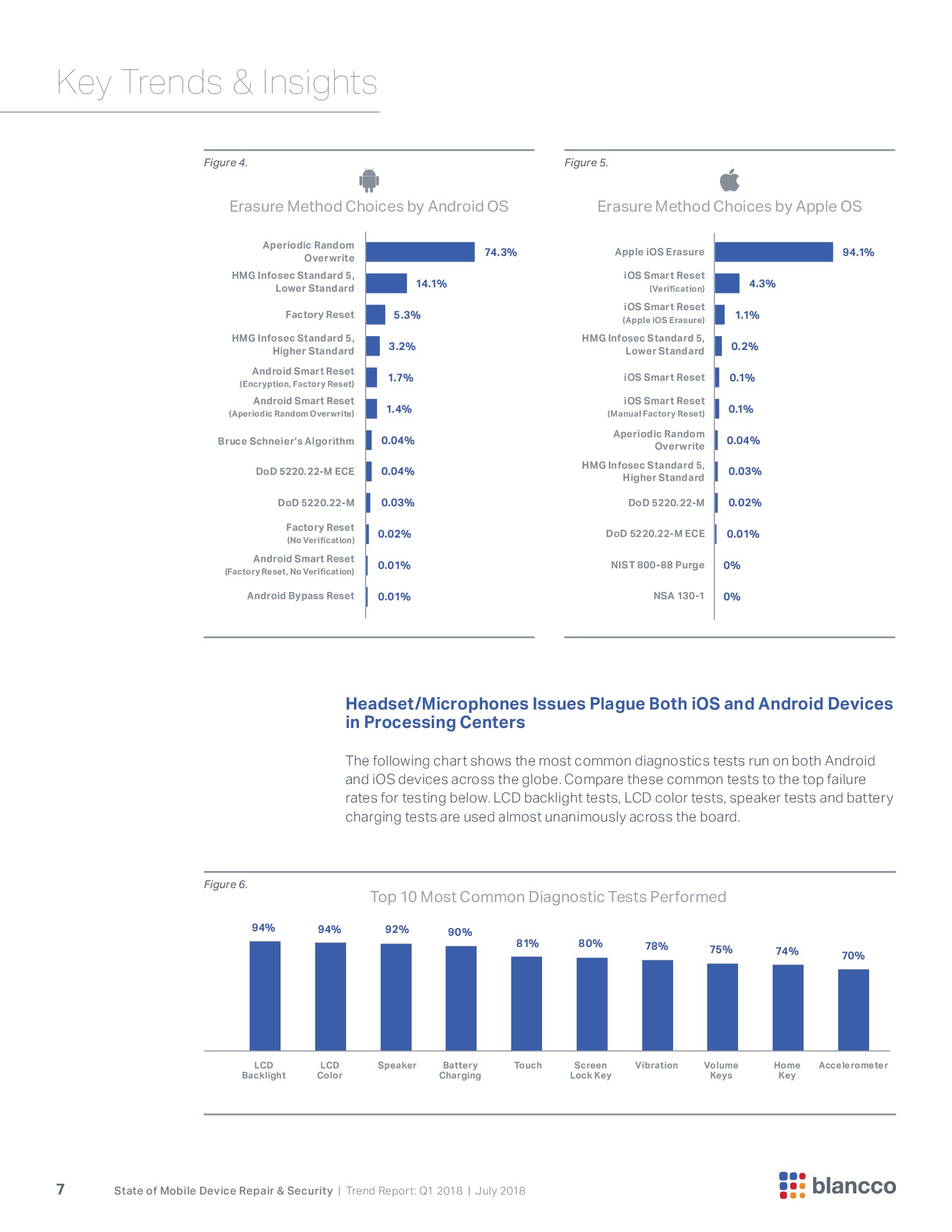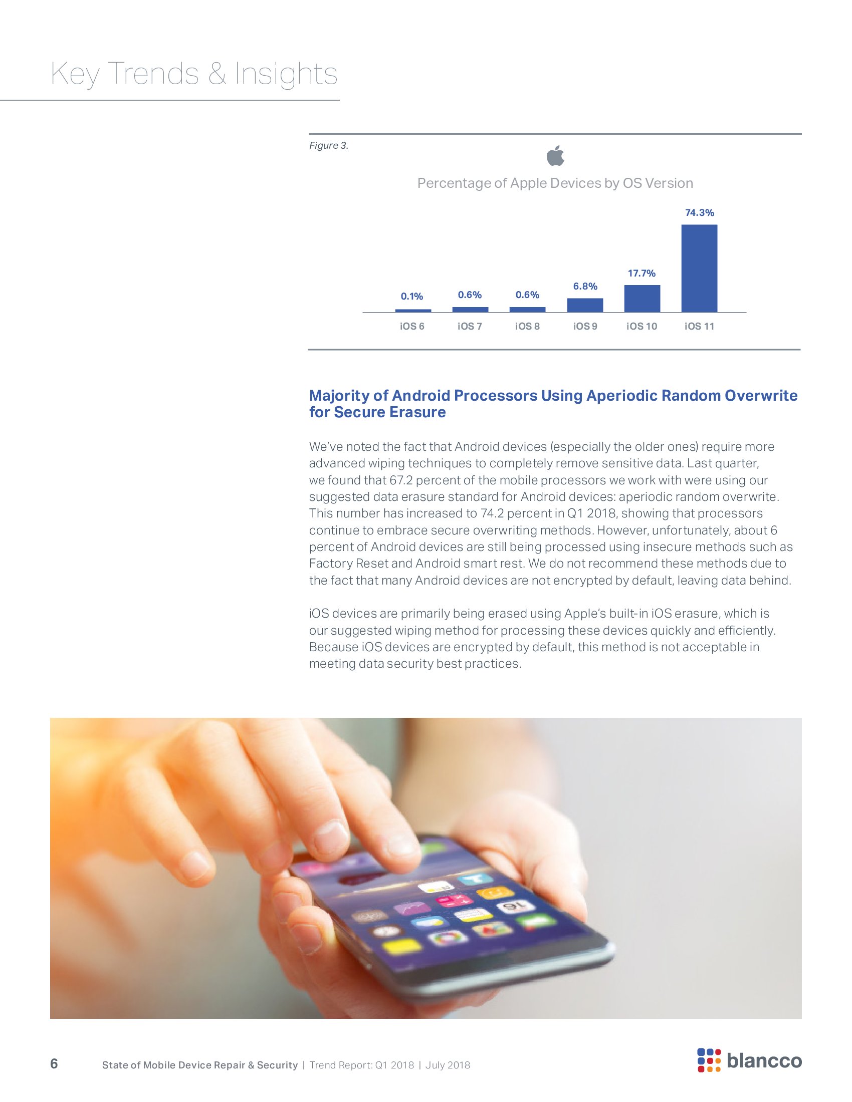 第一季度,与Blancco合作的处理者中有74%使用Aperiodic Random Overwrite。iOS设备则使用苹果提供的iOS擦出软件。由于iOS设备默认是加密的,因此从数据安全的角度来看,还是可以接受的。