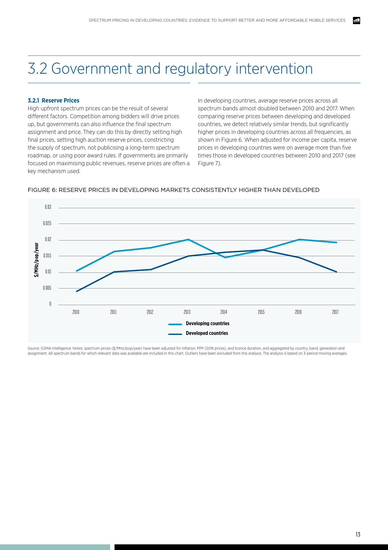 由GSMA移动智库(GSMA Intelligence)编制的这份研究报告还发现,各国政府都在极力促成频谱涨价,以尽可能增加频谱授权所带来的财政收入。高频谱价格与国家的主权债务水平高息息相关,且考虑收入因素时,发展中国家的频谱拍卖平均底价比发达国家高出惊人的五倍以上。报告还确定了高频谱价格与低覆盖率之间,以及更昂贵的移动宽带服务与质量较差的移动宽带服务之间的联系,所有这些均会阻碍服务在消费者中的普及。