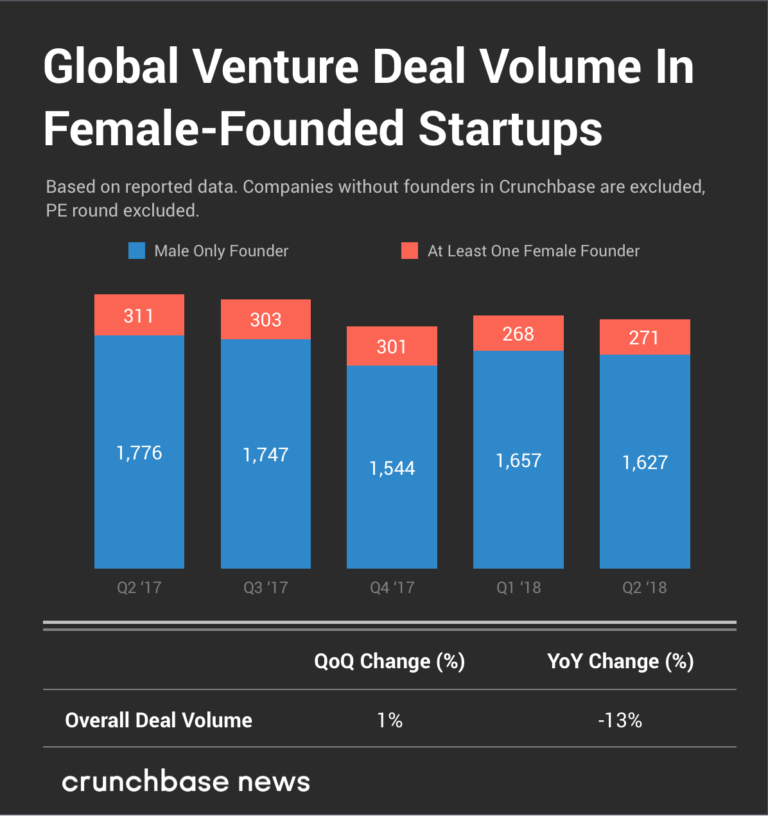 和投资额相比,女性创始人获得的投资交易数量更少,过去两个季度都在14%左右。之前几个季度的份额都在15-16%。