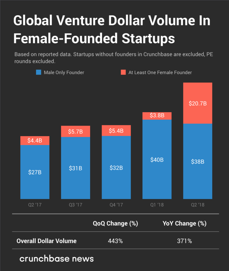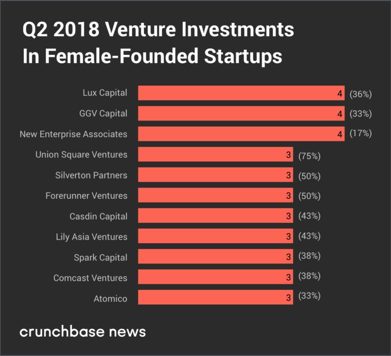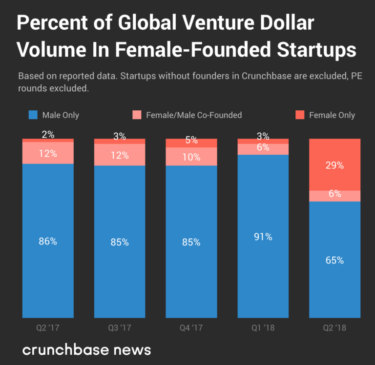 根据Crunchbase的数据,2018年第二季度35%的风险投资流向了有女性创始人的初创企业,增长22%,远高于过去四个季度的平均水平(13%)。