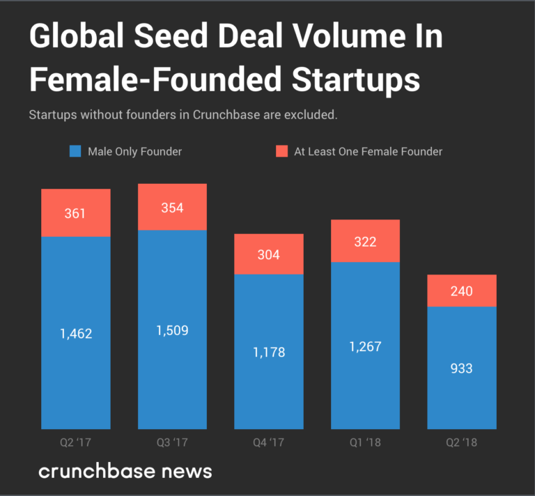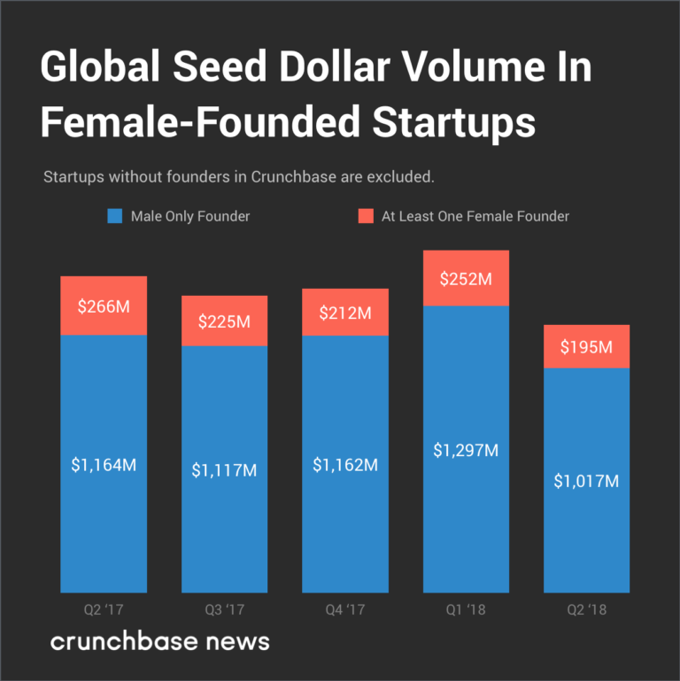 第二季度女性参与创立的种子企业共获得1.95亿美元,占该季度种子投资的16%,与前一季度持平,低于2017年第二季度(19%)。