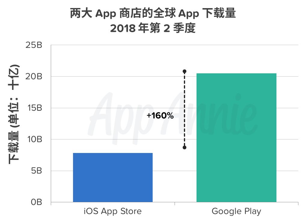Google Play 在 2018 年第 2 季度的全球下载量超过了 200 亿次,年同比增长 20%,与 iOS 的差距拉大了 25 个百分点,达到 160%。