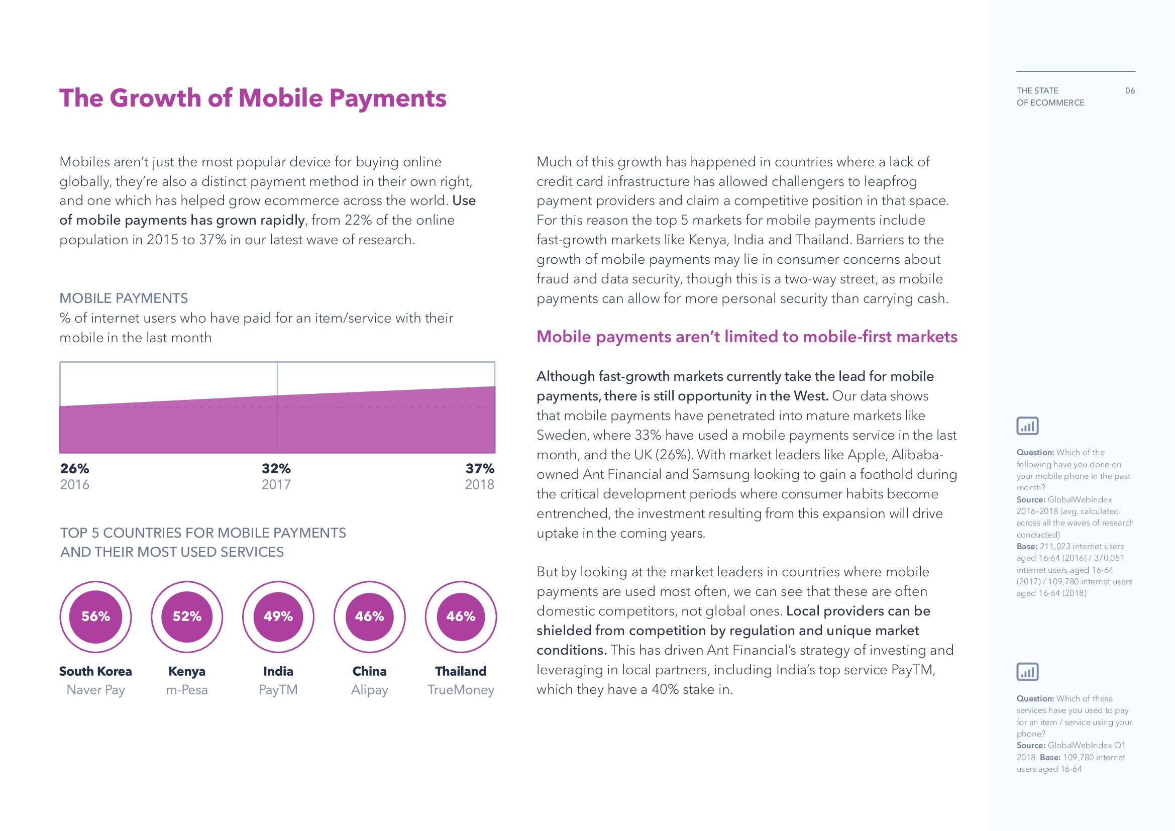 从研究产品和购买产品,到网络支付行都越来越依赖移动渠道。过去一个月,54%的受访者在移动设备上购买过产品。但是,PC仍然很受欢迎,特别是在西方国家,例如44%的消费者在过去一个月在PC上进行过网购。但随着移动支付的增长,更小的屏幕已经成为电子商务生态的主宰。2018年,37%的网民使用移动支付,这个指数在2016年只有26%。
