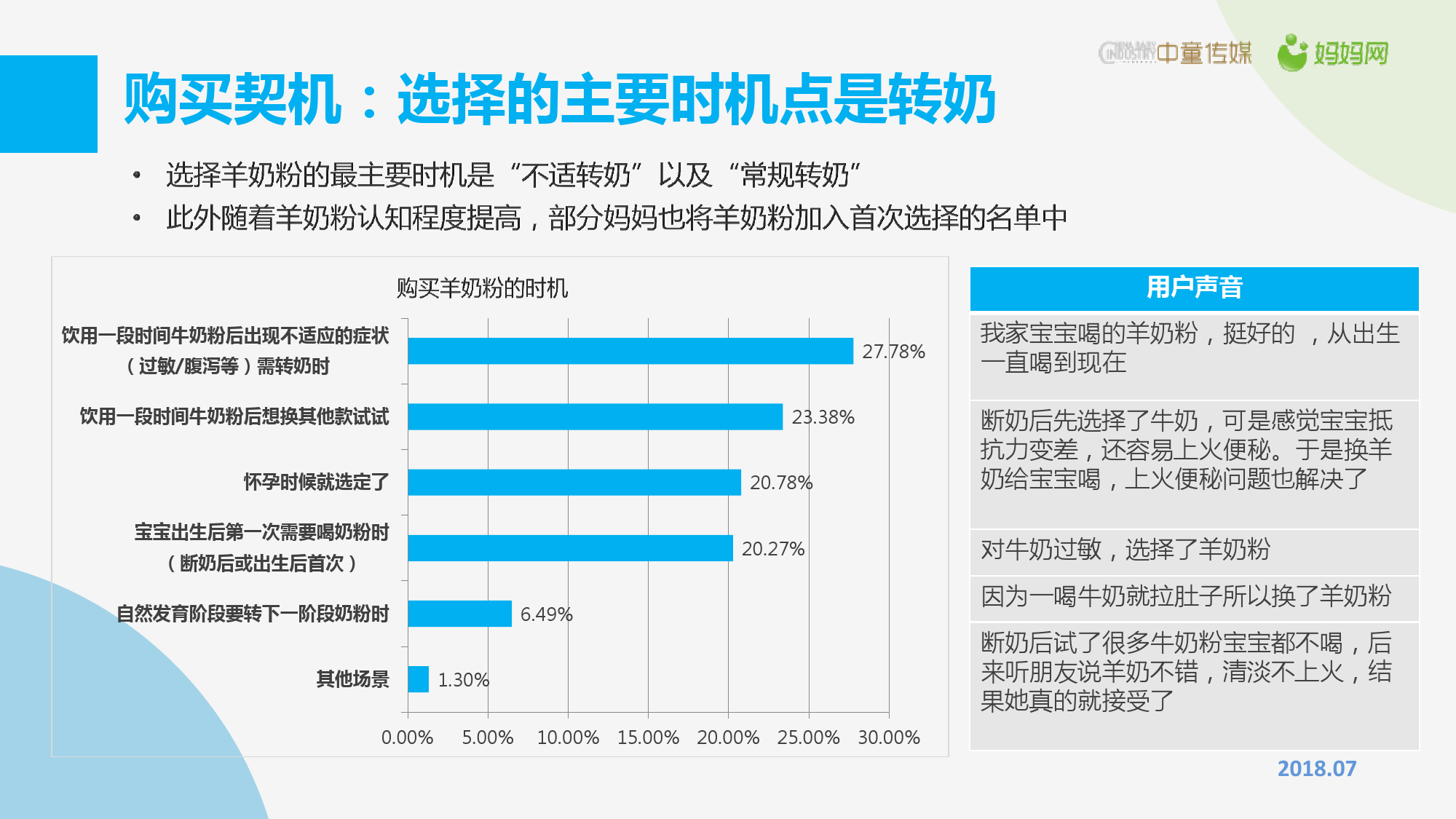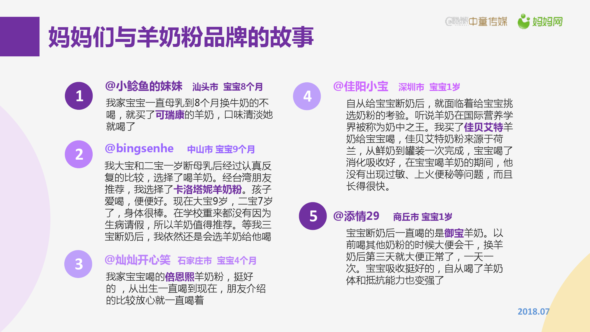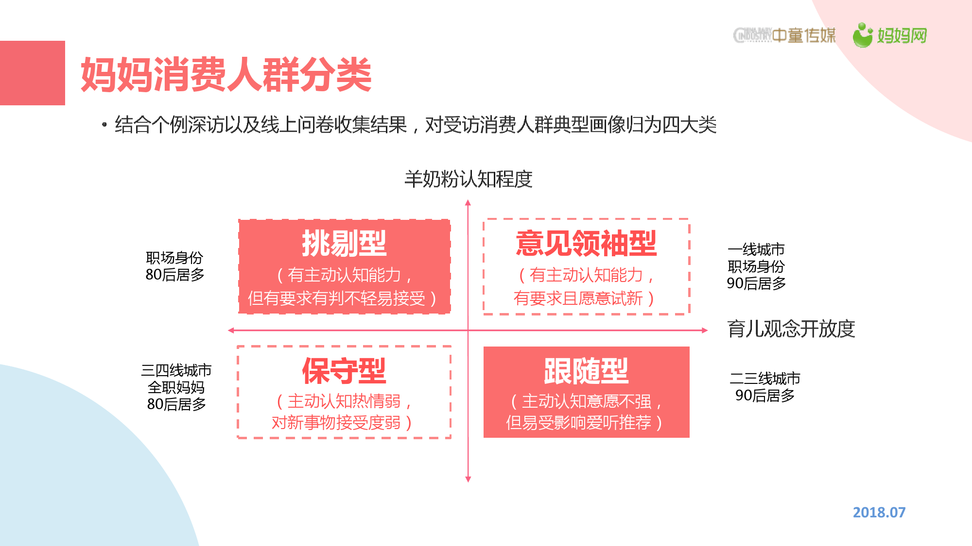 近年来,随着消费观念的转变和总体生活水平的提升,羊奶粉快步走进大众视野。对此,妈妈网从6月份便展开了“羊奶粉消费偏好”系列调研,采用线上定量问卷、个例深度访谈以及论坛话题讨论等多种形式,多维度收集数据,并呈现了妈妈消费者对于羊奶粉的认知态度和消费习惯的变化。报告也针对整体调研结果总结提炼出了四种羊奶粉消费人群的典型画像,她们分别代表了四种不同的消费习惯和市场现状。