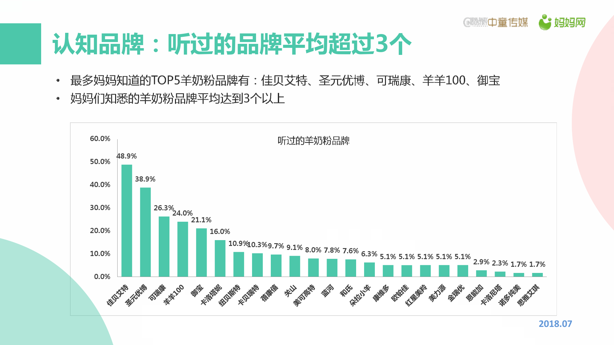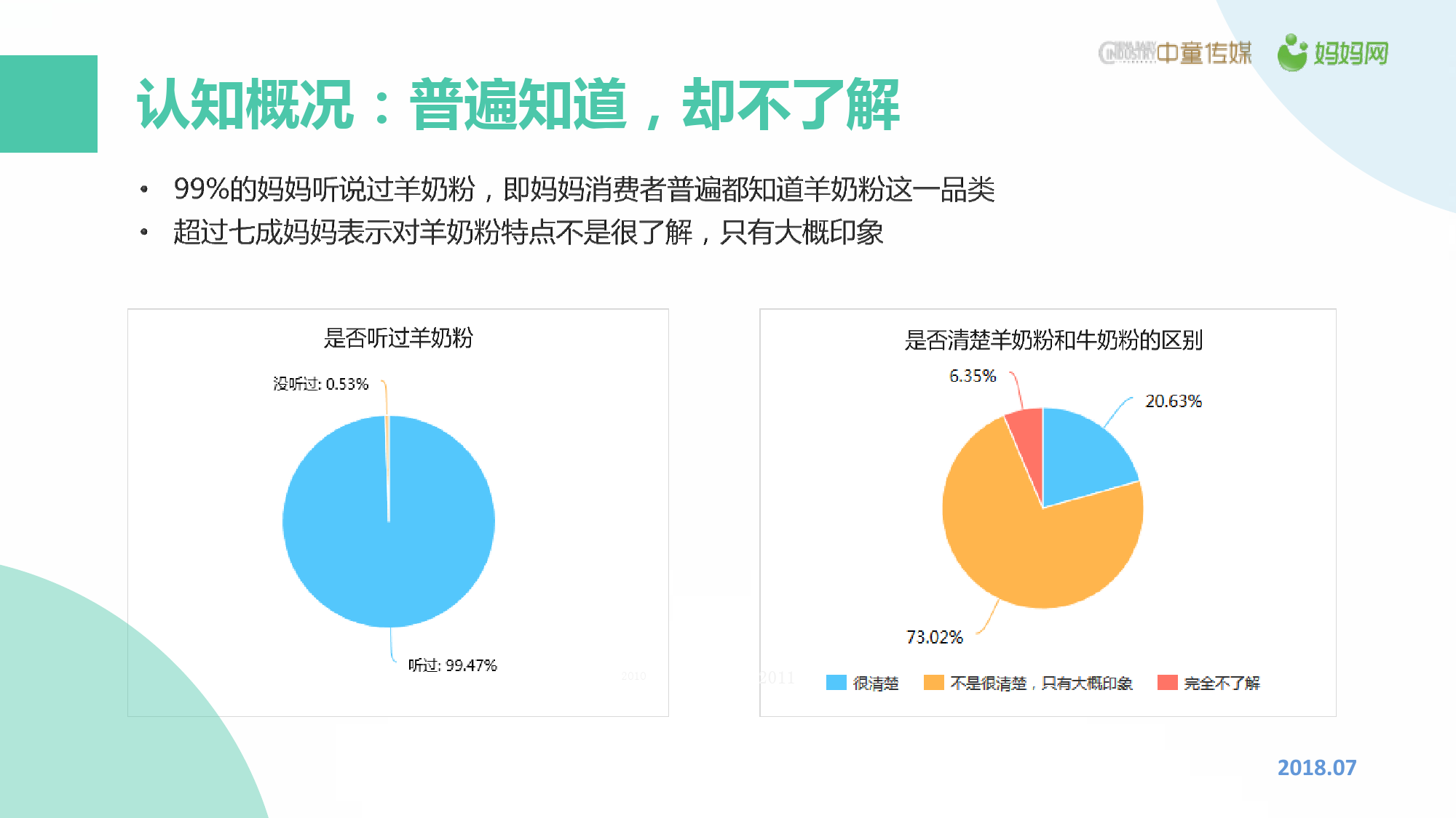 报告称,90%的妈妈听说过羊奶粉,但其中却有七成的妈妈表示对羊奶粉的特点不是很了解,只有大概印象。可见,经过前几年羊奶粉市场的发展与教育,妈妈们普遍对于“羊奶粉”有了基础认知,不再是完全陌生。但七成妈妈不了解的情况也同时反映出了羊奶粉的市场教育还有巨大的深挖空间。