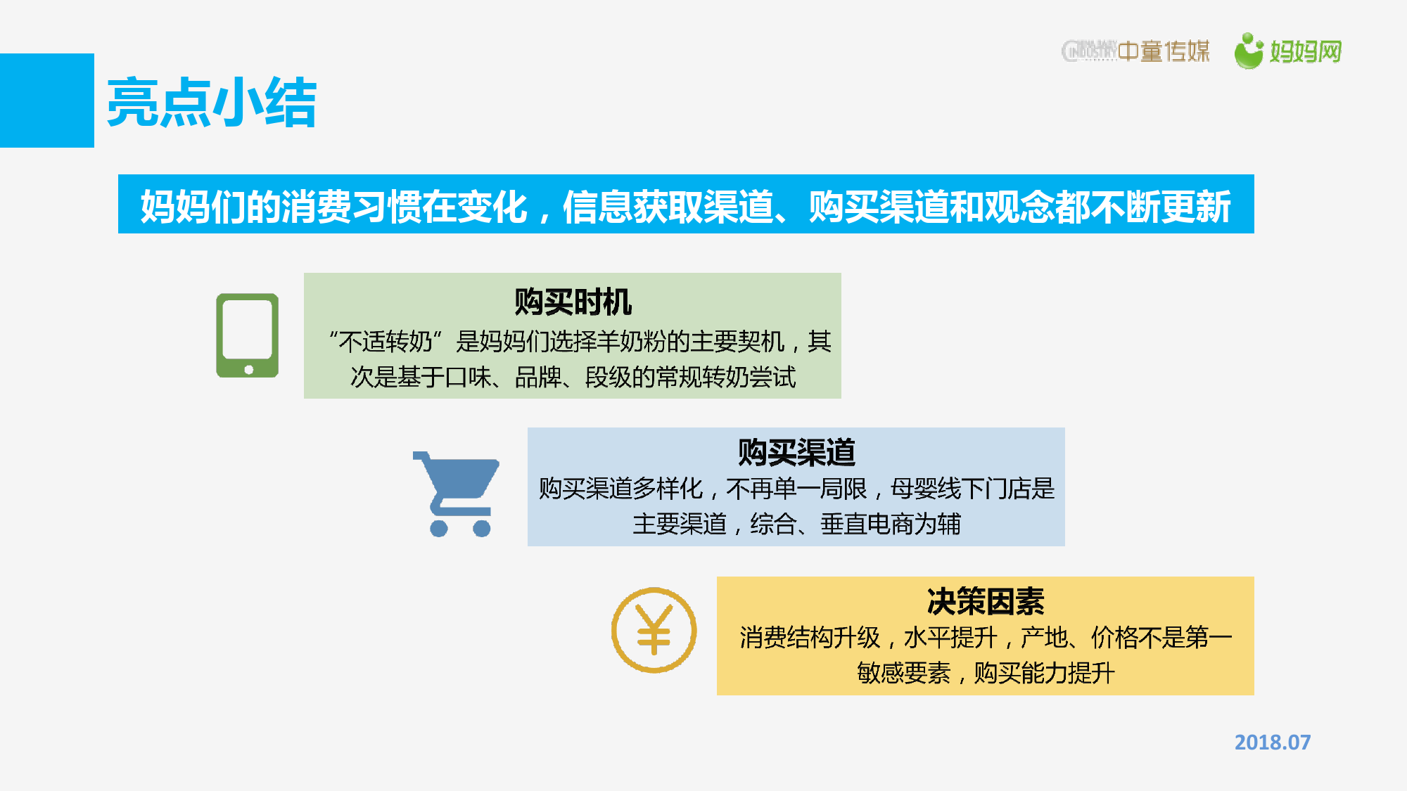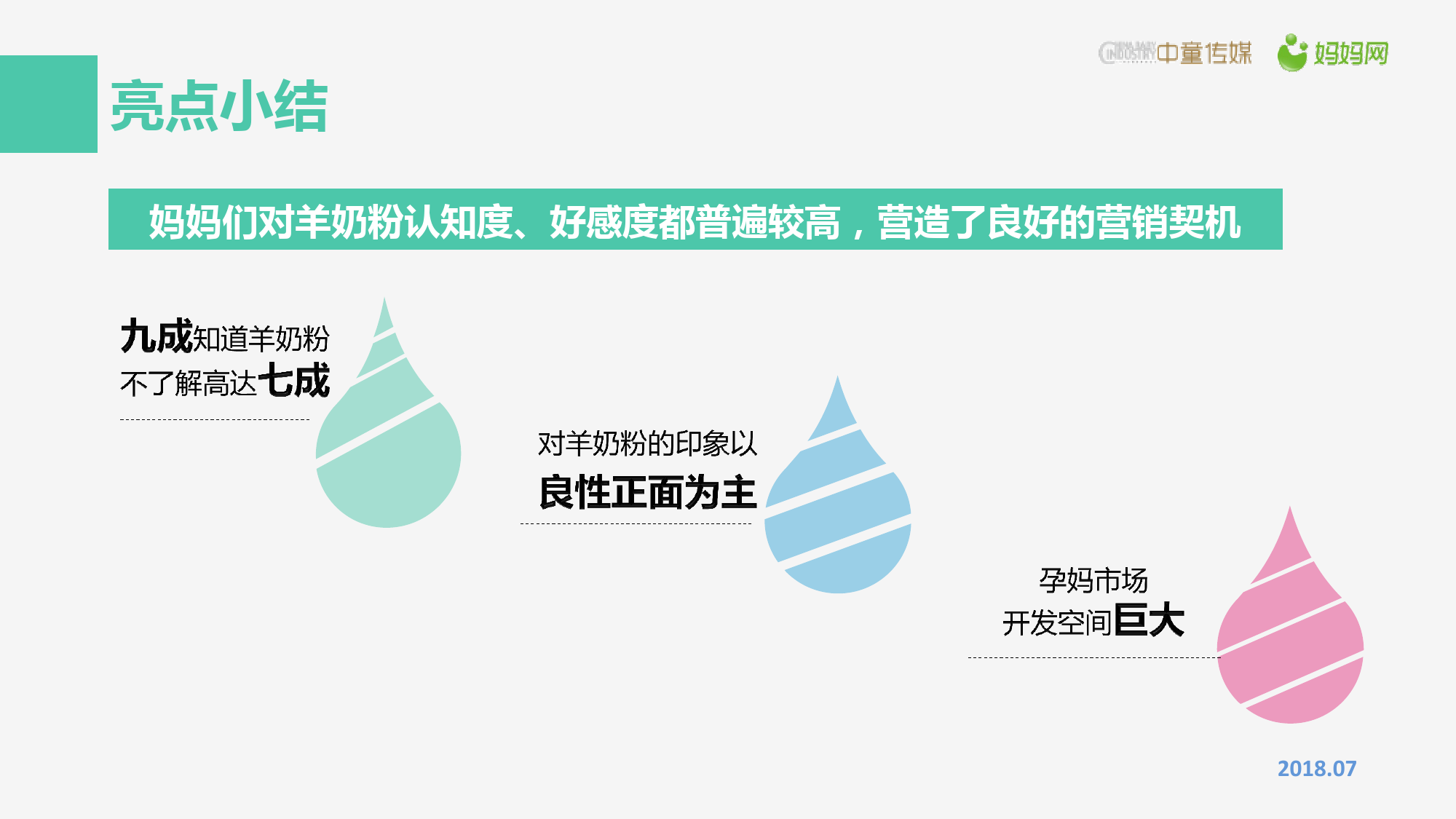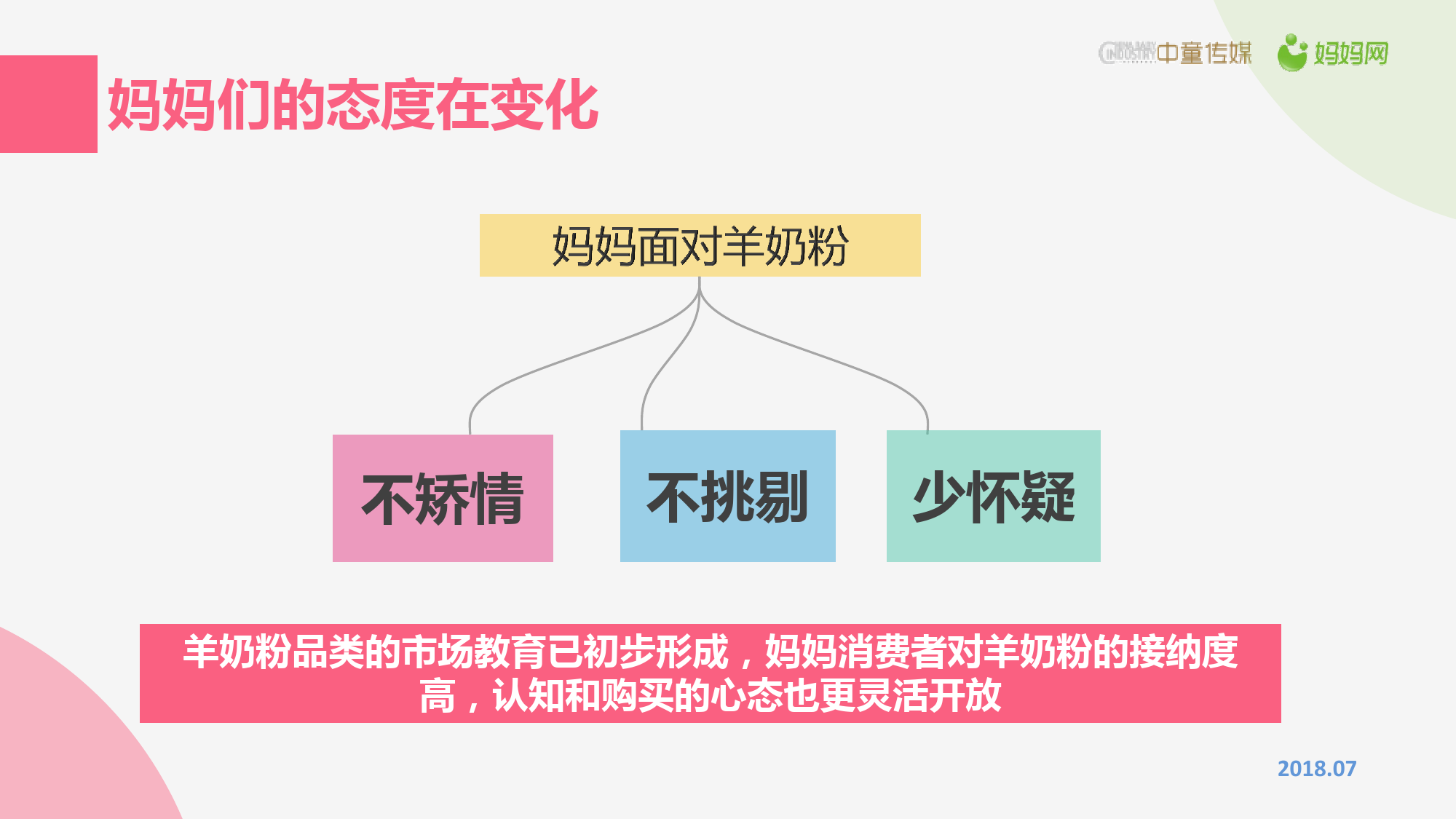 综上,可见羊奶粉品类的市场教育已初步形成。对于羊奶粉品牌妈妈消费者的接纳度不断提升,同时认知和购买的心态也更加灵活开放,形成了人群认知利好;市场规模不断提升,并未有寡头垄断,形成了市场环境利好;信息传播及营销手段的多样化,及销售渠道的多元化,形成了营销时机利好。