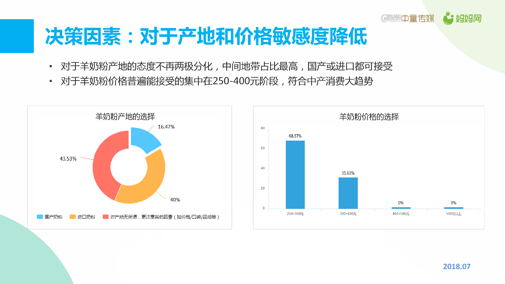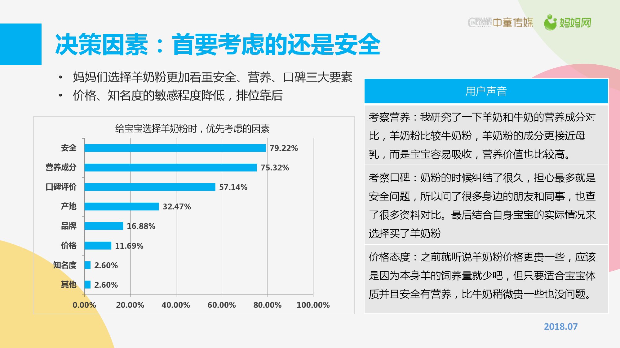 “妈妈们选择羊奶粉更看重安全、营养和口碑三大要素。对价格、知名度的敏感度反而降低,排位靠后。”妈妈网COO高广英在发布报告时指出,对于产地和价格敏感度,羊奶粉消费者的期望值在降低。总体来说,妈妈们在选择羊奶时的消费习惯和消费心态都在悄然发生改变。羊奶粉品类的市场教育已初步形成,妈妈消费者对羊奶粉的接纳度高,认知和购买的心态也更灵活开放。