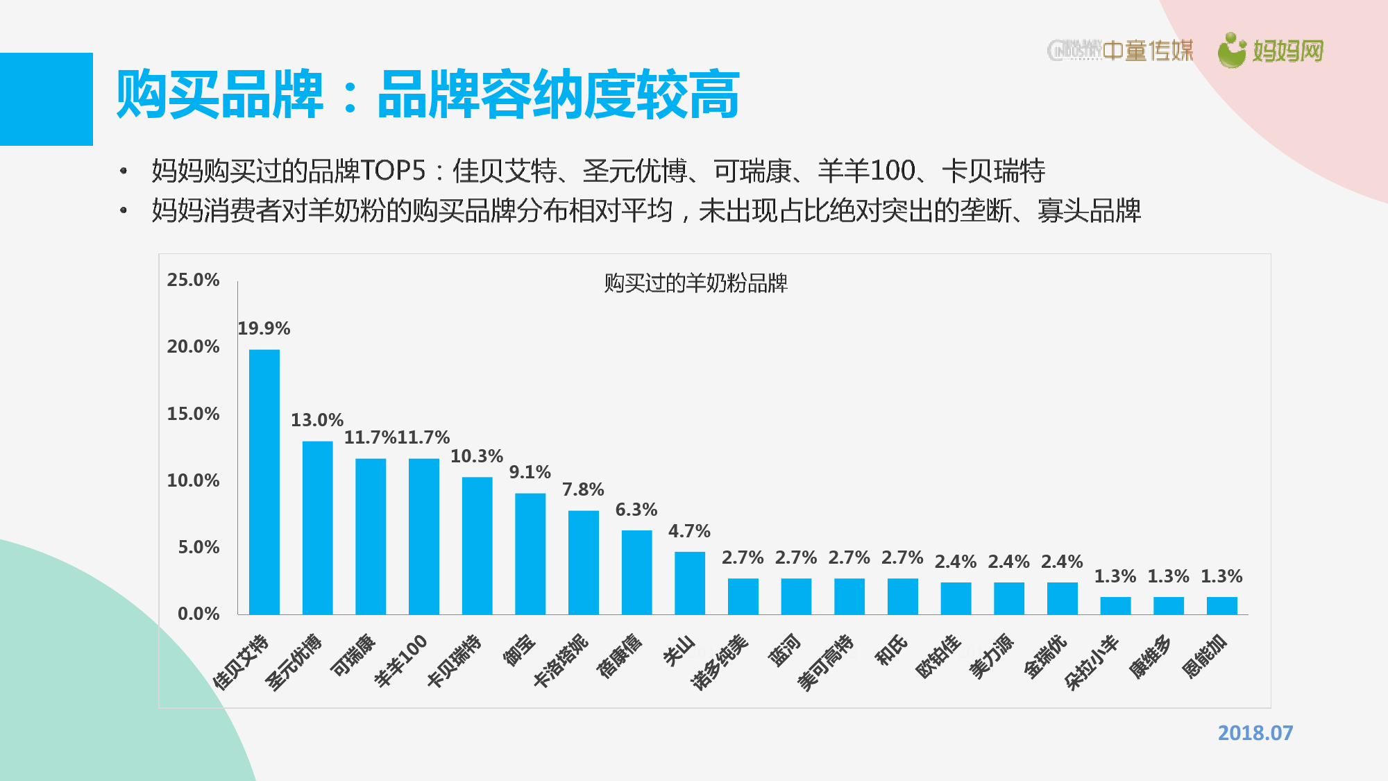 尽管随着市场需求的快速扩张,使得羊奶粉近年来的市场增量不断创新高,但从报告中妈妈消费者所购买的羊奶粉品牌分布情况也可看出,市场上的羊奶粉品牌众多,且多数处于培育期,整体暂时未出现绝对的垄断品牌和寡头竞争态势。