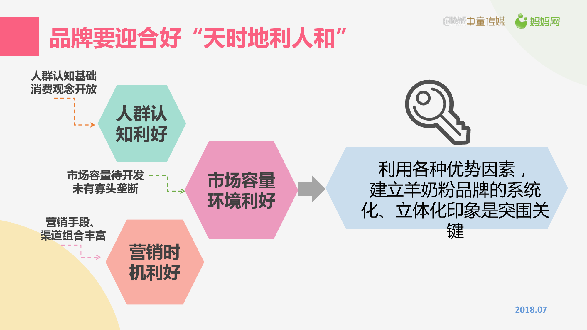 羊奶粉行业发展已经到了 “天时地利人和”阶段,品牌商要积极利用各种优势因素,努力建立羊奶粉品牌的系统化、立体化印象,同时妈妈网也将凭借在母婴领域的服务经验及优质资源为优质羊奶粉品牌提供助力,帮助它们在竞争中实现突围。