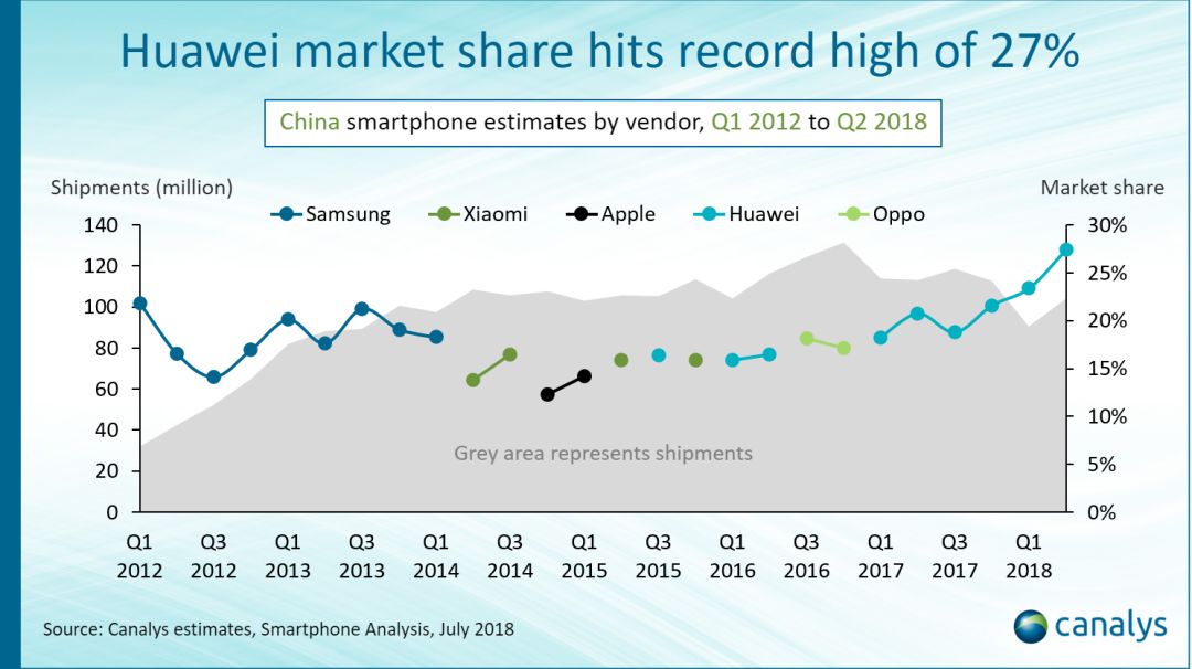 其中华为在中国的市场份额达到了27%,这是自2011年以来中国智能手机厂商创造的最大份额,较2017年第二季度的21%市场份额有明显提升,增幅较大。