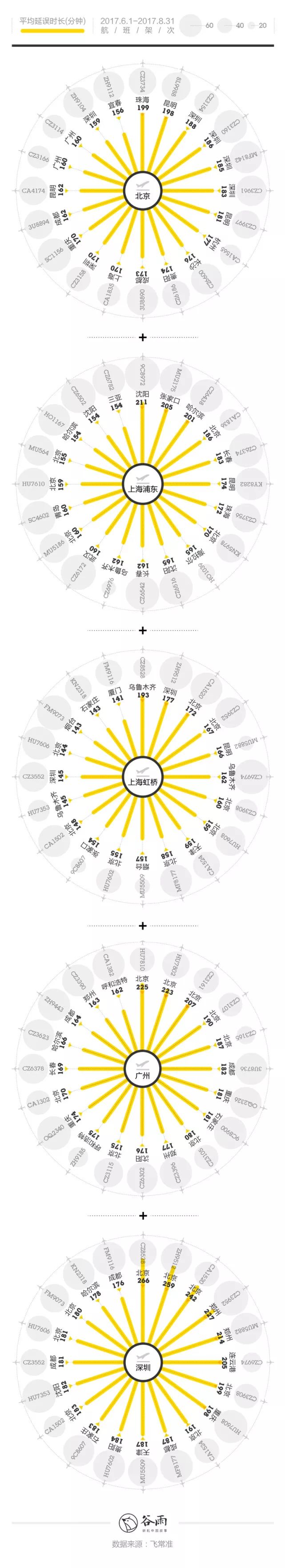 我们选取了北京上海广州深圳的五大机场,通过在民航数据服务公司飞常准网站的检索,获取了它们在2017年的夏季(6/1-8/31)延误最严重的20个航班班次的信息,执行频次低于每两天一班的航班已被过滤。