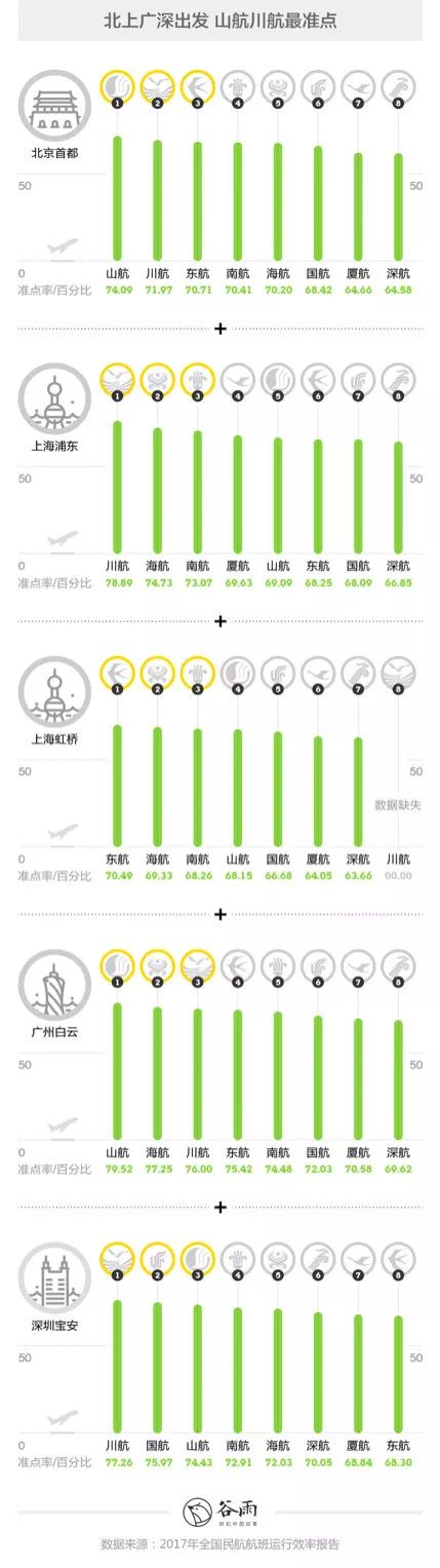 据《2017年全国民航航班运行效率报告》的数据显示。八大航空公司在北上广深的五个机场的放行正常率排行里,厦航、深航一般都在低位,川航和山航的排名整体更靠前。