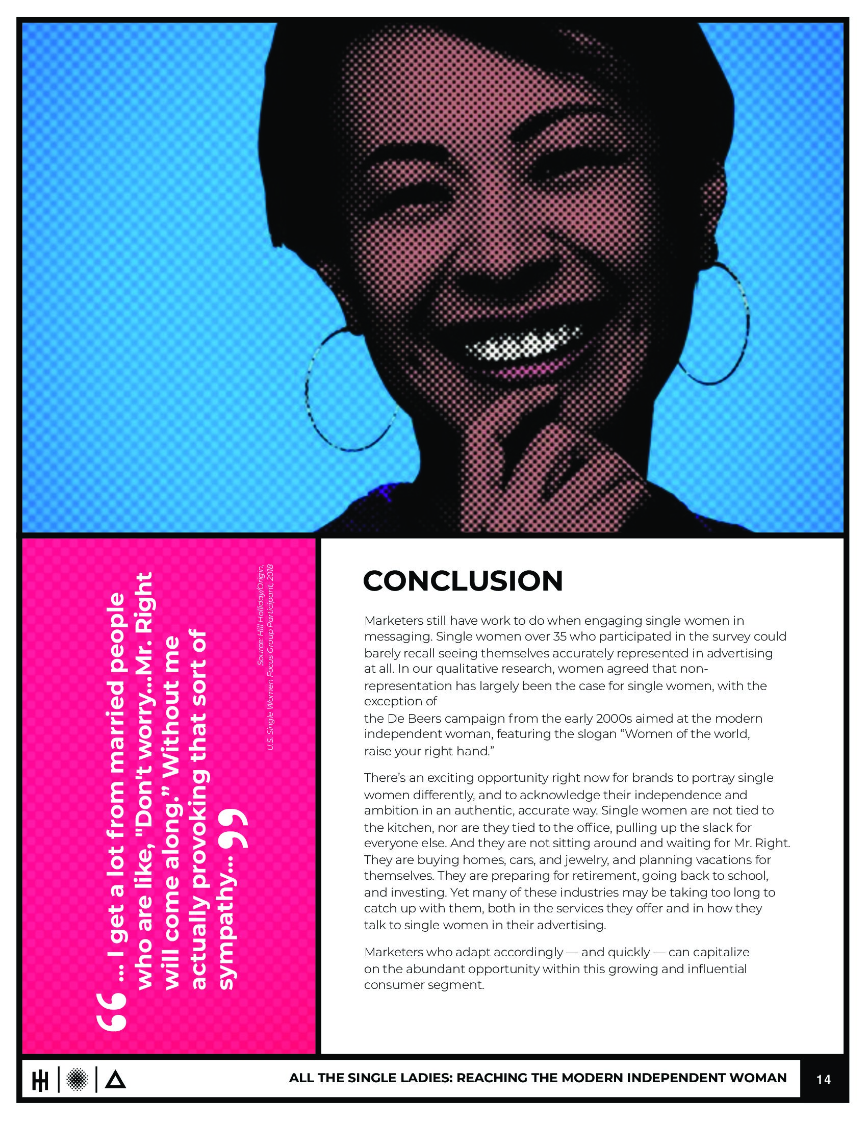 该报告指出,美国妇女中的单身人口数量几乎和已婚一样多。然而,接受调查的30-45岁单身女性中几乎有一半(48%)认为单身女性在广告中“不存在”,还有差不多的单身女性认为广告中存在性别不平等现象(44%),尤其是家居购买、旅游、汽车、金融规划和保险方面的广告。