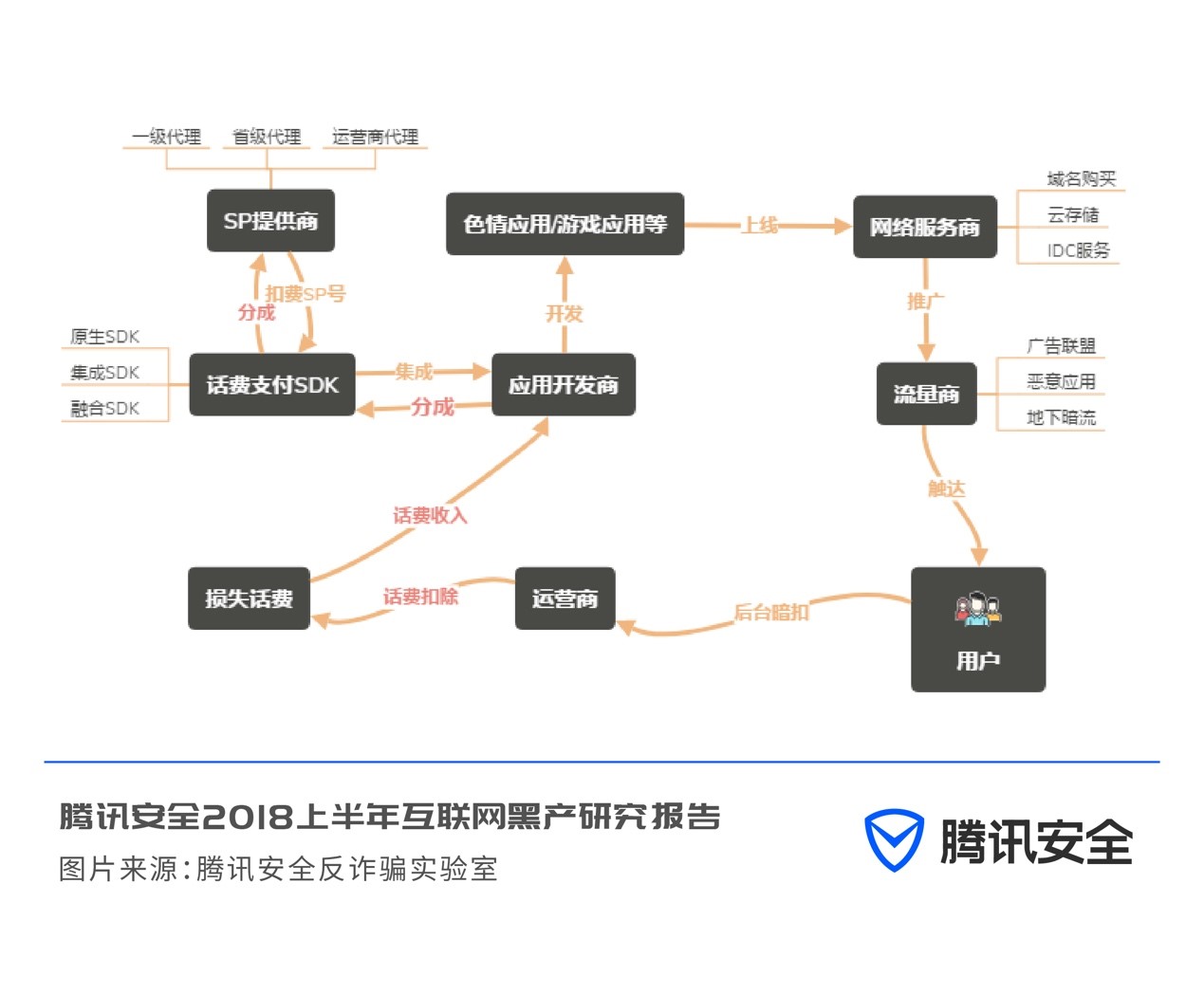 腾讯安全反诈骗实验室研究发现,此类黑产以稀缺的SP提供商为上游,SDK根据掌握的不同SP资源开发相应的SDK,并将这些SDK植入到伪装成色情、游戏、交友等容易吸引网民的应用中。实现暗扣话费变现后,利润通过分成的方式被整个产业链瓜分。此类黑产核心的扣费SDK开发团队大概有20家左右,主要分布在北京、深圳、杭州等地。