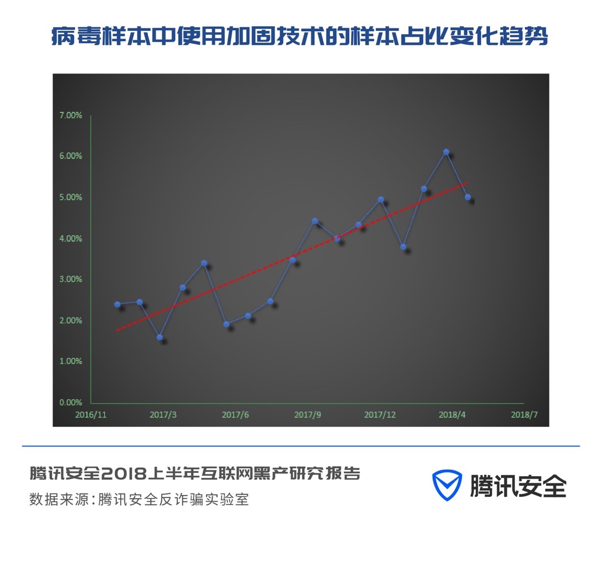 目前国内外有很多成熟的加固方案解决厂商,这些厂商存在很多先进的加固技术和较完善的兼容性解决方案,但是这些方案解决商的这些优点正成为黑产很好的保护伞。根据腾讯安全反诈骗实验室的数据显示,进入2018年以后利用这些知名加固解决方案的病毒应用正在快速增加。