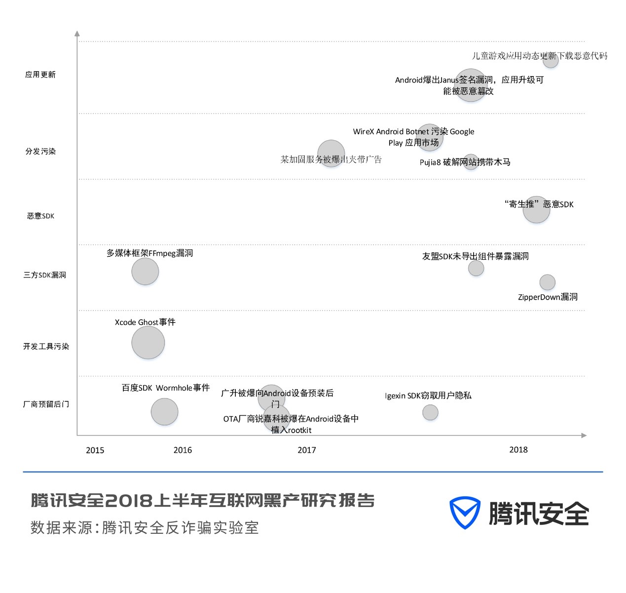 2018年,伴随移动应用的影响力超过电脑应用,主要互联网黑产也迁移到手机平台。腾讯安全反诈骗实验室观测数据表明,以持续多年的暗扣费黑产、恶意移动广告黑产、手机应用分发黑产、App推广刷量黑产为典型,这些移动端的互联网黑产,给用户和软件开发者带来了巨大的经济损失。