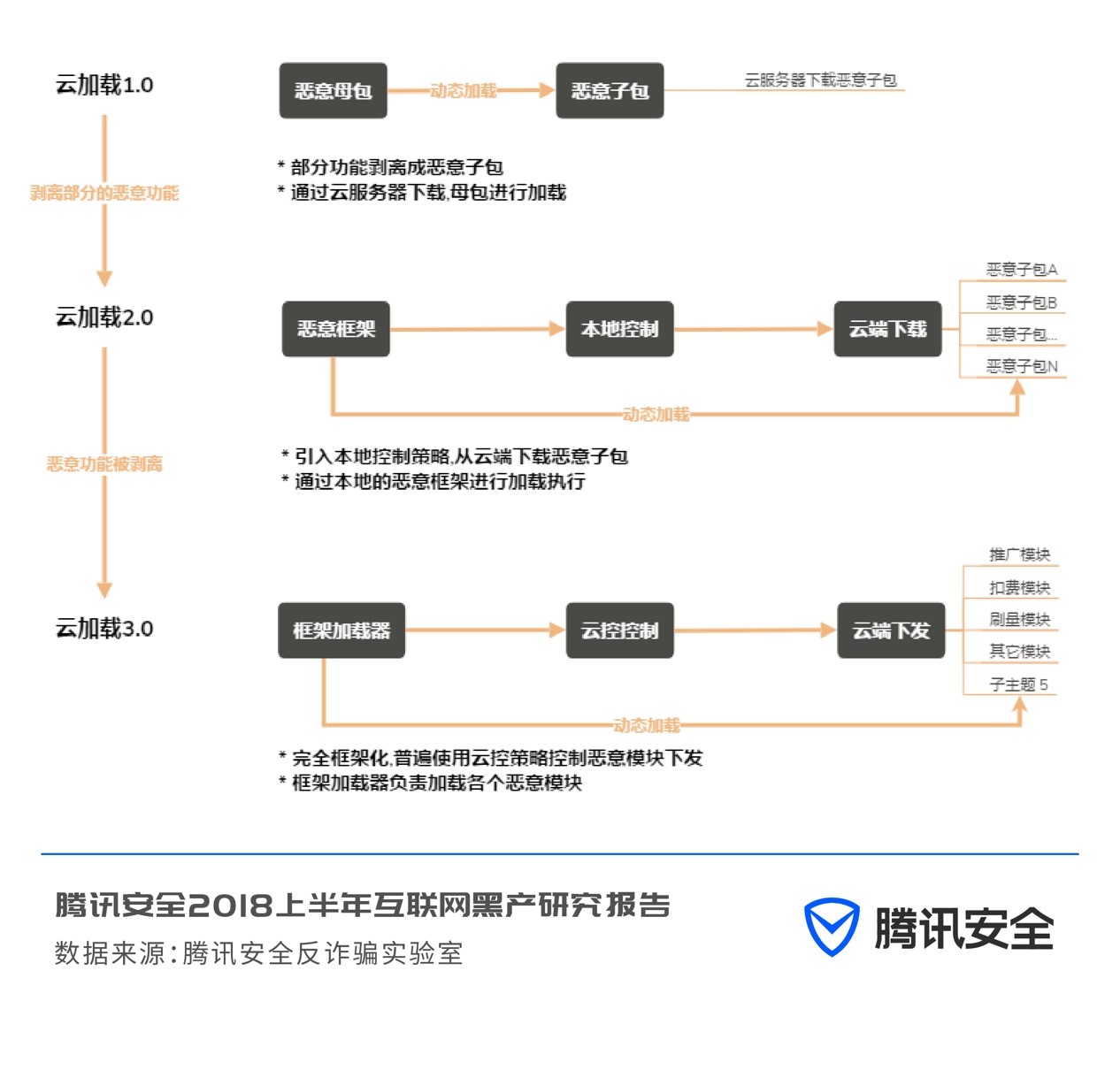 随着恶意应用开发商与安全厂商的攻防日趋激烈和深入,恶意软件的开发者倾向于使用将恶意代码隐藏在云服务器并采用云端控制的方式下发恶意功能,最终通过本地框架进行动态加载来达到最佳隐藏恶意行为的效果,云加载技术是目前对抗传统安全软件最好的对抗手段。