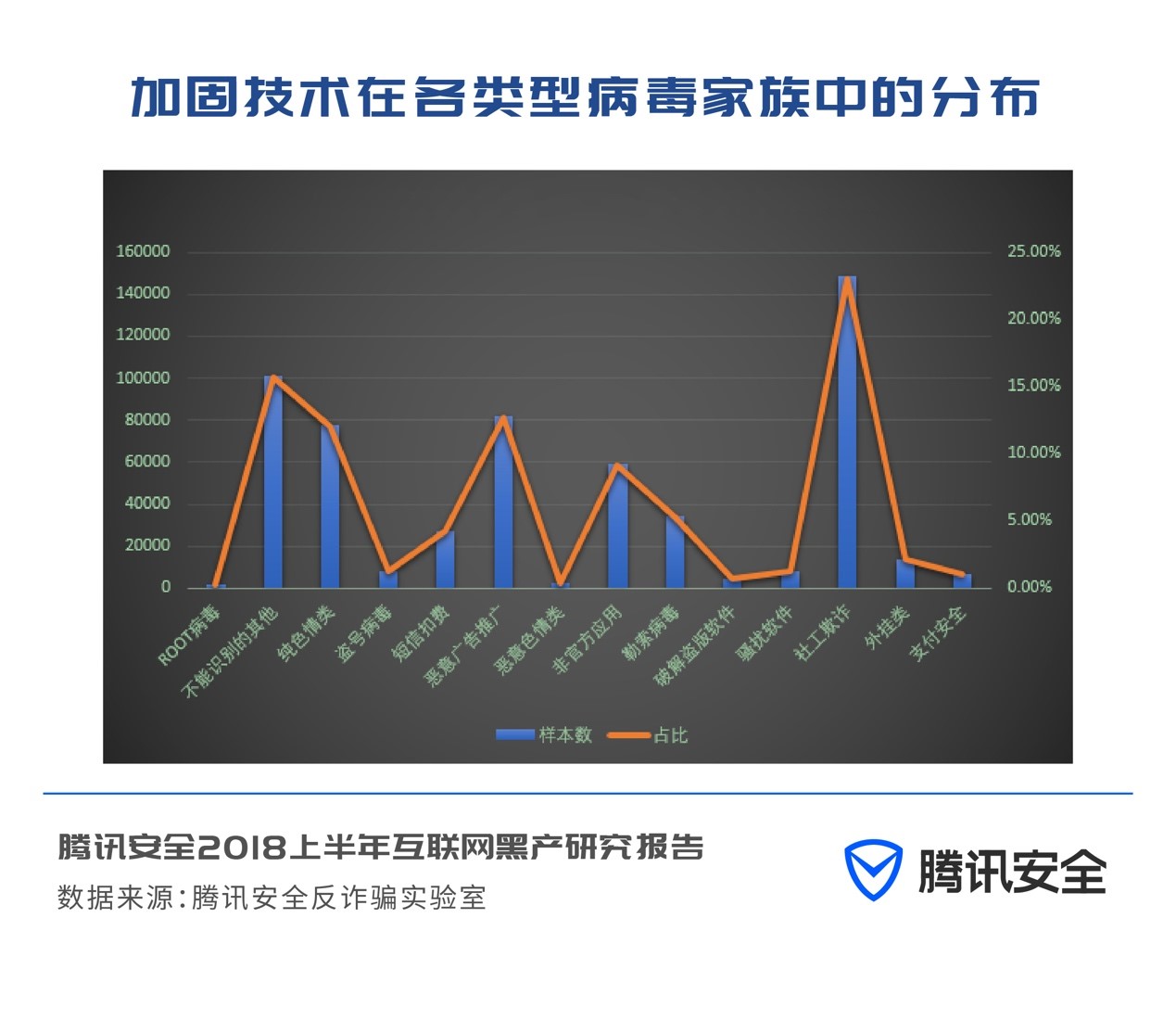 从病毒家族的维度看,社工欺诈类、恶意广告类、色情类、勒索类等对抗更激烈的病毒家族更喜欢使用加固技术来保护自己。