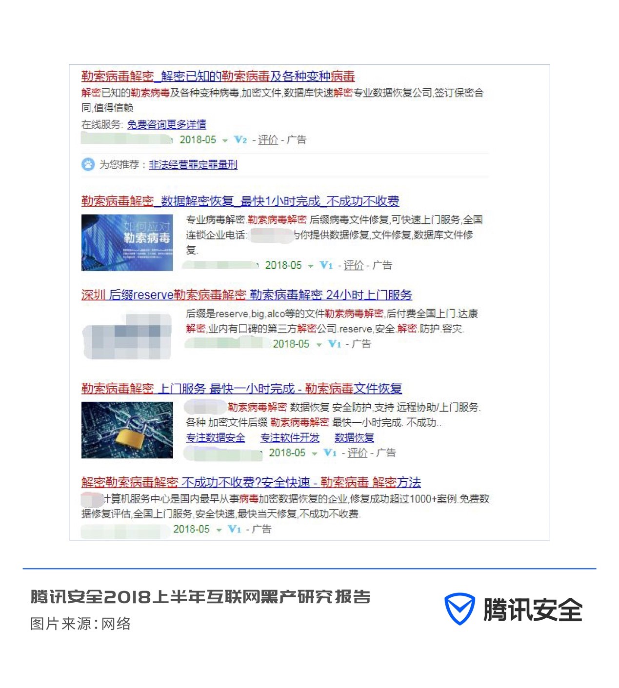 病毒一旦得手,企业日常业务立刻陷于崩溃状态,关键业务因此停摆。如果企业网管发现连备份系统也一样被破坏了。那基本只剩下一条路:缴纳赎金。众所周知,勒索病毒的加密技术是高强度的非对称加密,除非得到密钥,解密在理论上都是不可能的。正因为如此,腾讯御见威胁情报中心监测发现了这个不为人知的奇葩产业链:勒索病毒解密产业链。