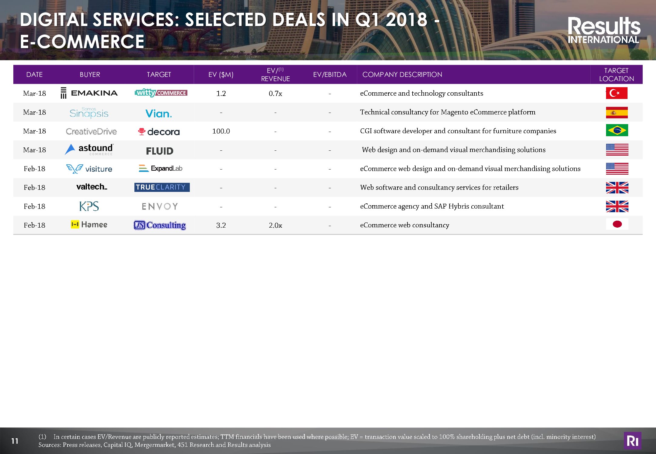 第一季度全球交易量(宣布)达到97笔,而2017年第四季度只有75笔。定制软件和系统整合(57笔)是最活跃的网络服务分支,其次是策略、UX、设计&建造(18笔),电子商务(8笔),移动应用开发(7),以及数据和分析(7笔)。