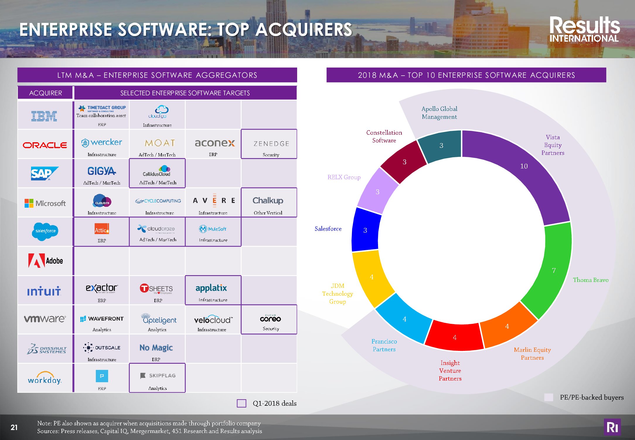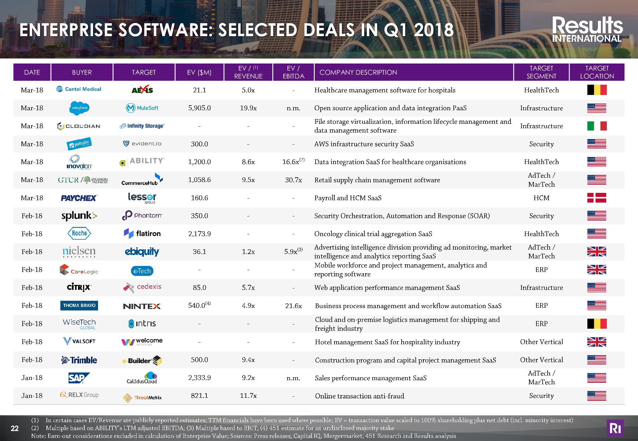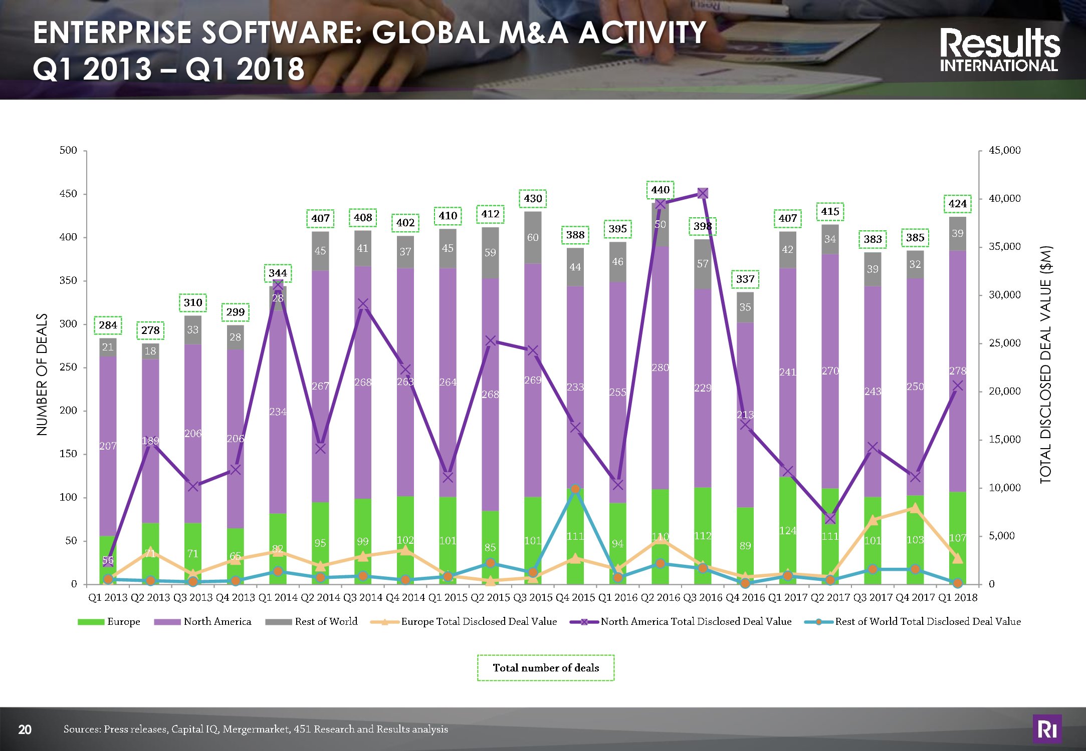 企业软件行业是第一季度交易最活跃的,共宣布了424笔,是自2016年第二季度以来最高的一个季度。北美继续领先。2018年剩下的时间里企业软件市场依然充满机遇。