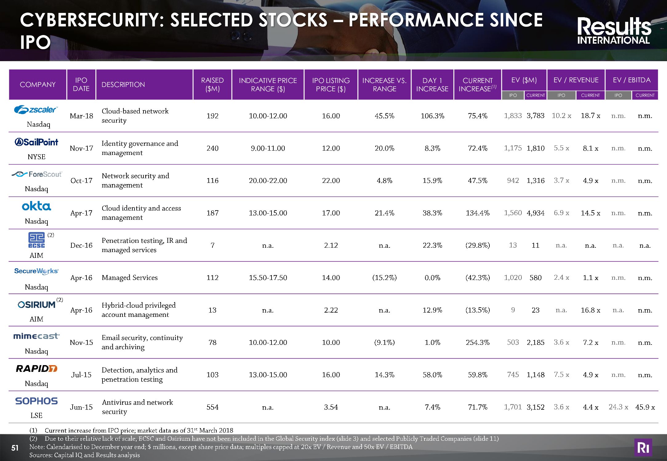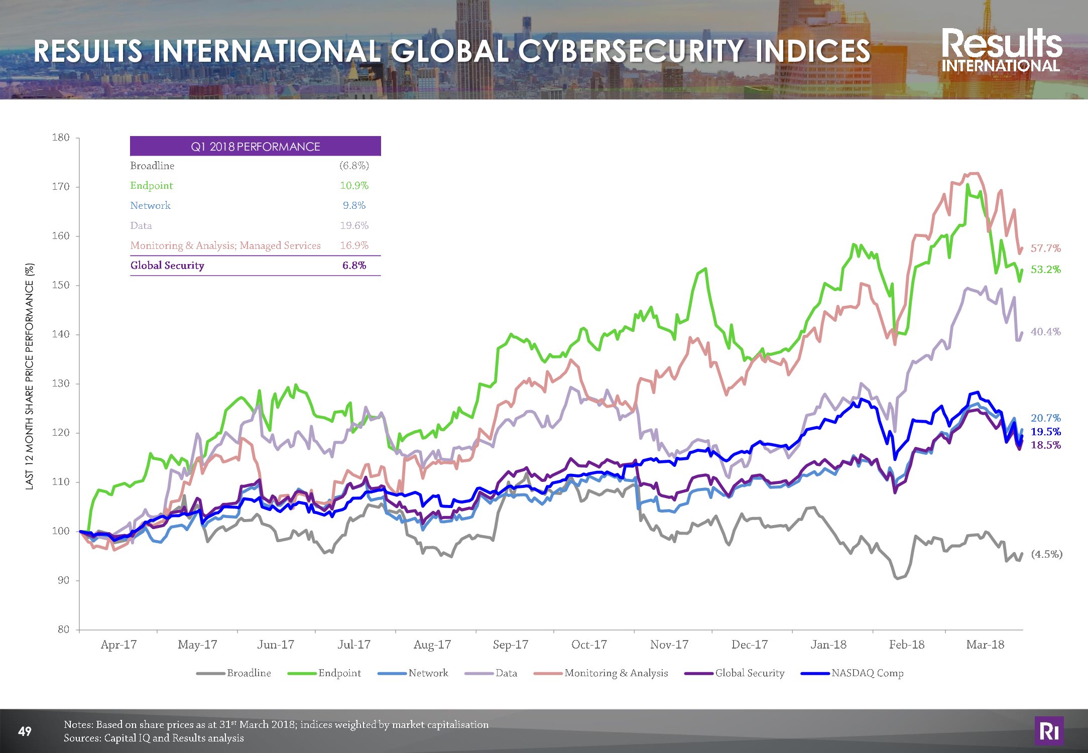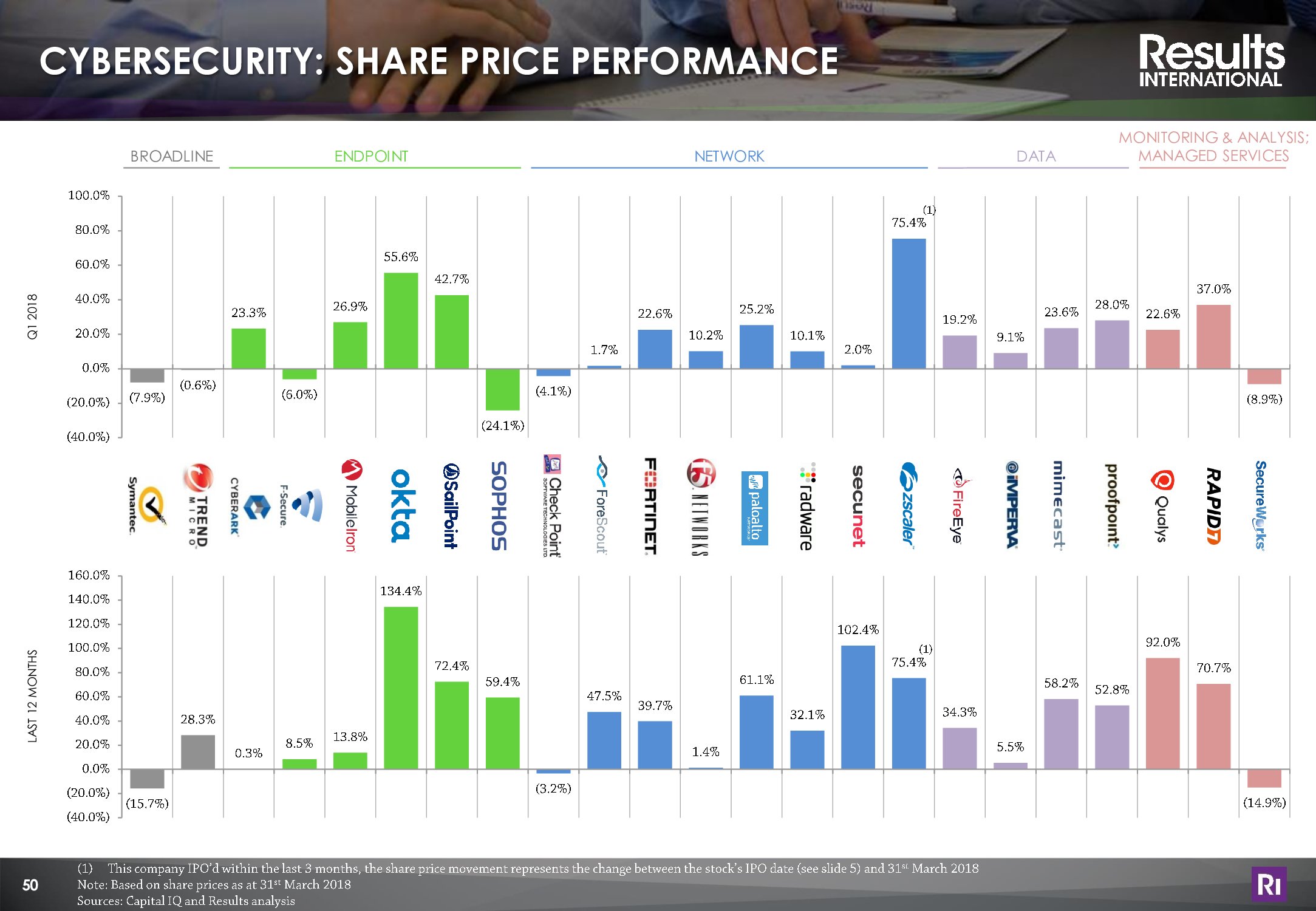 第一季度网络安全领域增长强劲,得益于同期相关股市的持续增长。过去几个季度数据安全重新成为一个热门话题,特别是对Facebook的严格审查,以及欧洲GDPR的事实。网络安全指数在过去12个月增长18.5%。第一季度网络安全指数增长6.8%。