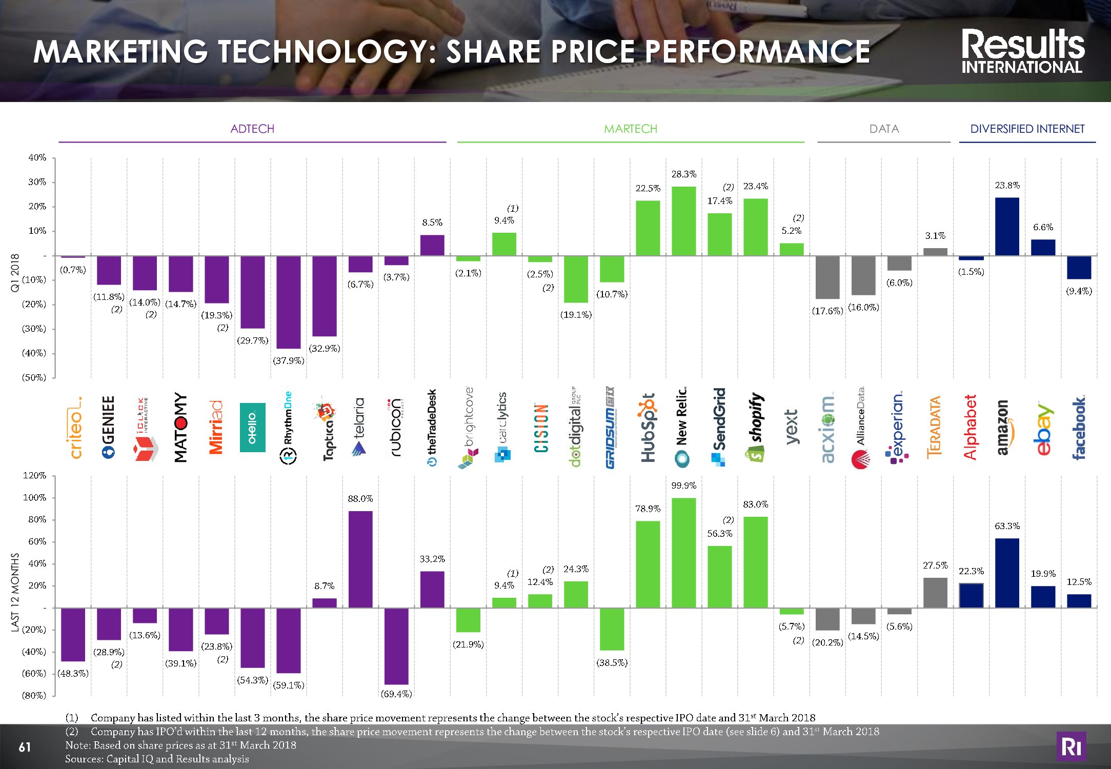 第一季度营销科技和广告科技继续沿着相反的道路发展。营销科技指数在2017年维持强劲,过去12个月增长68%,尽管在3月快速下滑。相反,广告科技则继续下跌,指数下降6%。