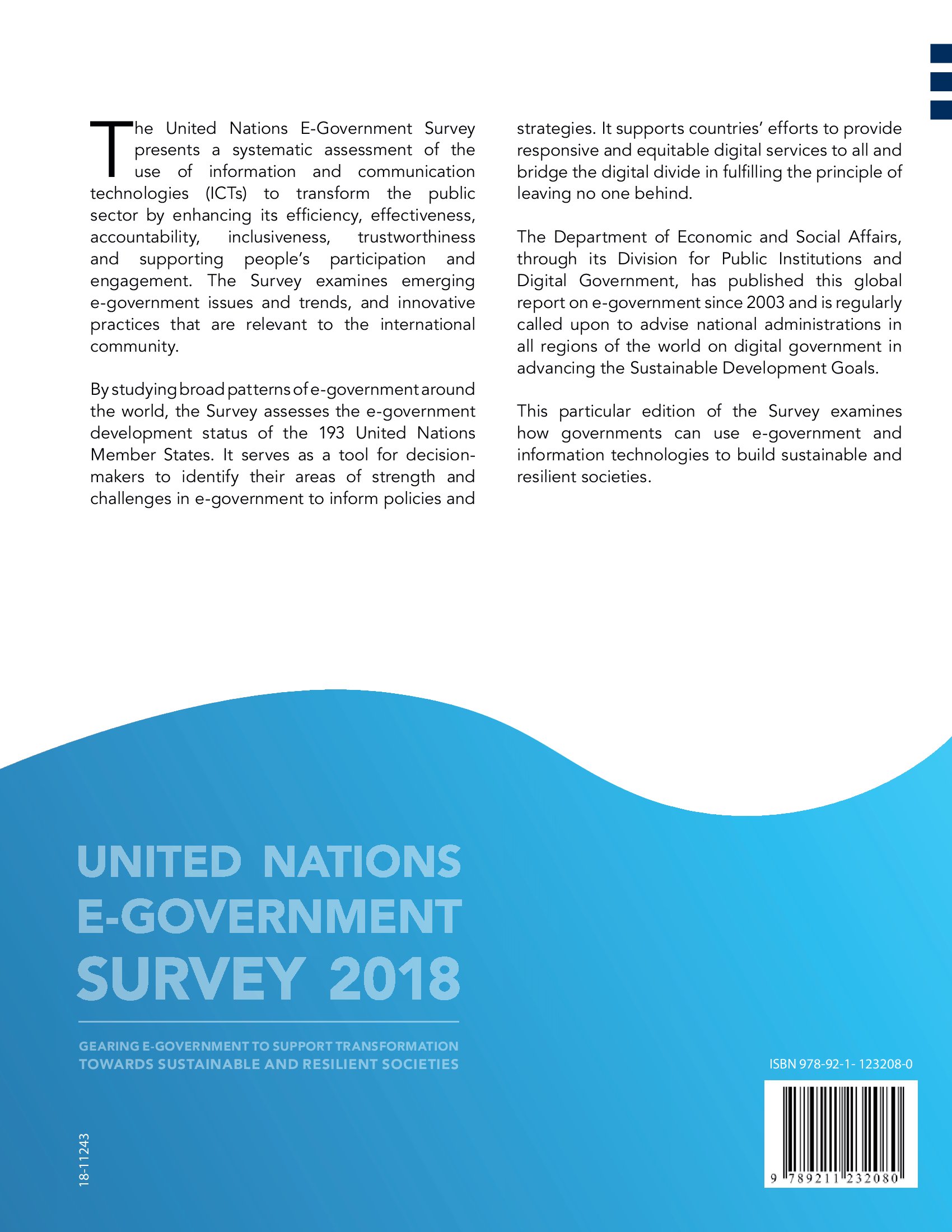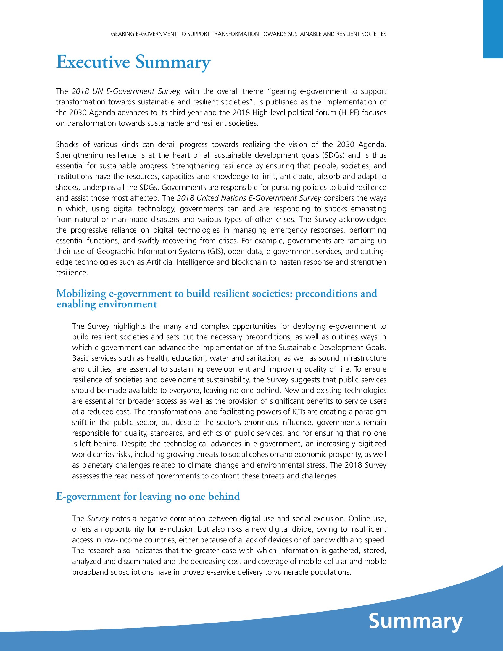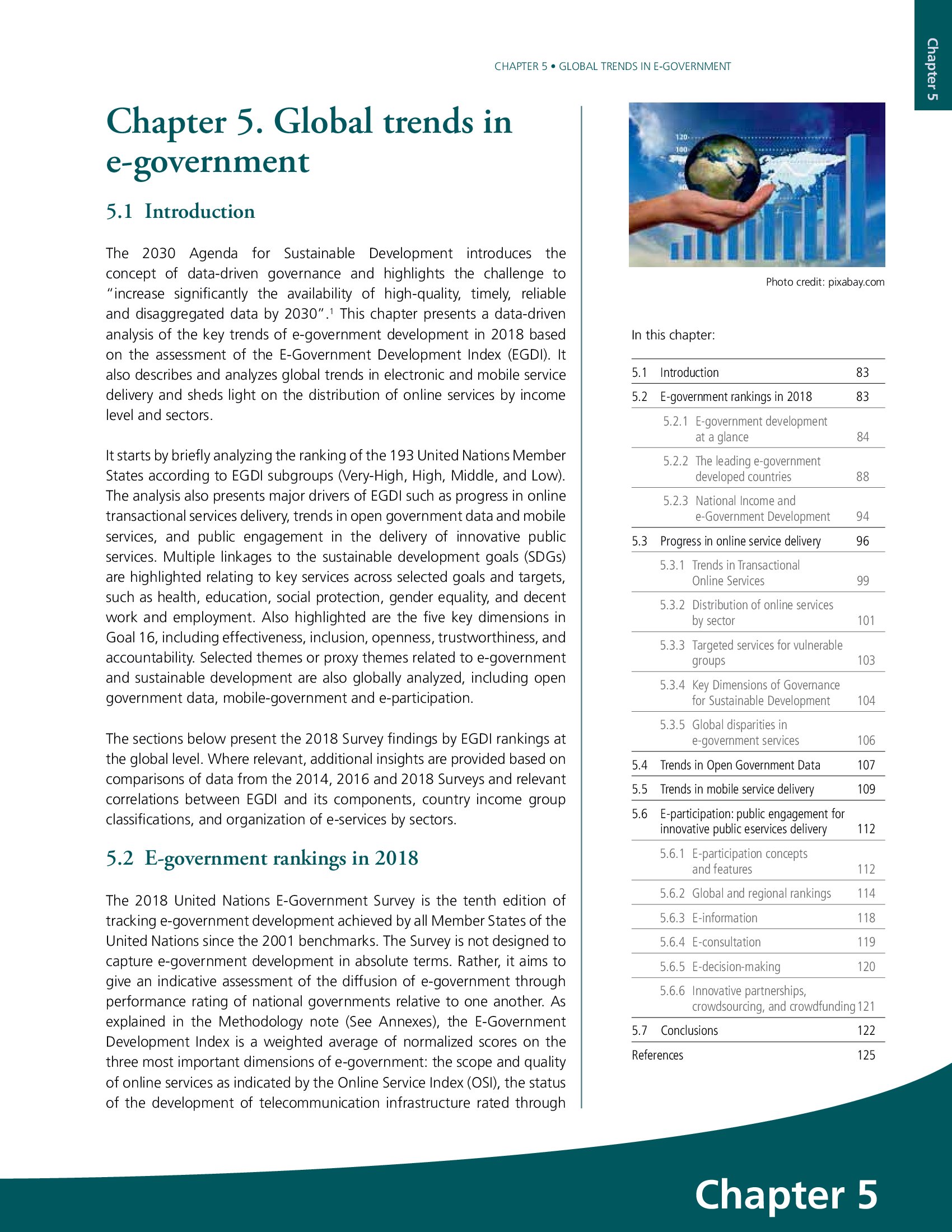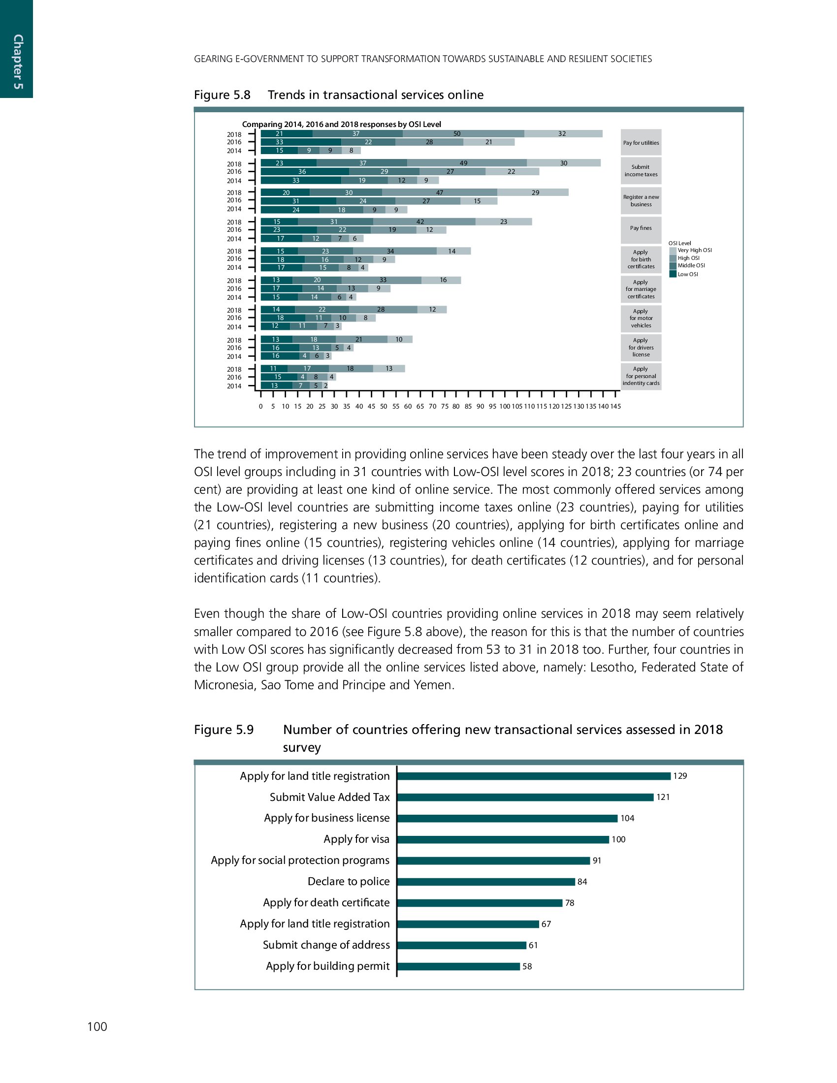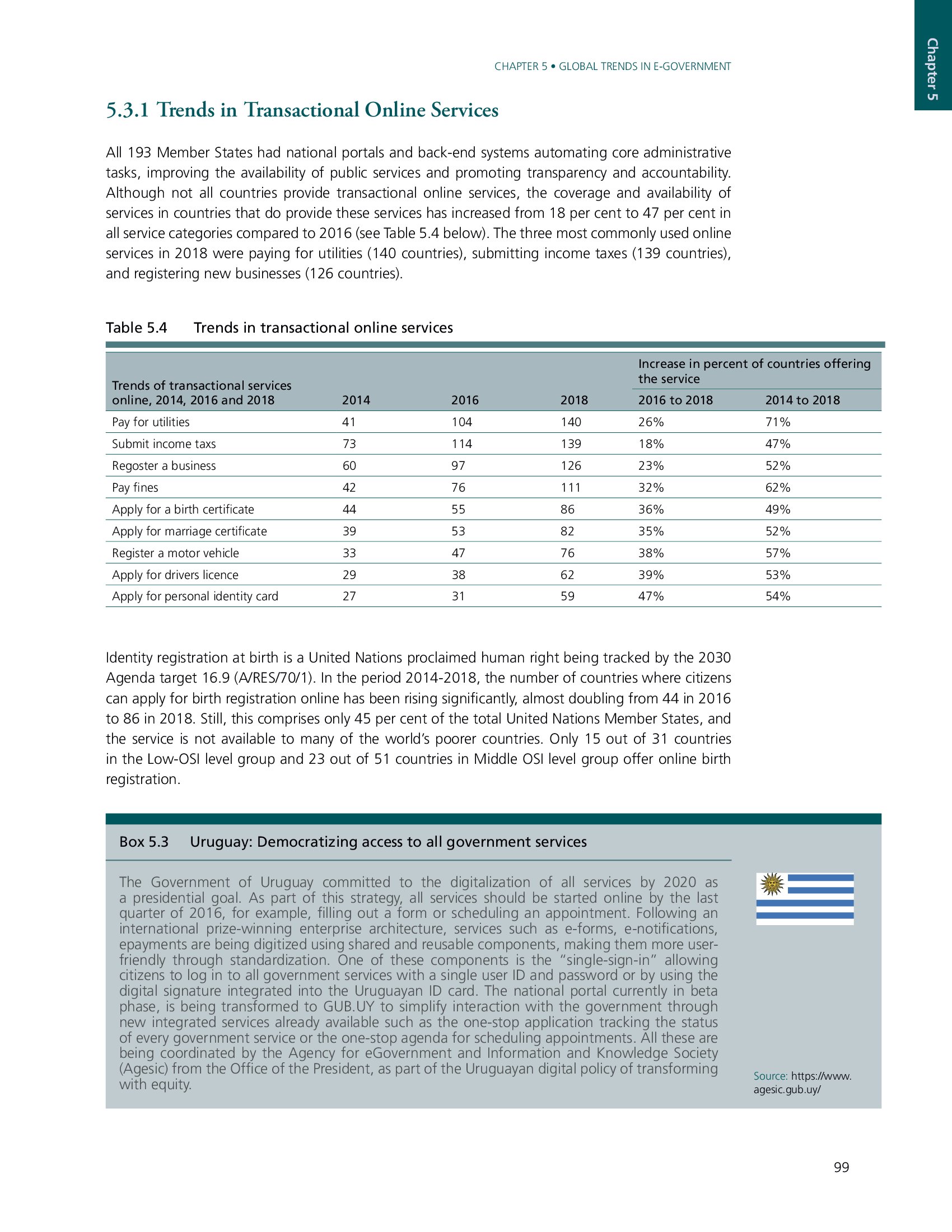 联合国所有193个会员国都拥有政府门户网站和后端系统,以实现核心管理任务的自动化,140个国家的政府网至少提供一项交易服务。最常用的服务是公用事业的支付(140个国家),提交所得税(139),以及注册新业务(126)。