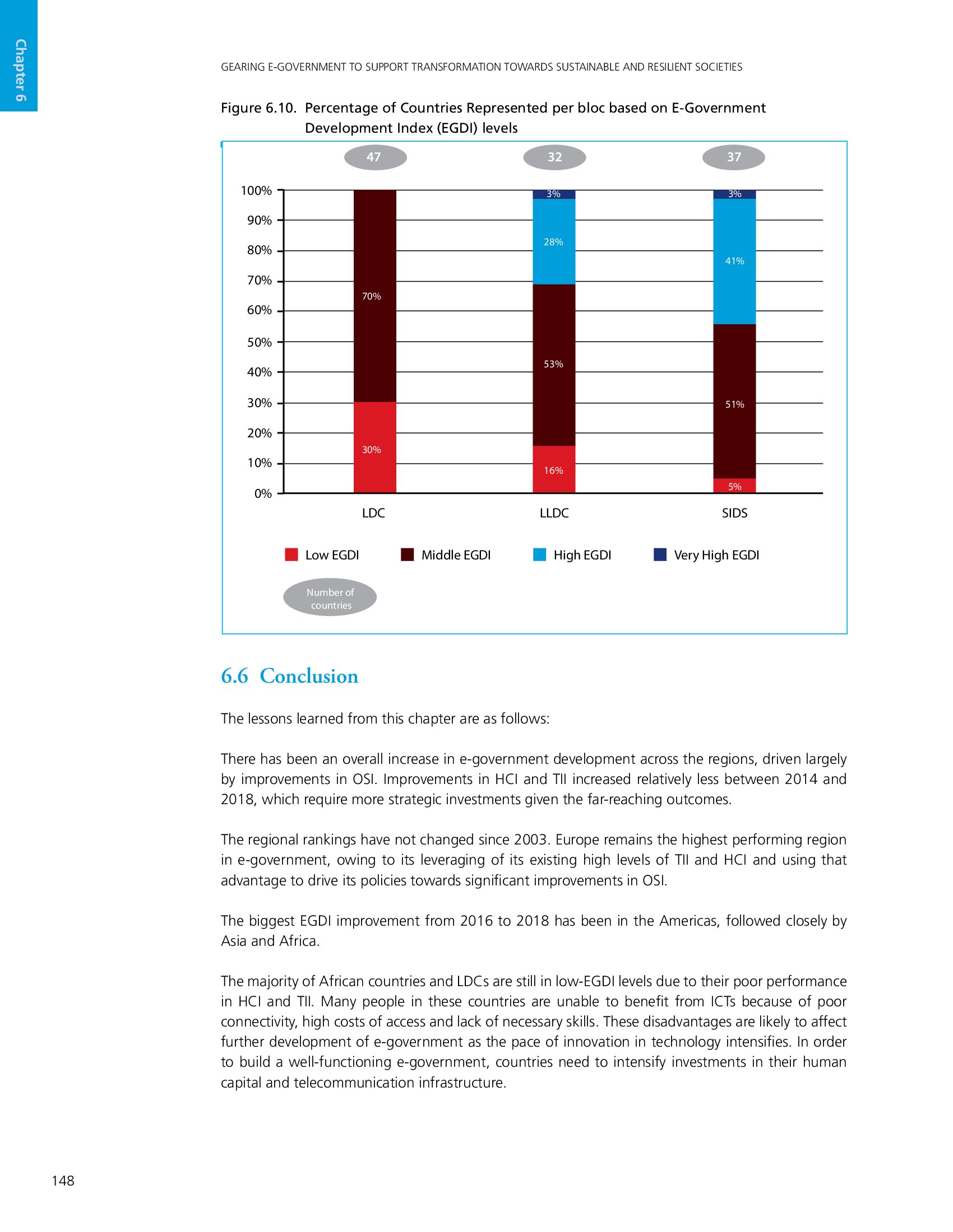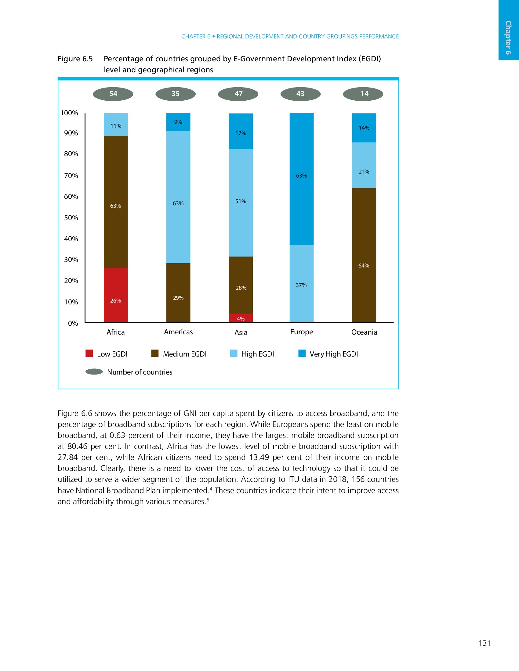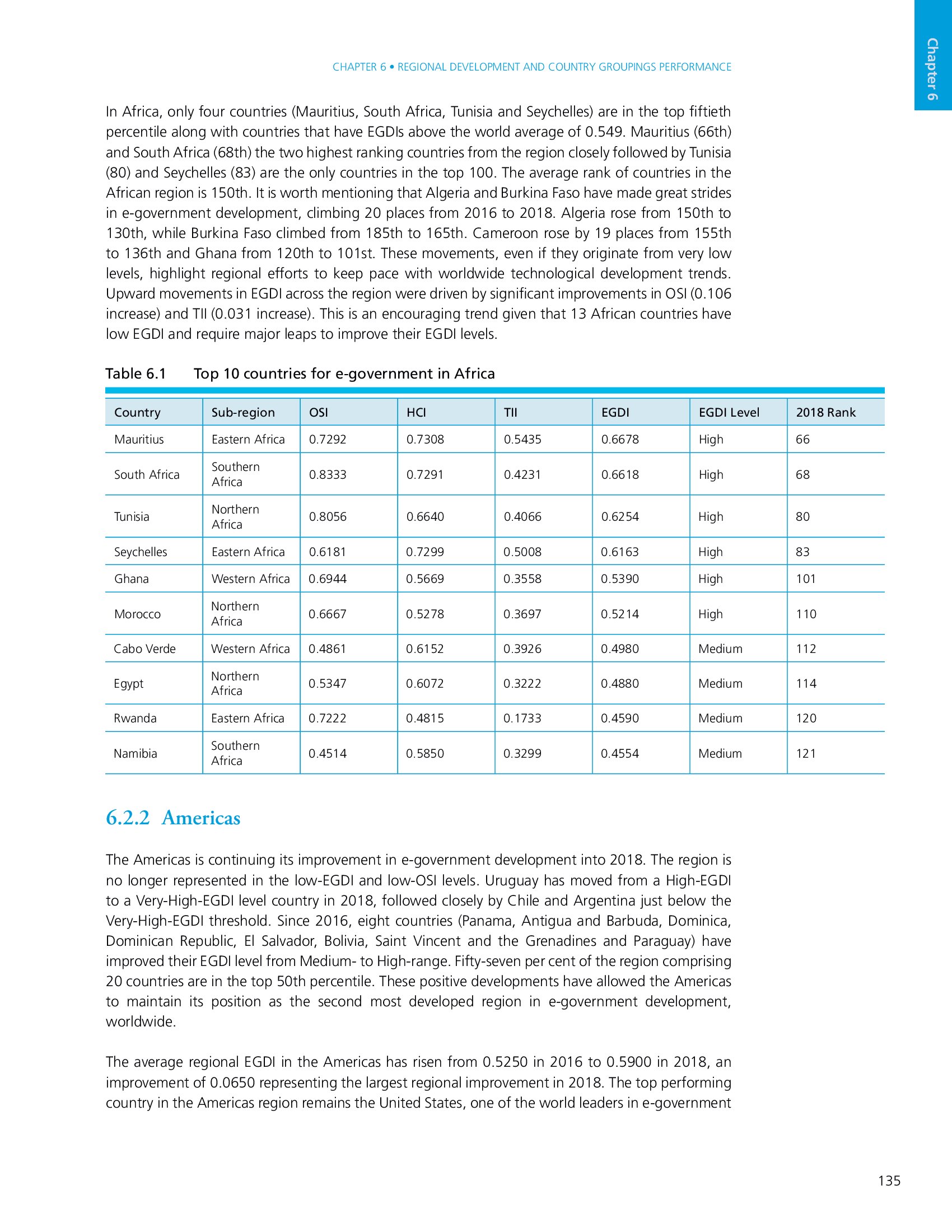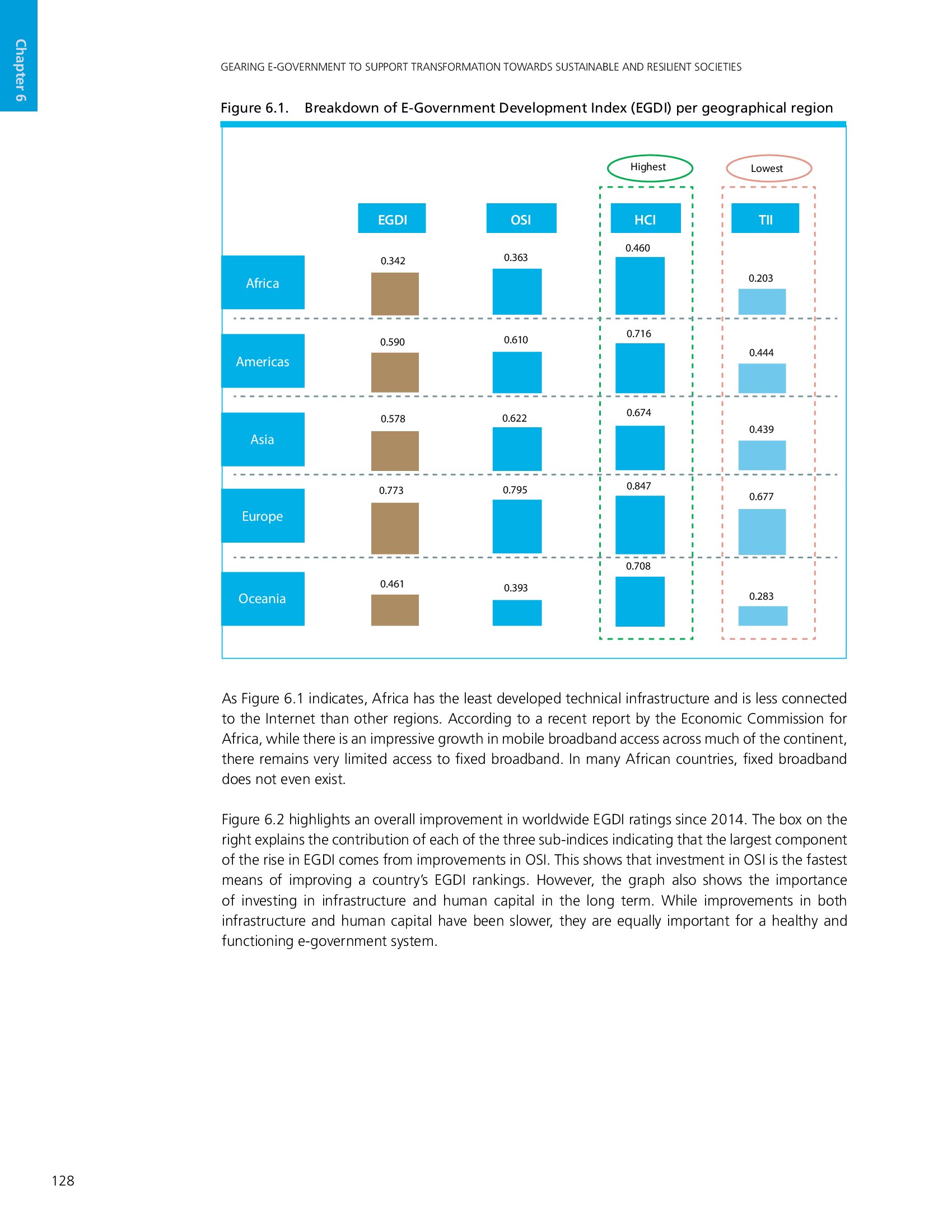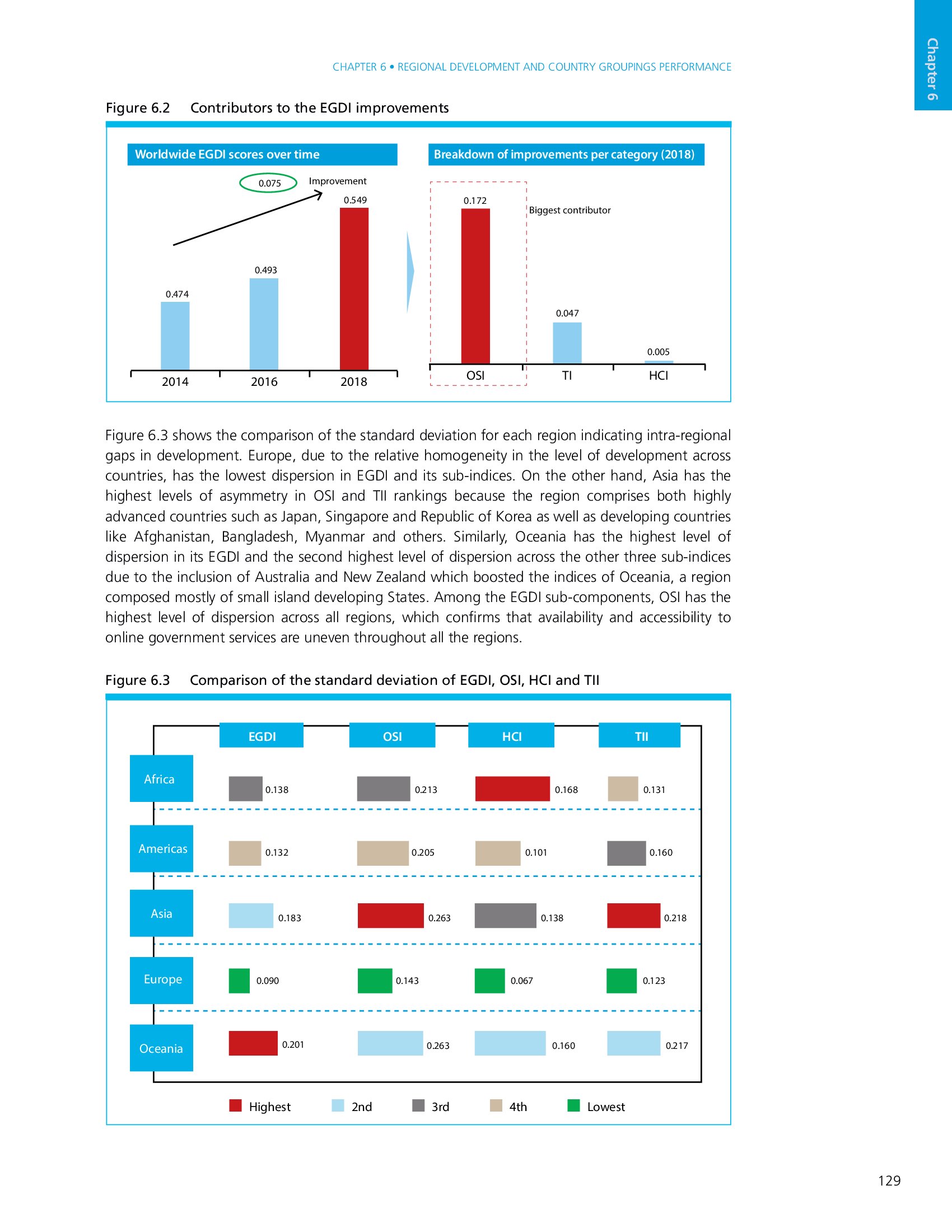 美洲和亚洲的政府发展缓慢。2/3的亚洲国家(47个中的31个)和美洲近一半的国家(35个中的15个)高于世界平均EGDI得分(0.55)。