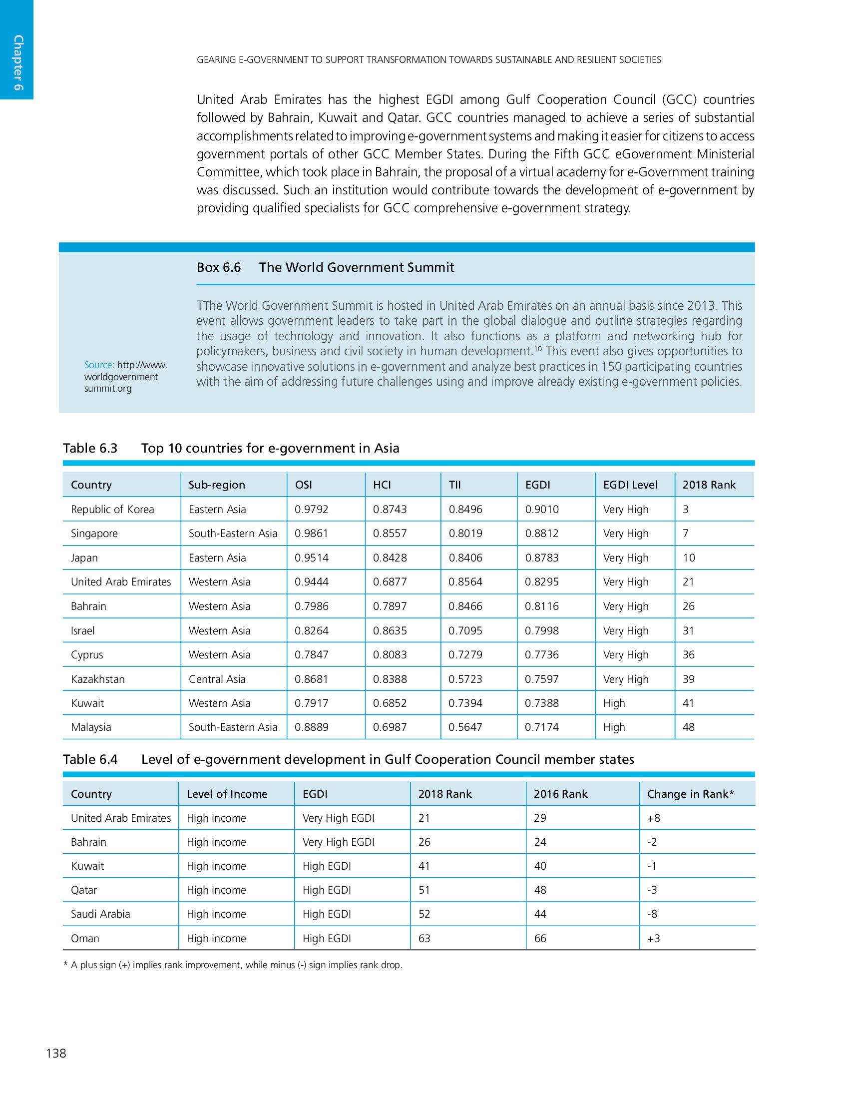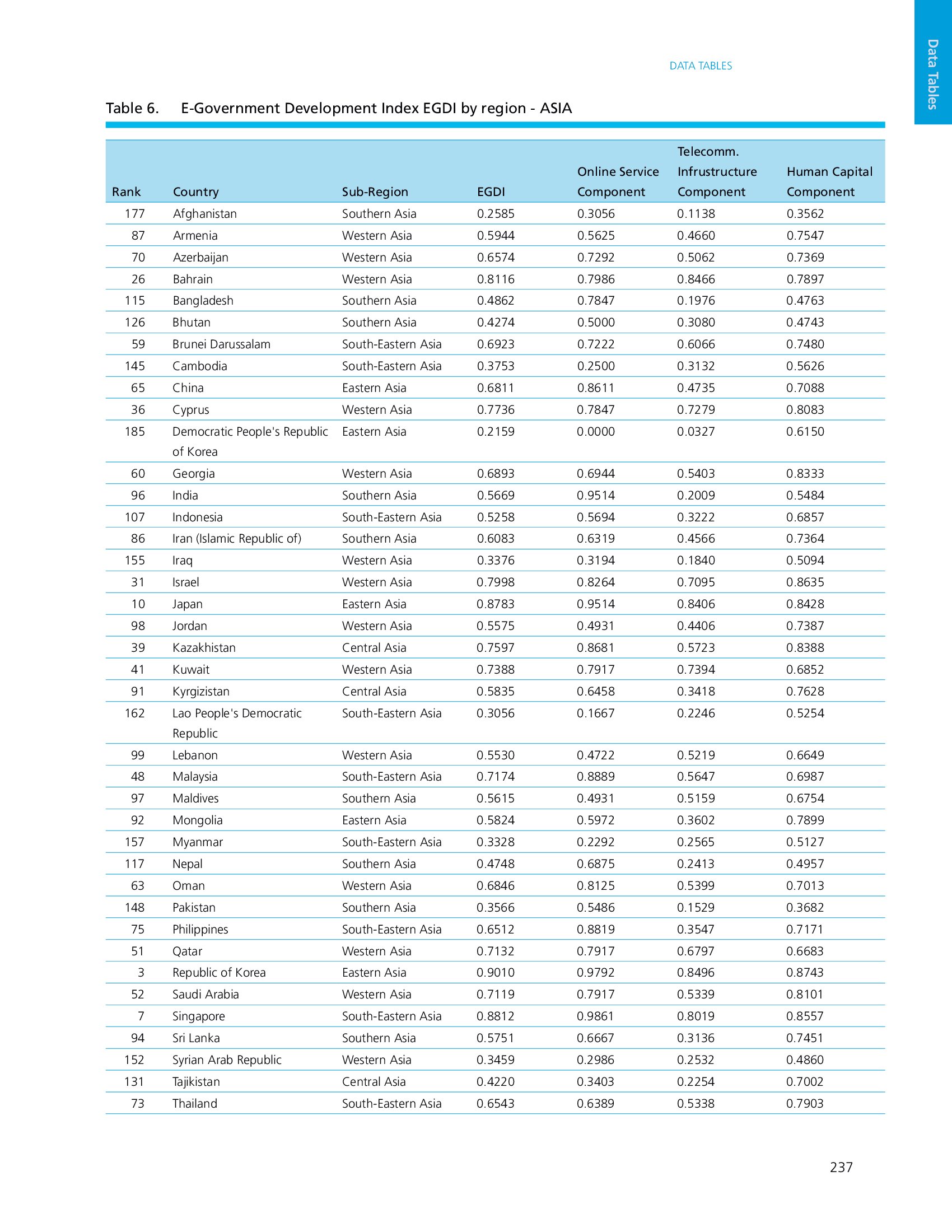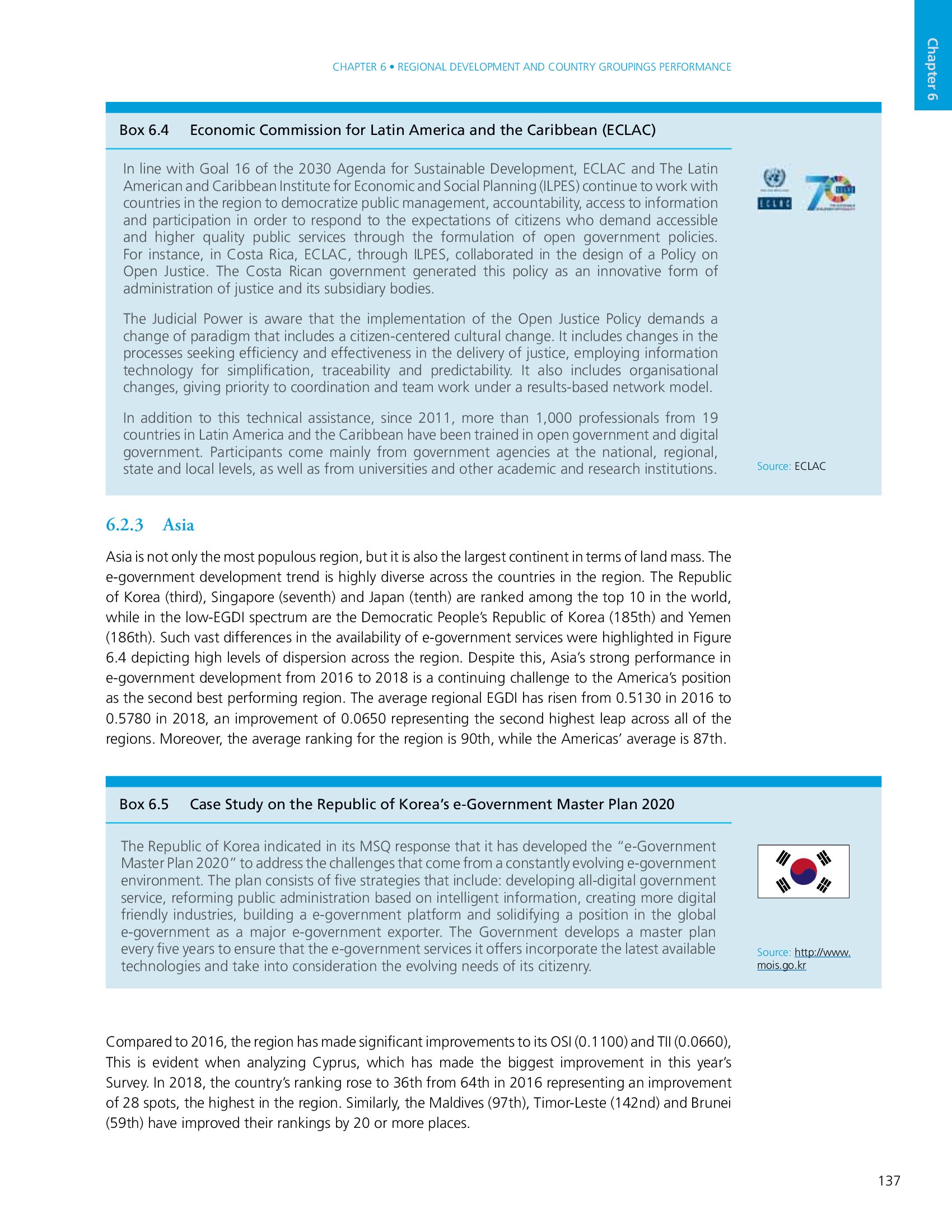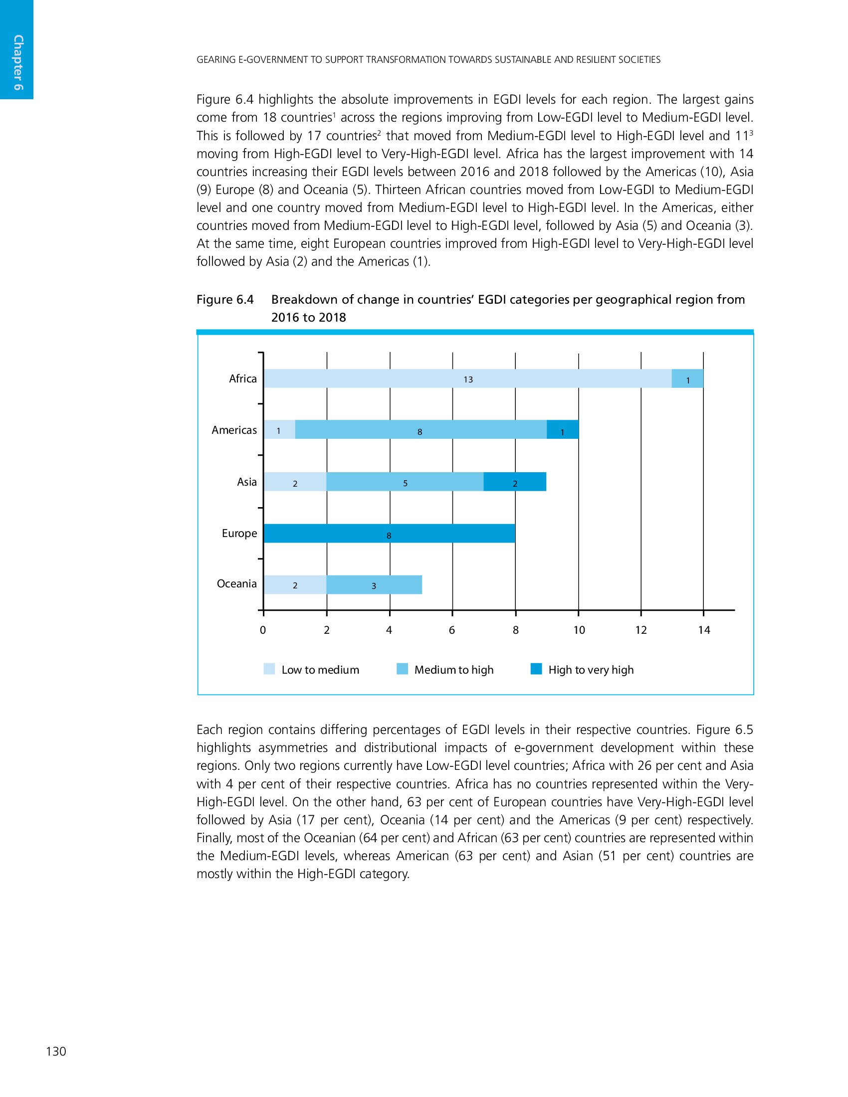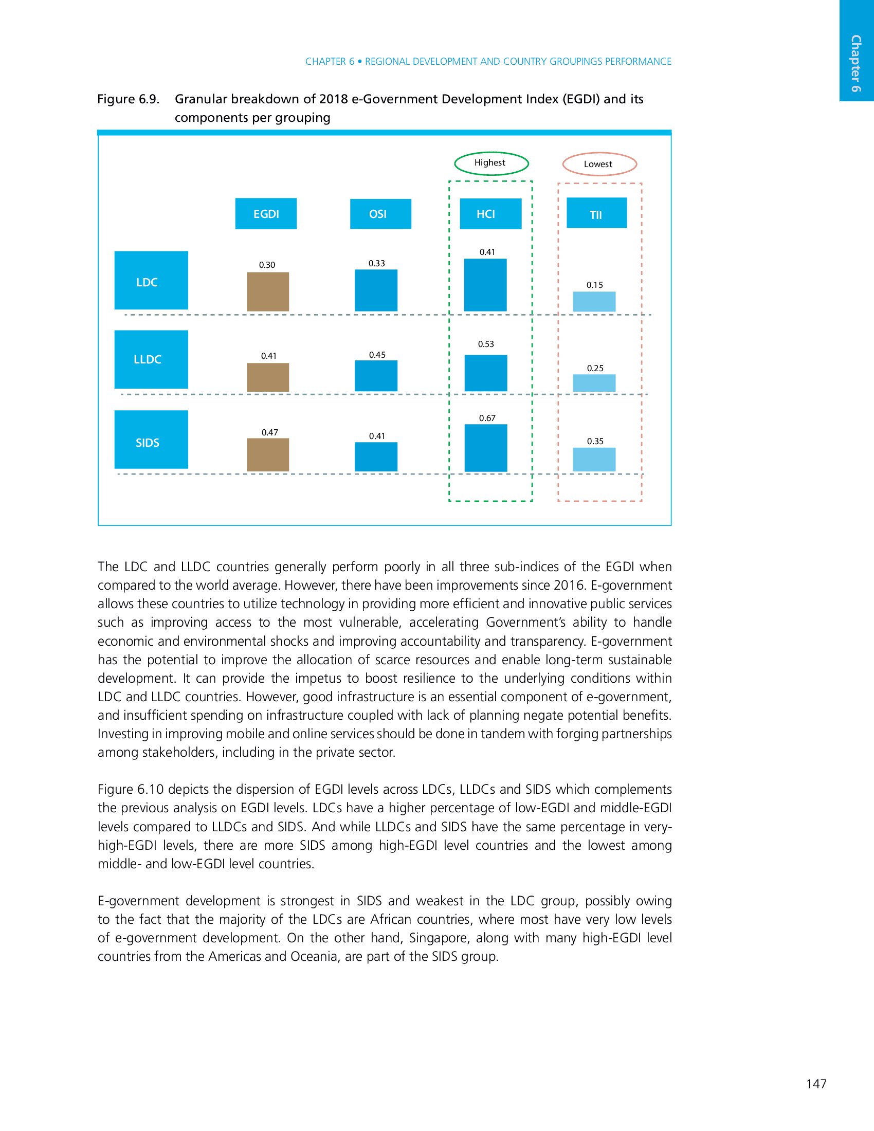美洲和亚洲的政府发展缓慢。2/3的亚洲国家(47个中的31个)和美洲近一半的国家(35个中的15个)高于世界平均EGDI得分(0.55)。
