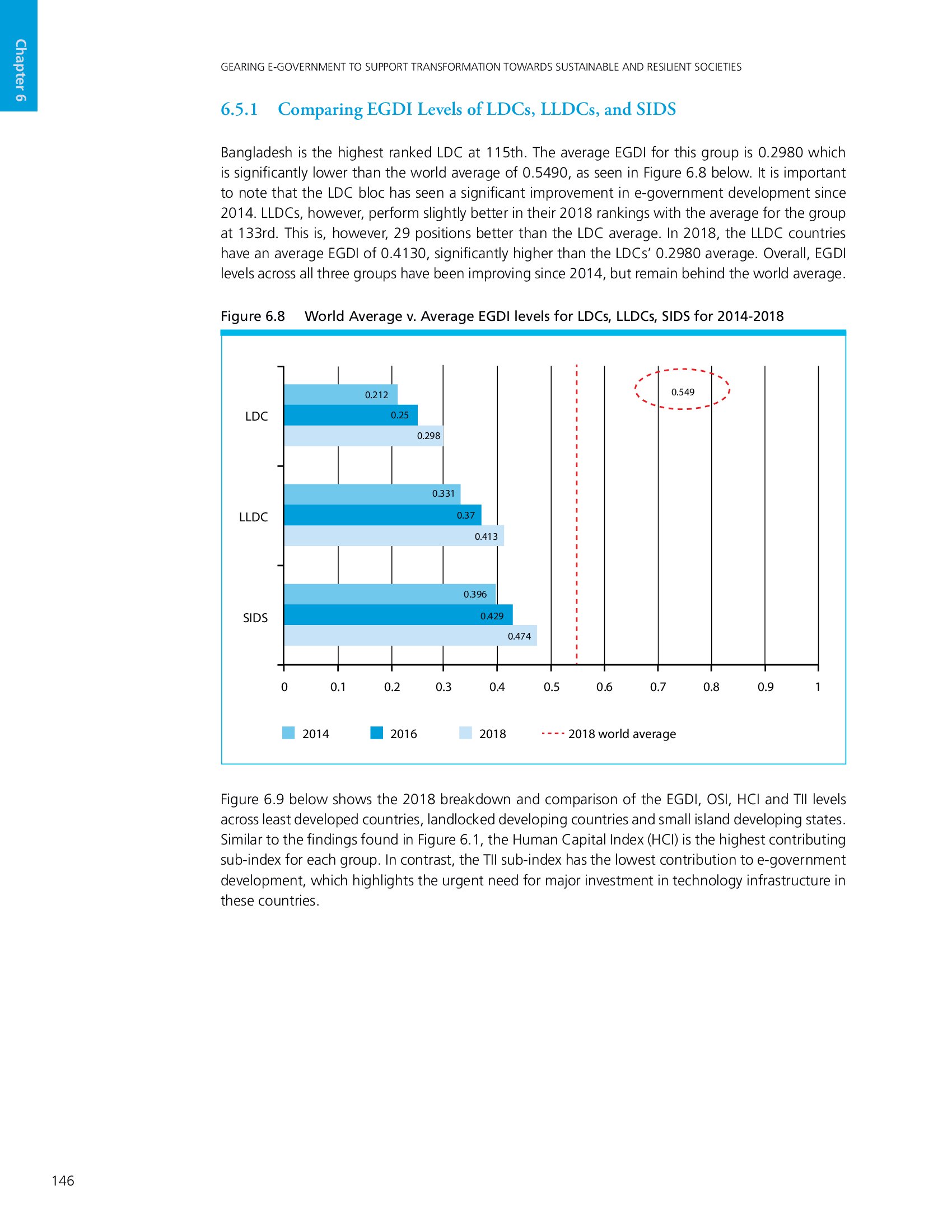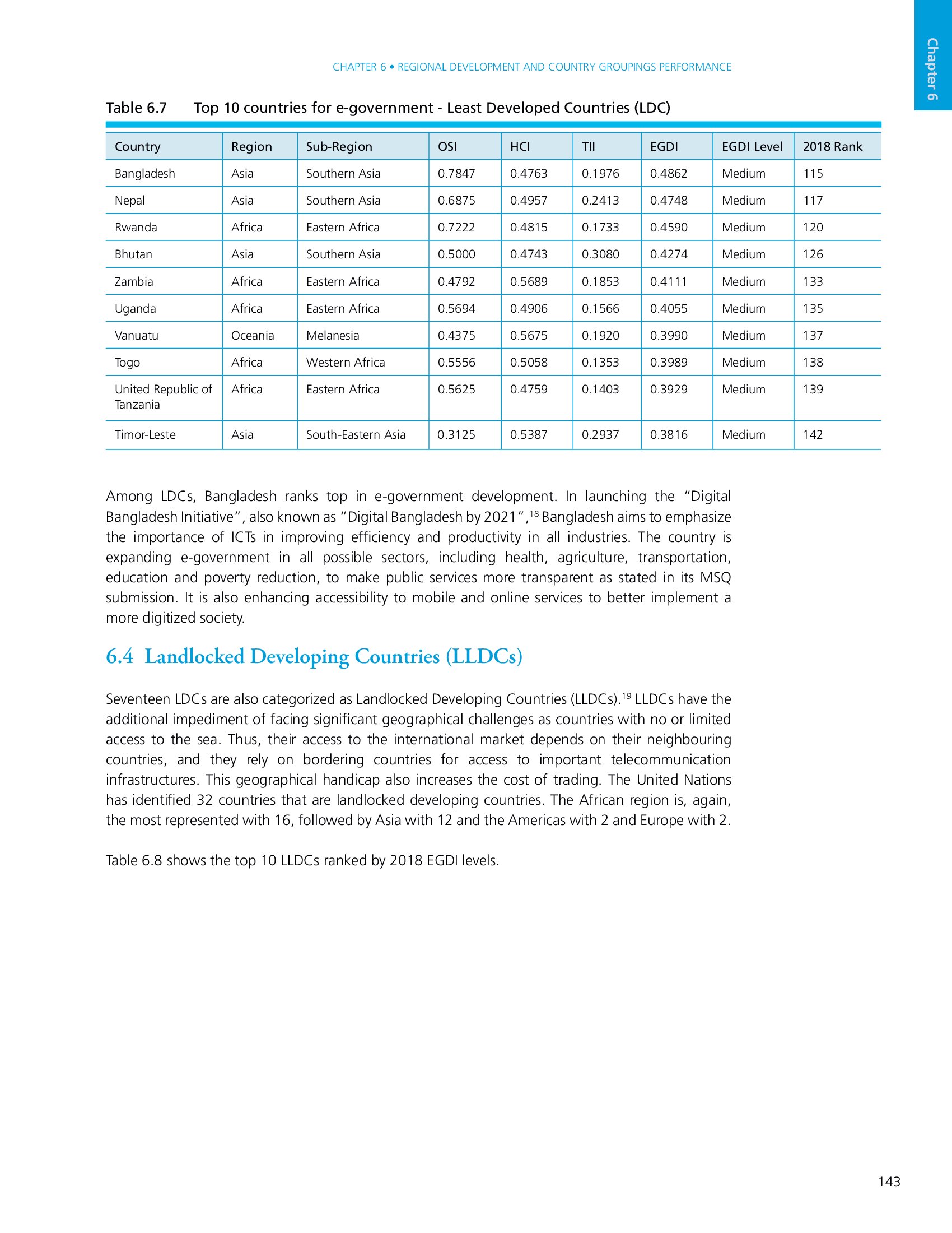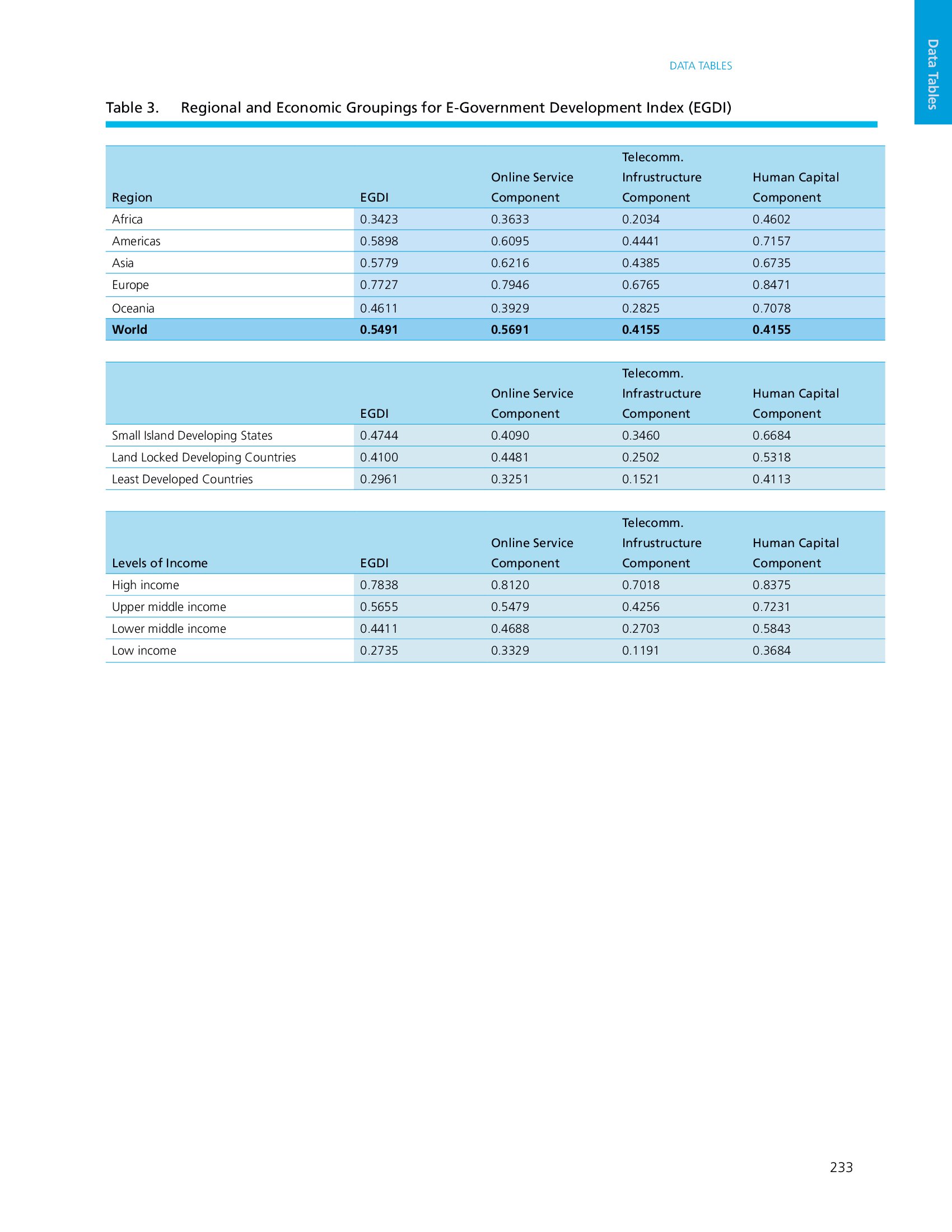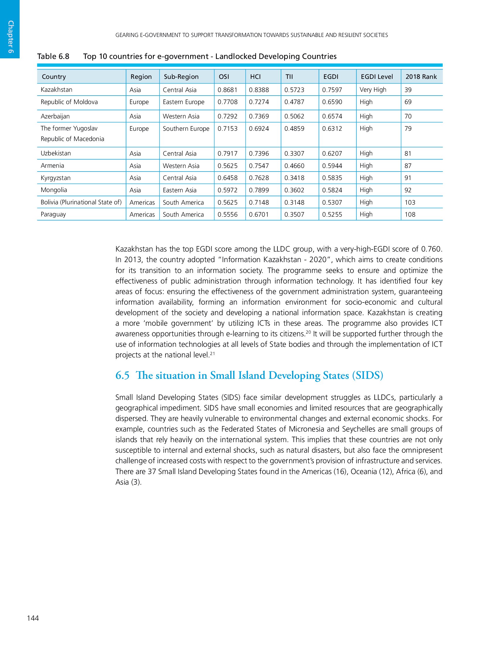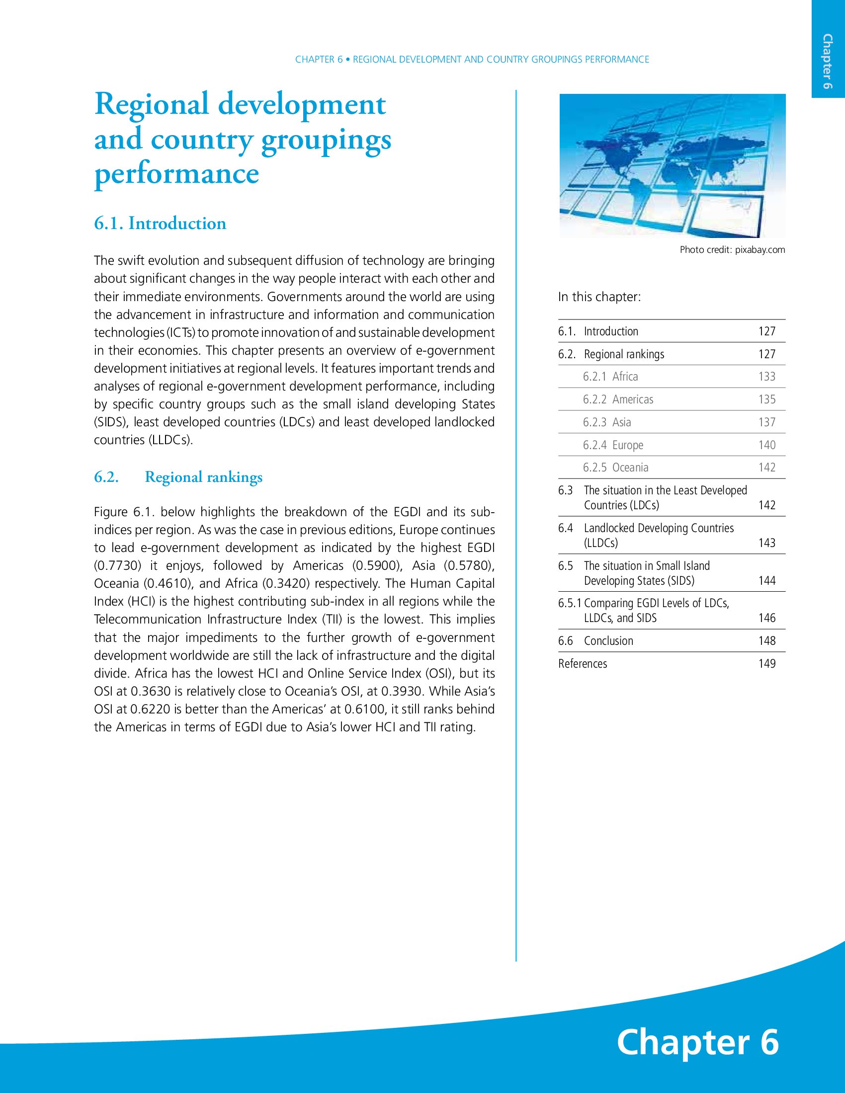 美洲和亚洲的政府发展缓慢。2/3的亚洲国家(47个中的31个)和美洲近一半的国家(35个中的15个)高于世界平均EGDI得分(0.55)。