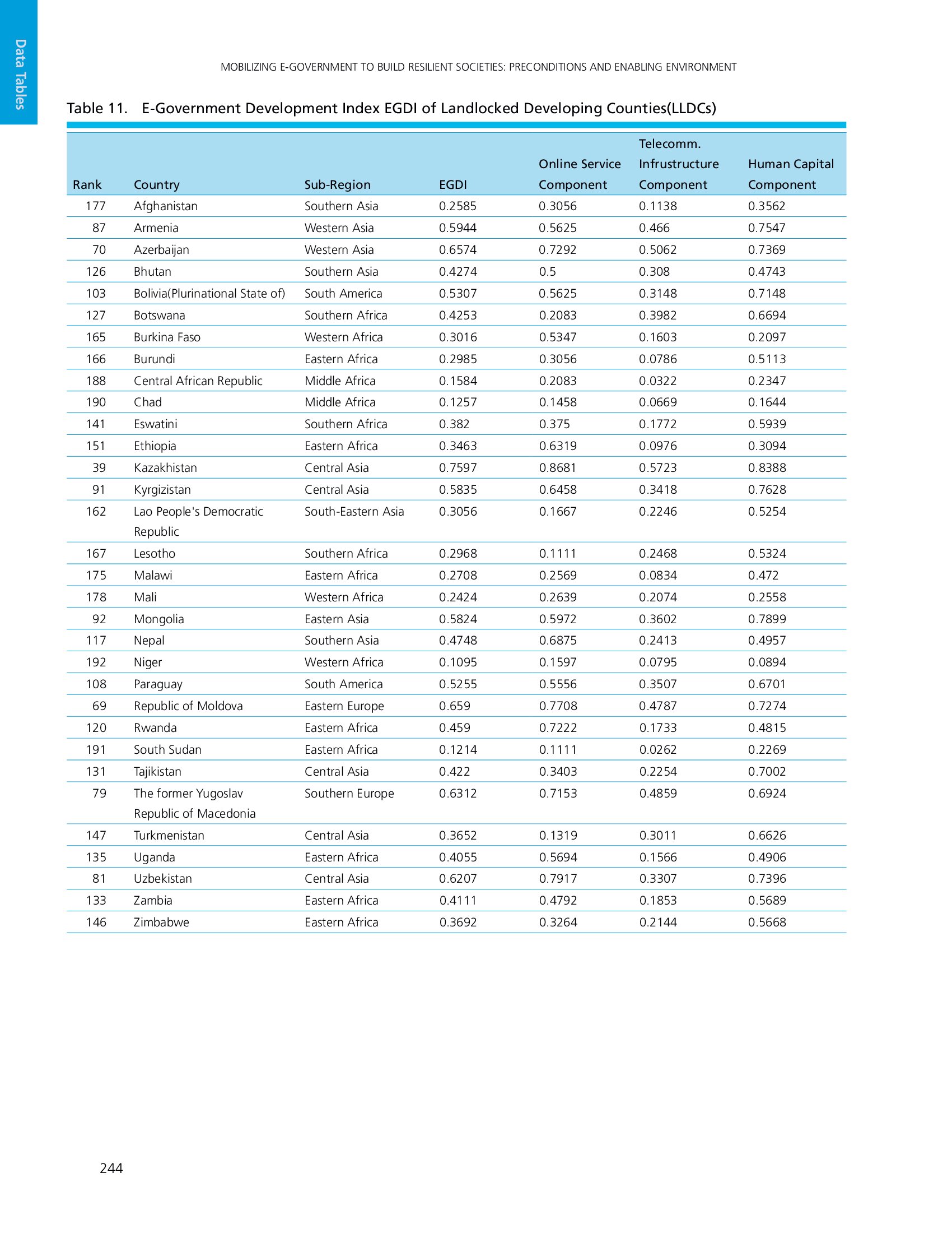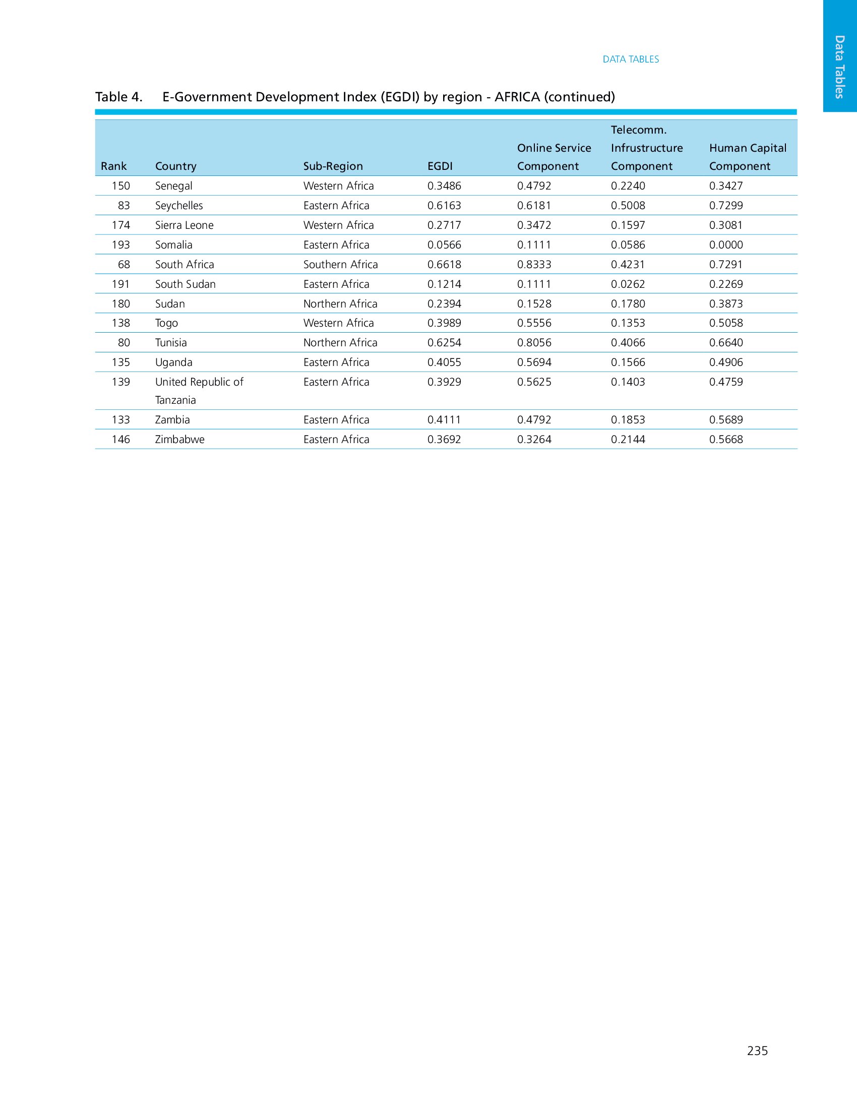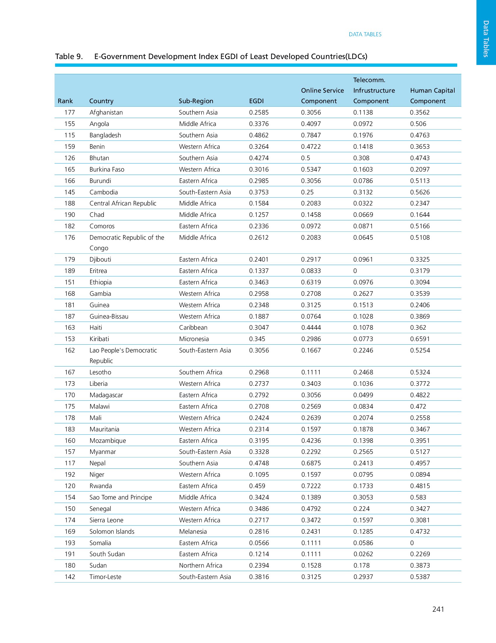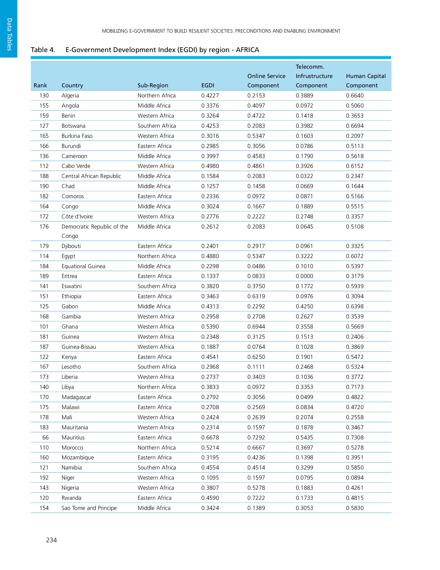 非洲54个国家中只有4个国家的得分高于世界平均EGDI,还有14个国家的EGDI得分低于0.25。这些国家的收入也很低,在政府发展分配必要资源方面可能面临限制。