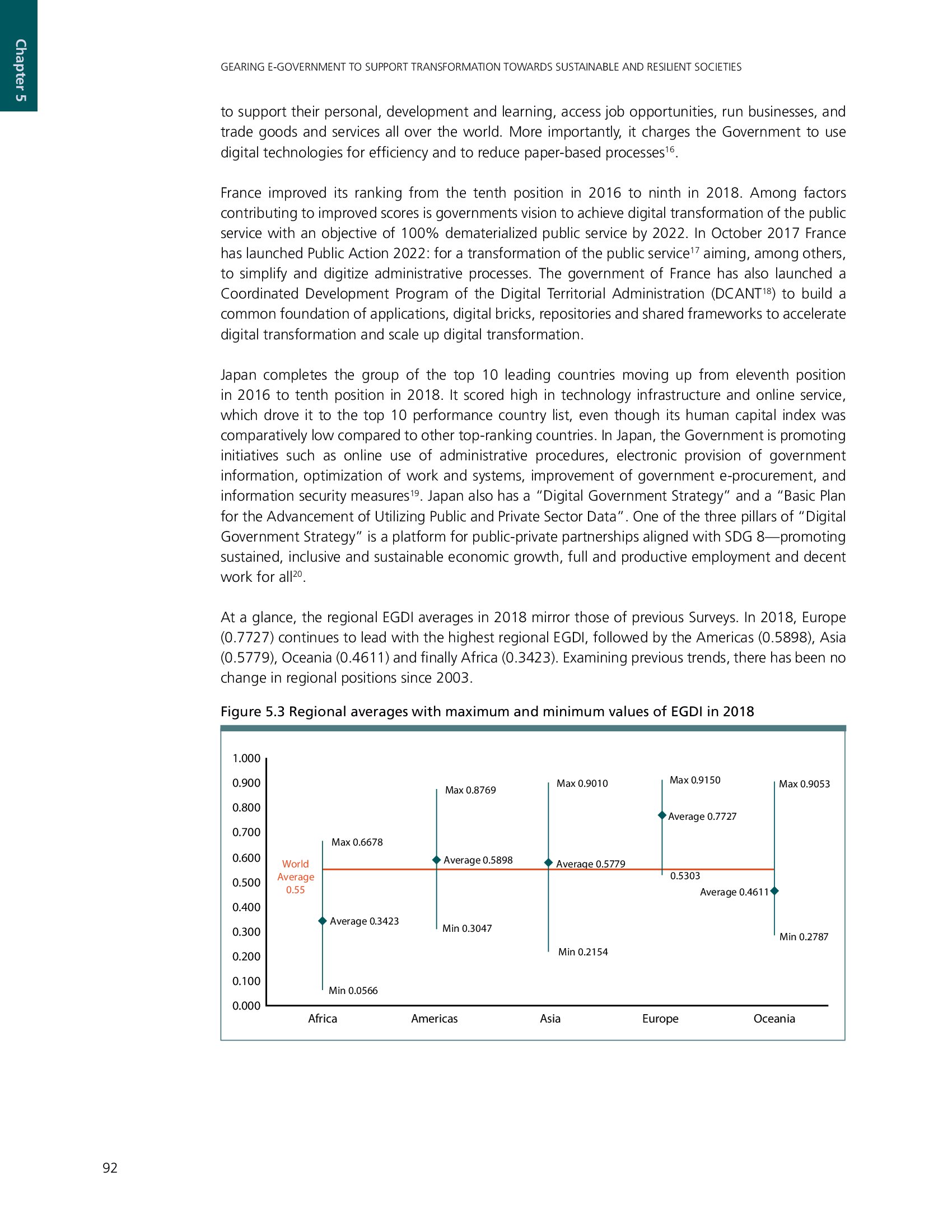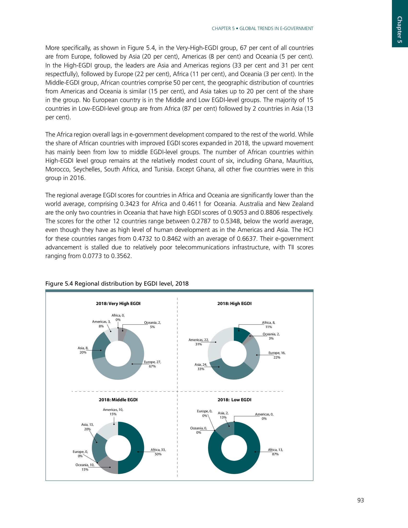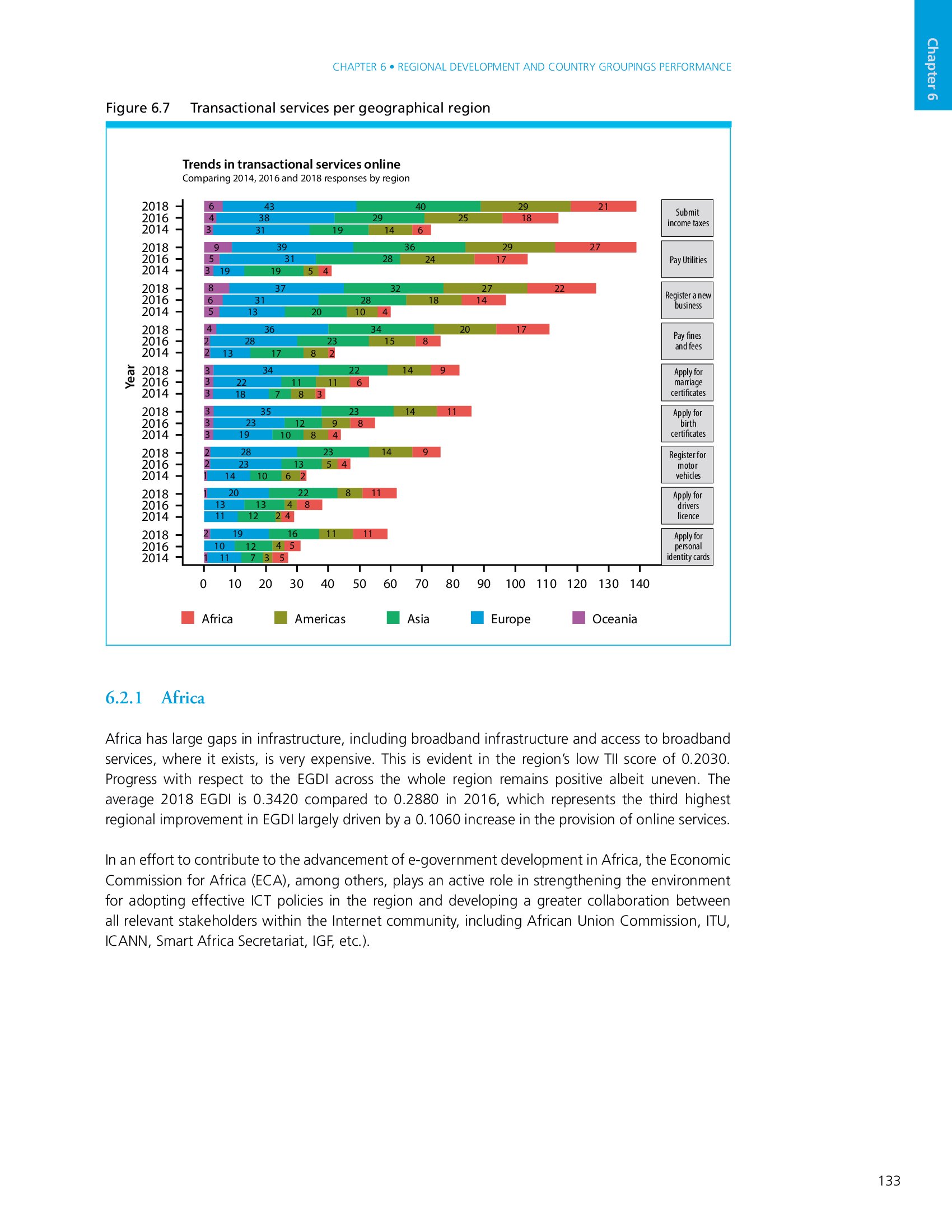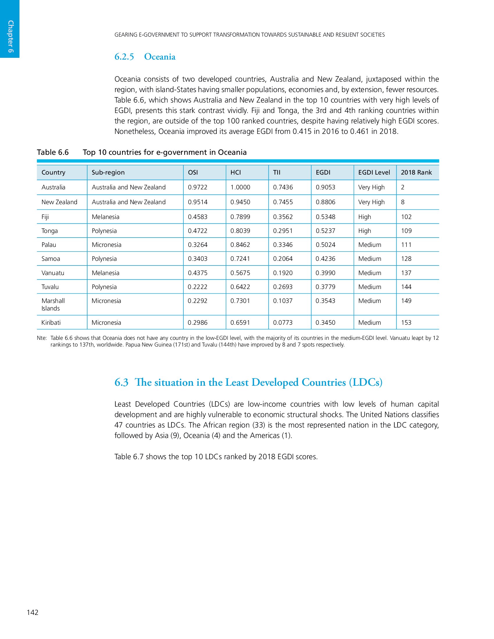 非洲和大洋洲地区的国家的政府发展水平差异也很大。澳大利亚和新西兰是大洋洲仅有的两个电子政务发达国家,EGDI分别为0.9053和0.8806。其他12个国家的得分介于0.2787和0.5348之间,低于世界平均水平。
