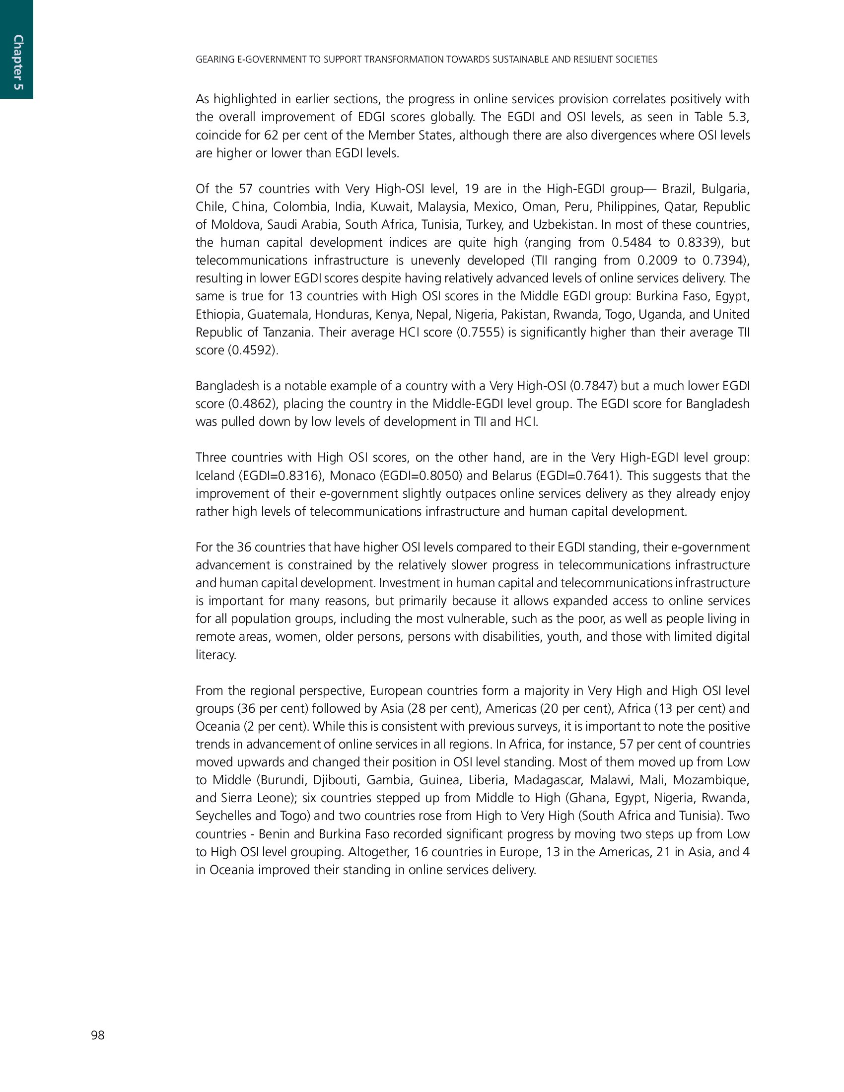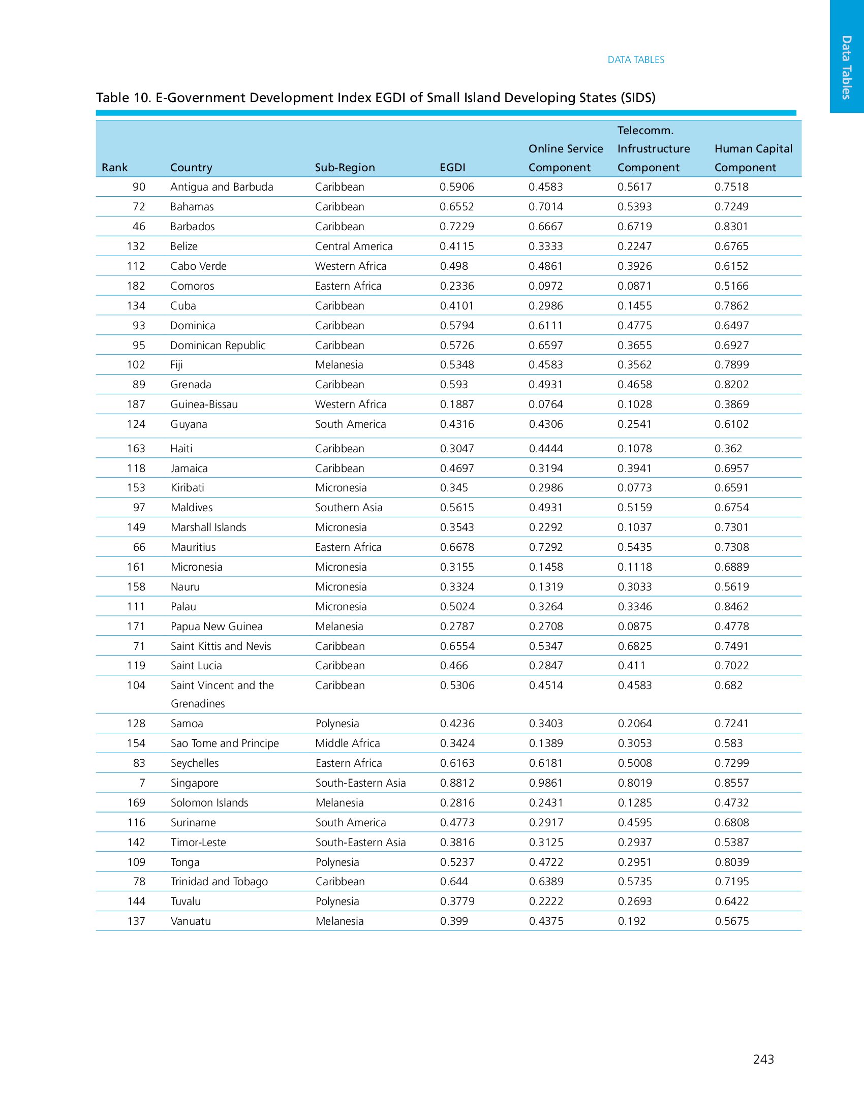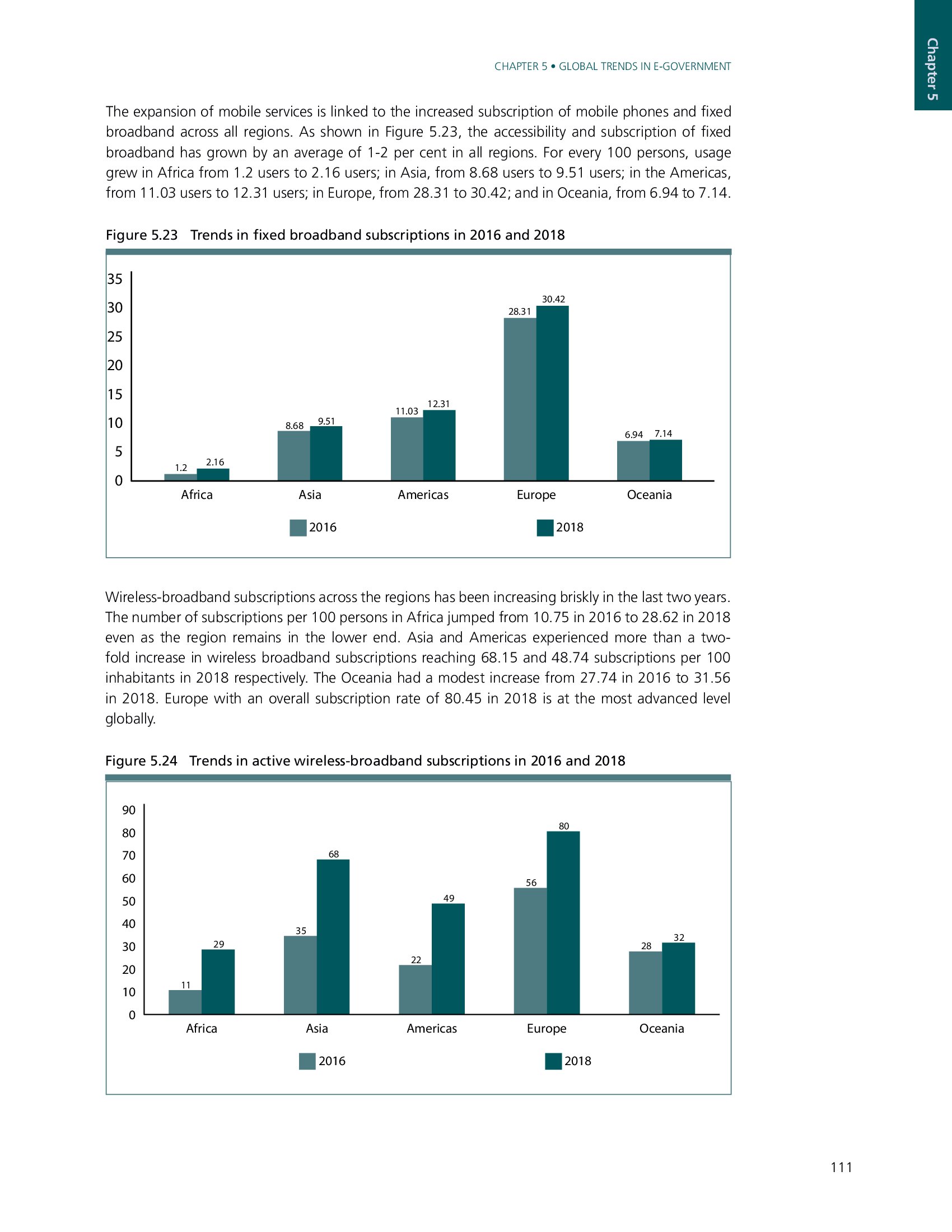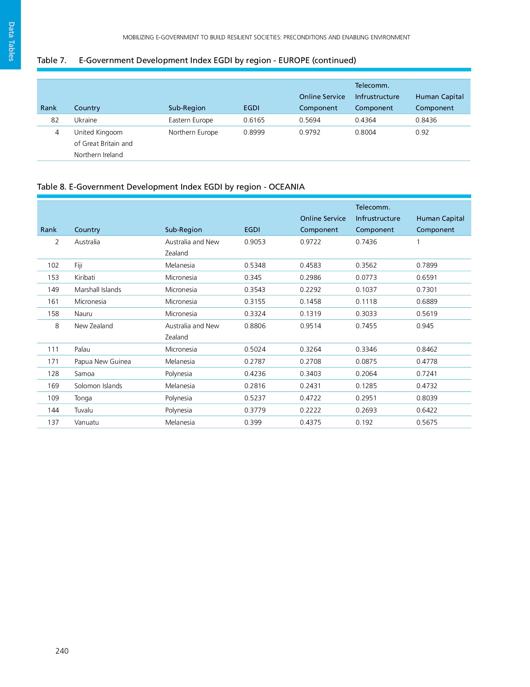 非洲和大洋洲地区的国家的政府发展水平差异也很大。澳大利亚和新西兰是大洋洲仅有的两个电子政务发达国家,EGDI分别为0.9053和0.8806。其他12个国家的得分介于0.2787和0.5348之间,低于世界平均水平。
