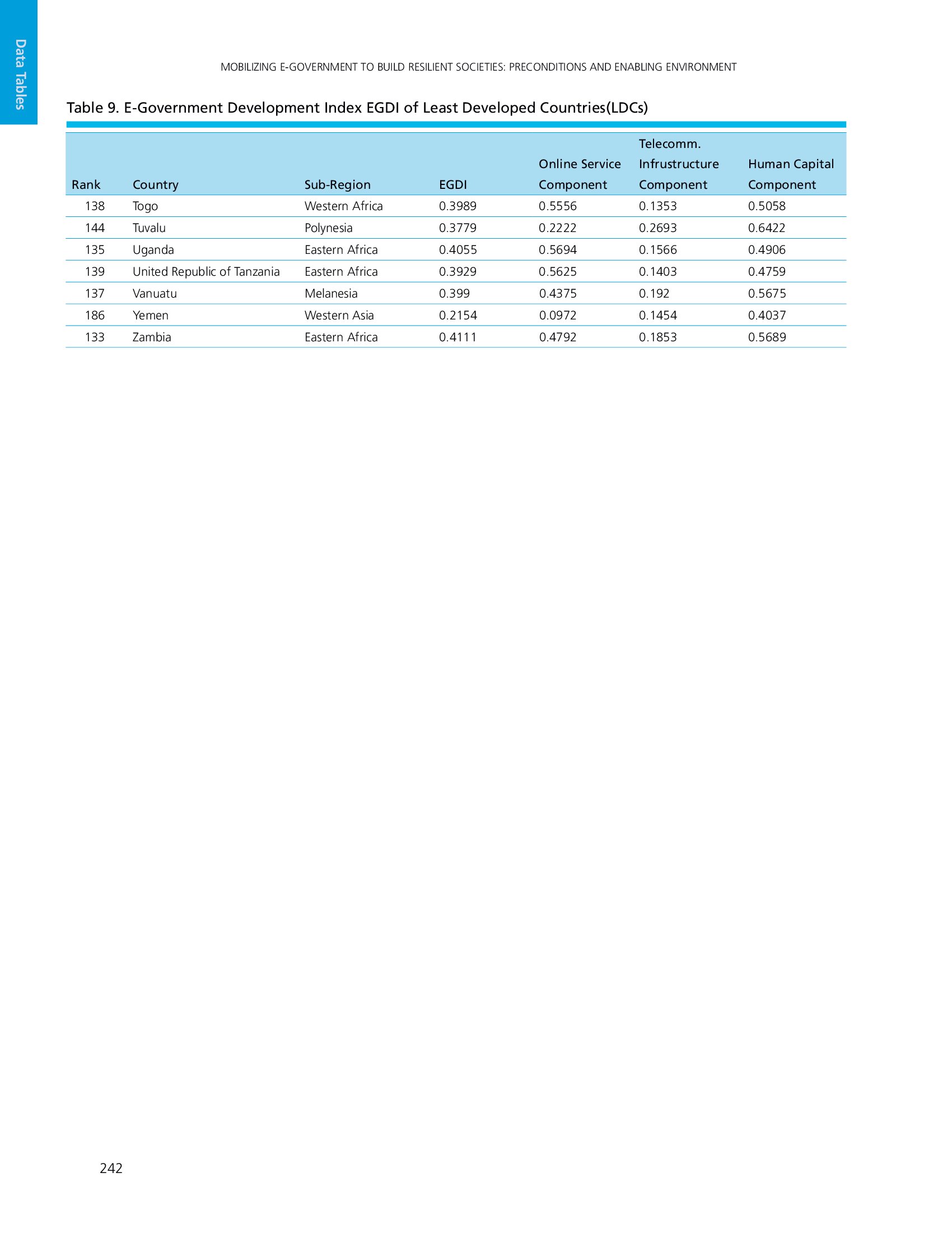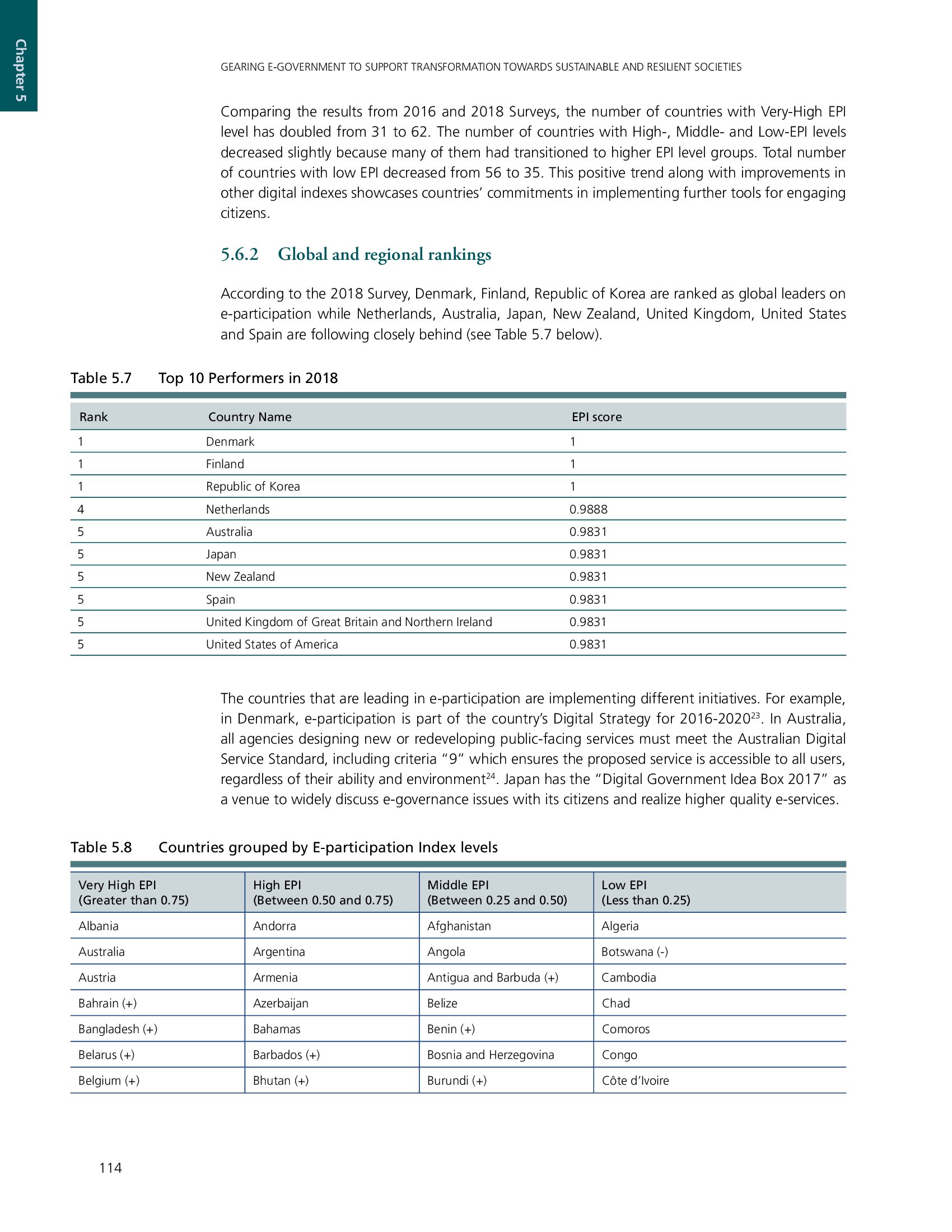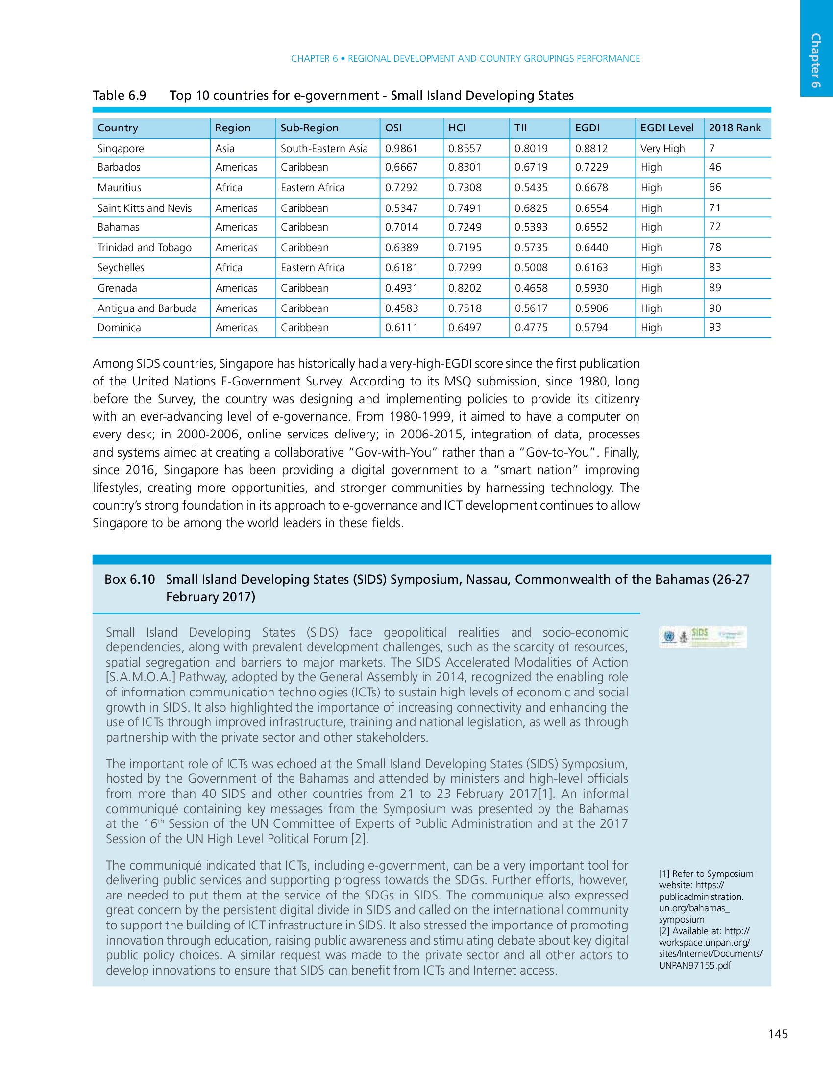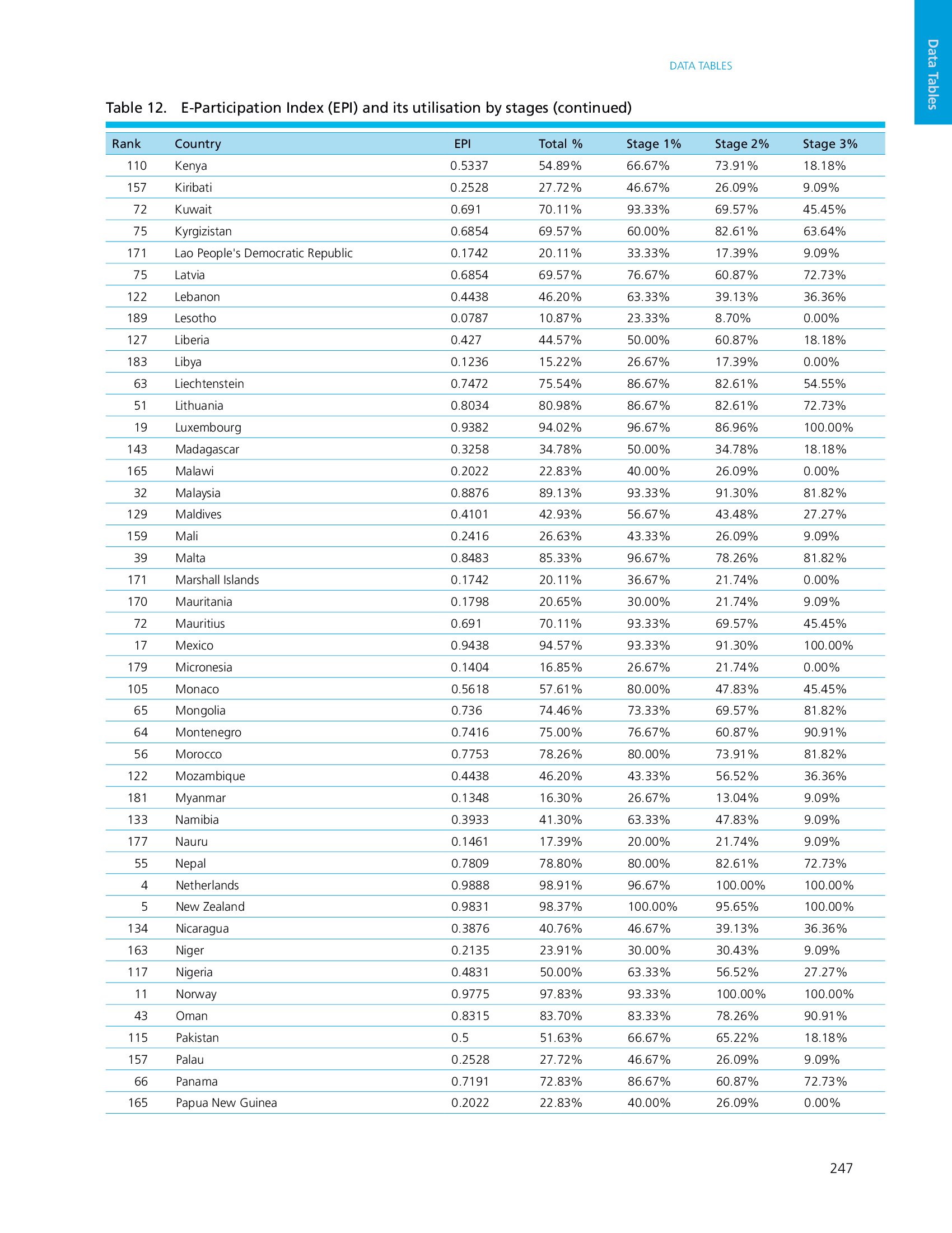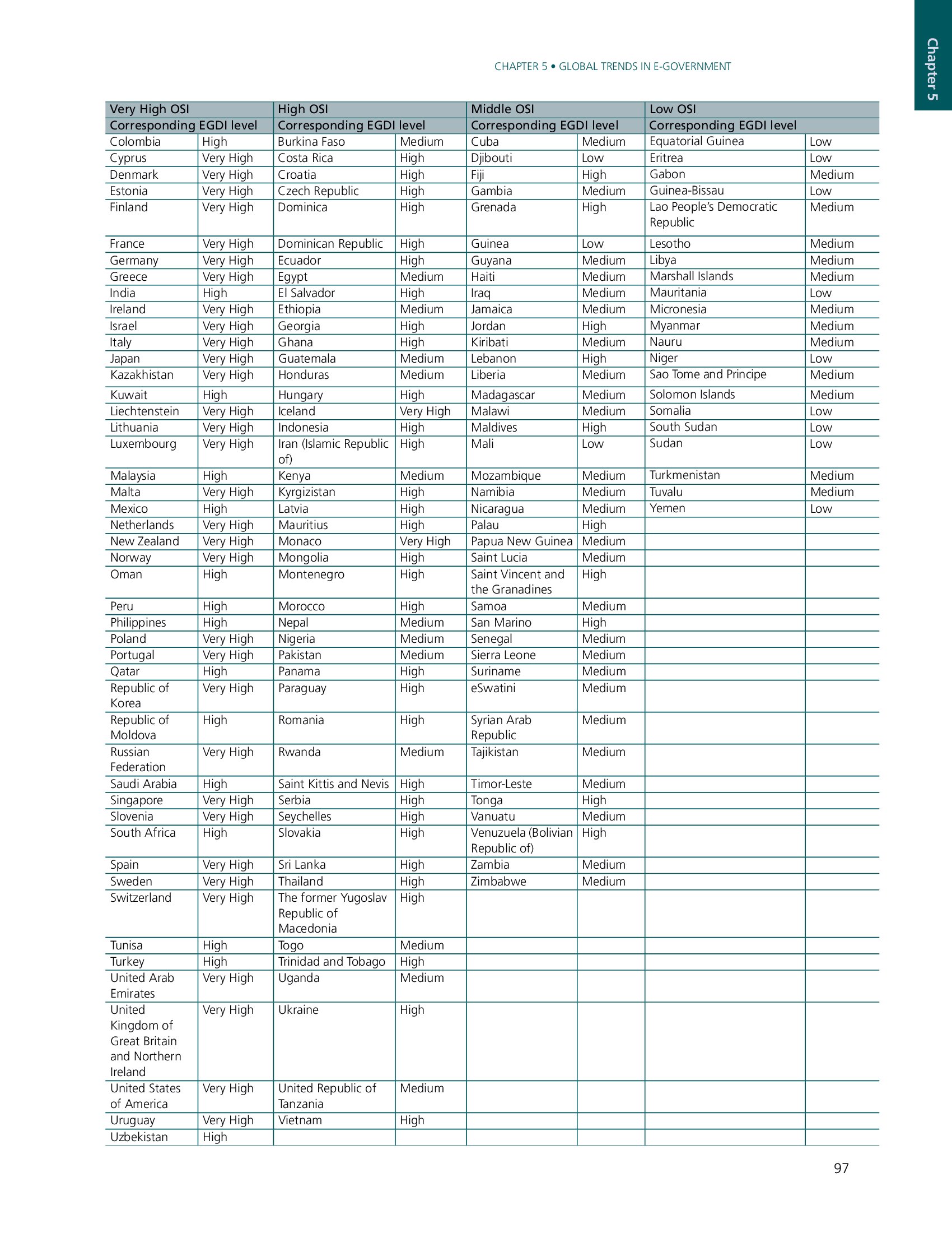 非洲和大洋洲地区的国家的政府发展水平差异也很大。澳大利亚和新西兰是大洋洲仅有的两个电子政务发达国家,EGDI分别为0.9053和0.8806。其他12个国家的得分介于0.2787和0.5348之间,低于世界平均水平。