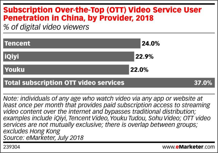 根据eMarketer最新的市场份额估算数据,腾讯视频是中国OTT订阅视频市场的领头羊,百度旗下的爱奇艺和阿里巴巴旗下的优酷紧随其后而且彼此势均力敌。